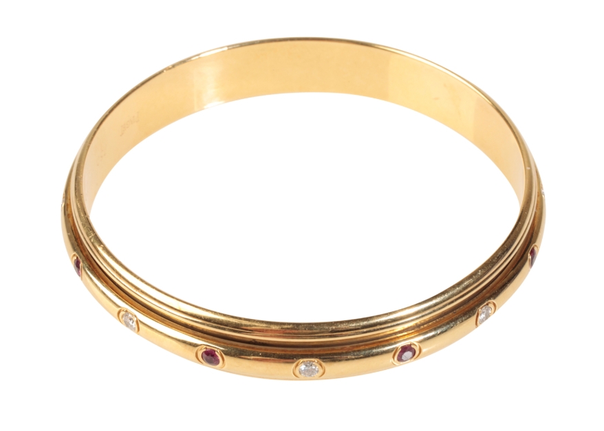 PIAGET; A YELLOW GOLD DIAMOND AND RUBY POSESSION BANGLE, the center rotating section, set with brilliant-cut diamonds and rubies, the interior stamped " Piaget 750 F00821 62.5 1991", interior diameter 6.2cm, in a fitted presentation case