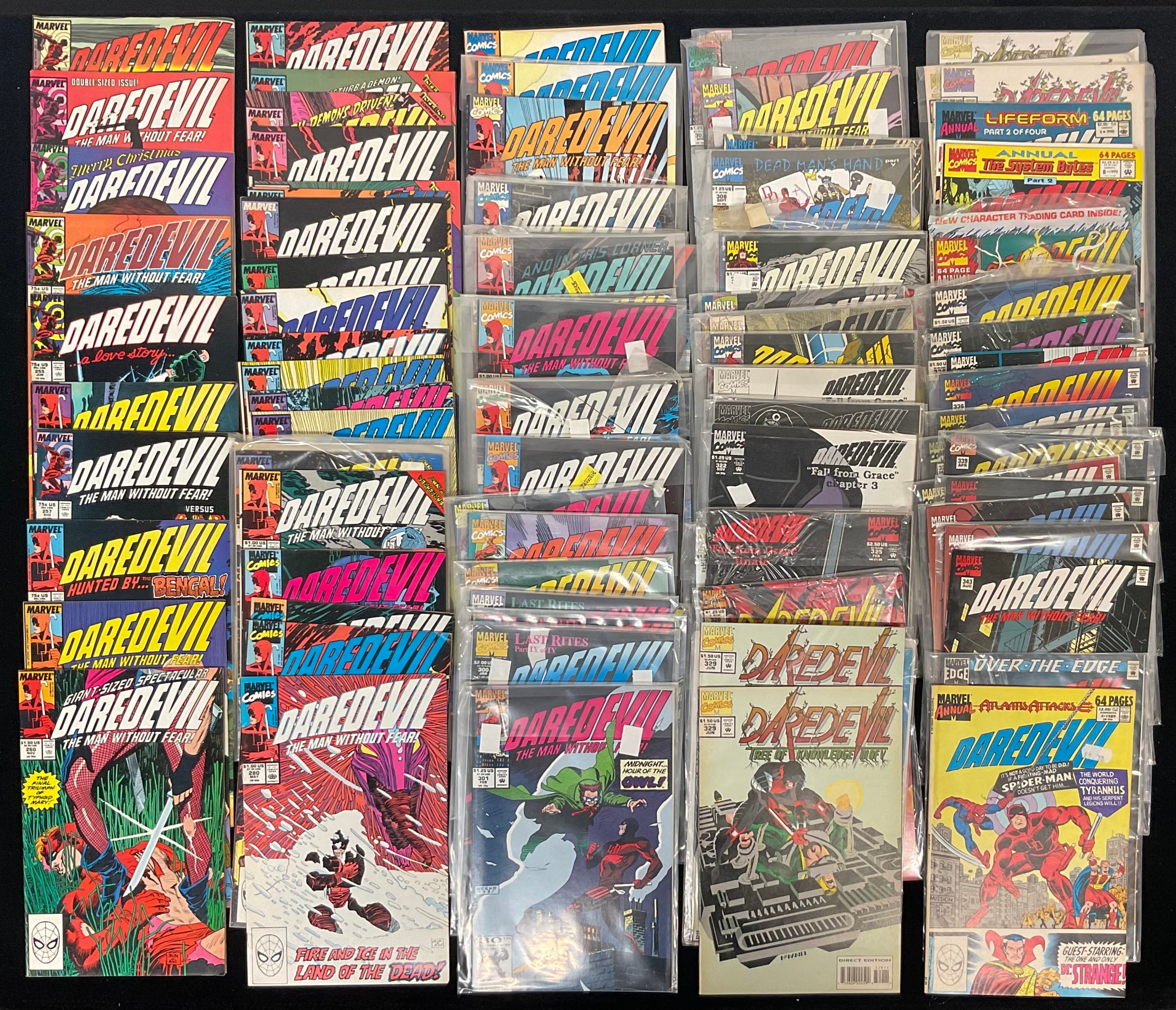 Daredevil #251-343 (1987-1995). 1st appearance of Typhoid Mary, Bengal, Blackheart, Shotgun, 1st cover appearance of Calypso. Some duplicates. Qty