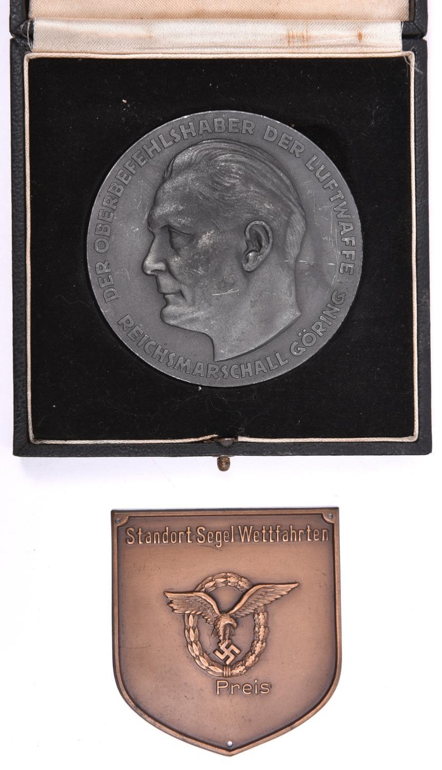 A Third Reich bronzed Reichs Marshall Goring plaque for Technical Service in the Luftwaffe, 75mm diameter, in its fitted case of issue; a bronzed Luftwaffe shield “Standort Segel Wettfahrten”. Both VGC £80-120