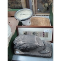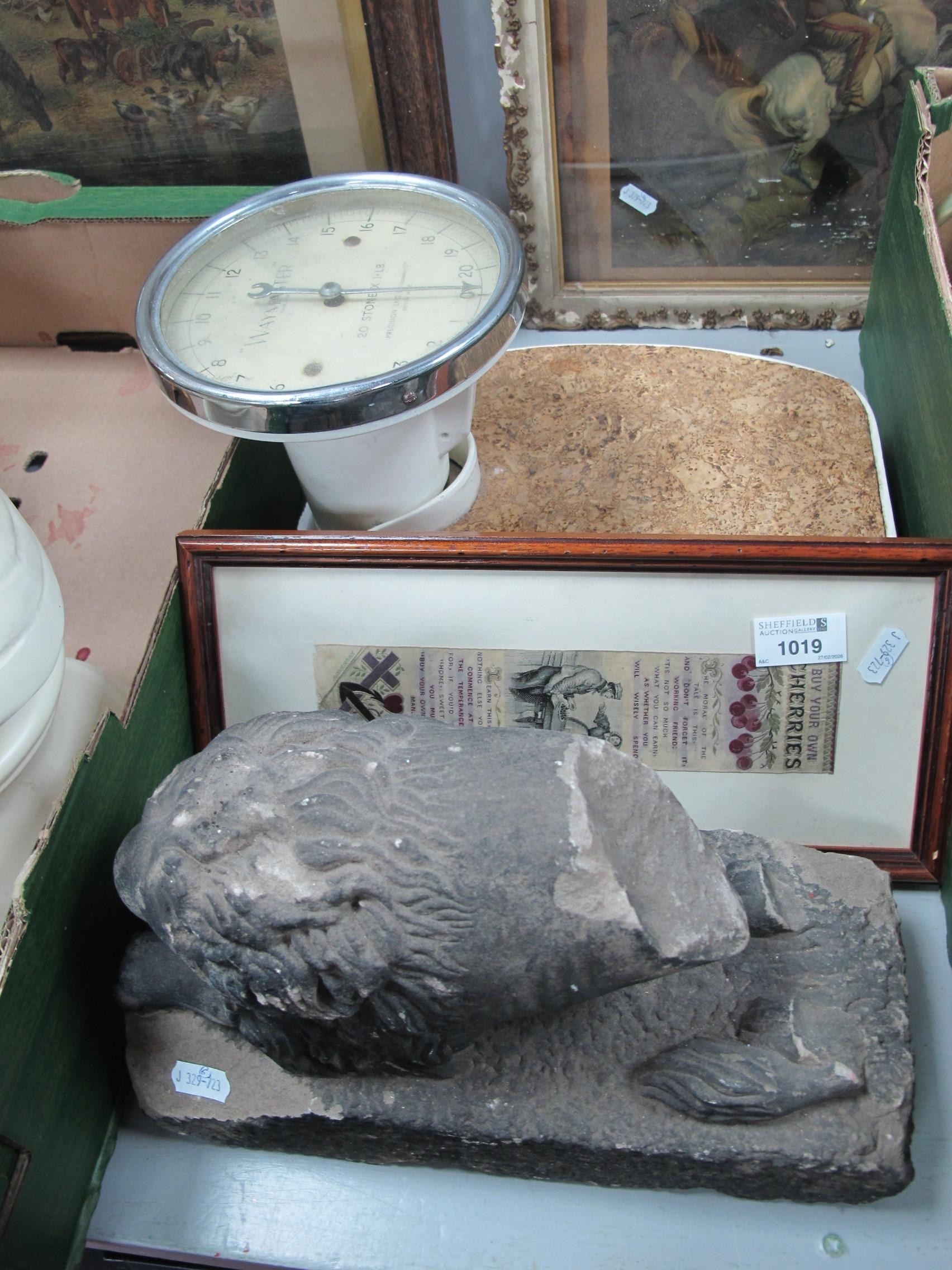 Carved Stone Figure of a Lion (back absent) on plinth, 29cm long, scales, three prints, silk 'cherries' bookmark. (6).