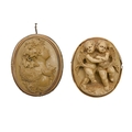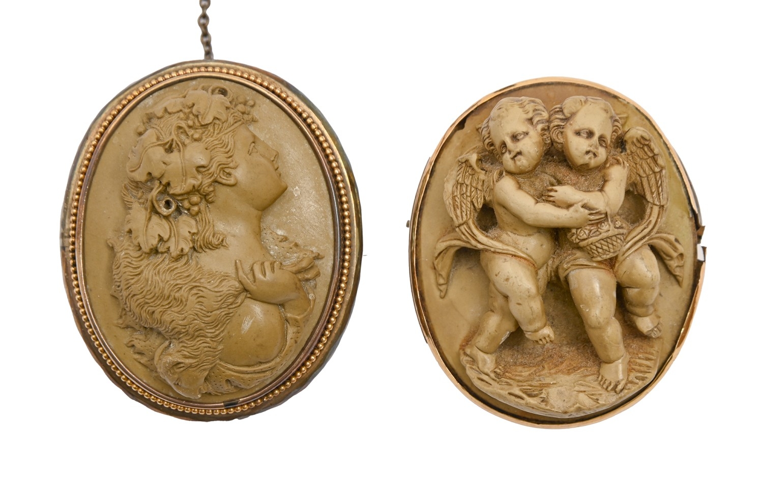 Two lava cameos, 19th c, one mounted in gold, 49 and 51mm h