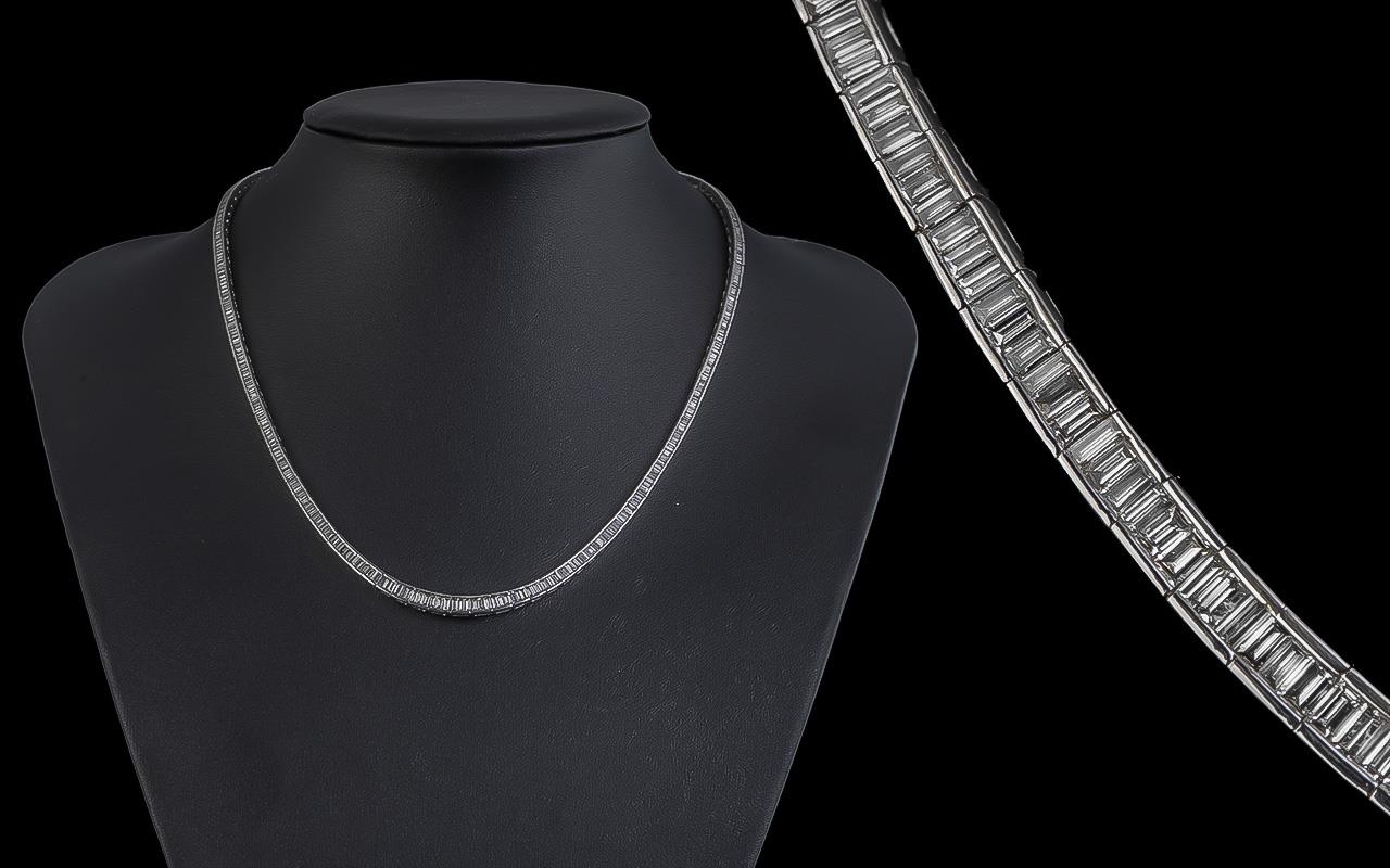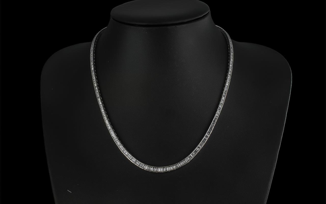 Ladies Contemporary Design 18ct White Gold Channel Set Diamond Necklace of superior quality, marked 18ct; the natural baguette cut diamonds of excellent colour and clarity, diamond weight 7.07cts, marked to necklace, overall weight 33g, superb condition