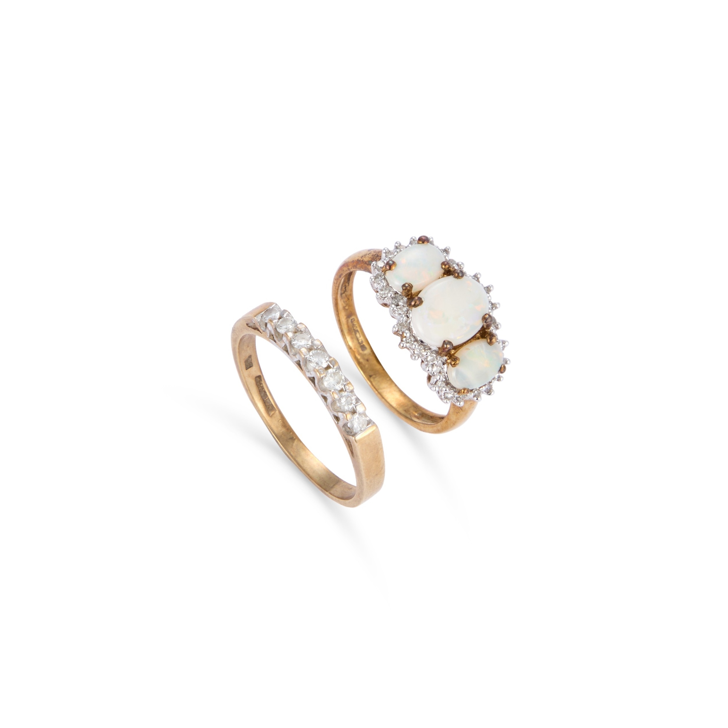 comprising a three stone opal and diamond cluster ring, hallmarked; together with a seven stone diamond ring, hallmarked. (2) Ring sizes K1/2 and O1/2, 4.1 grams gross