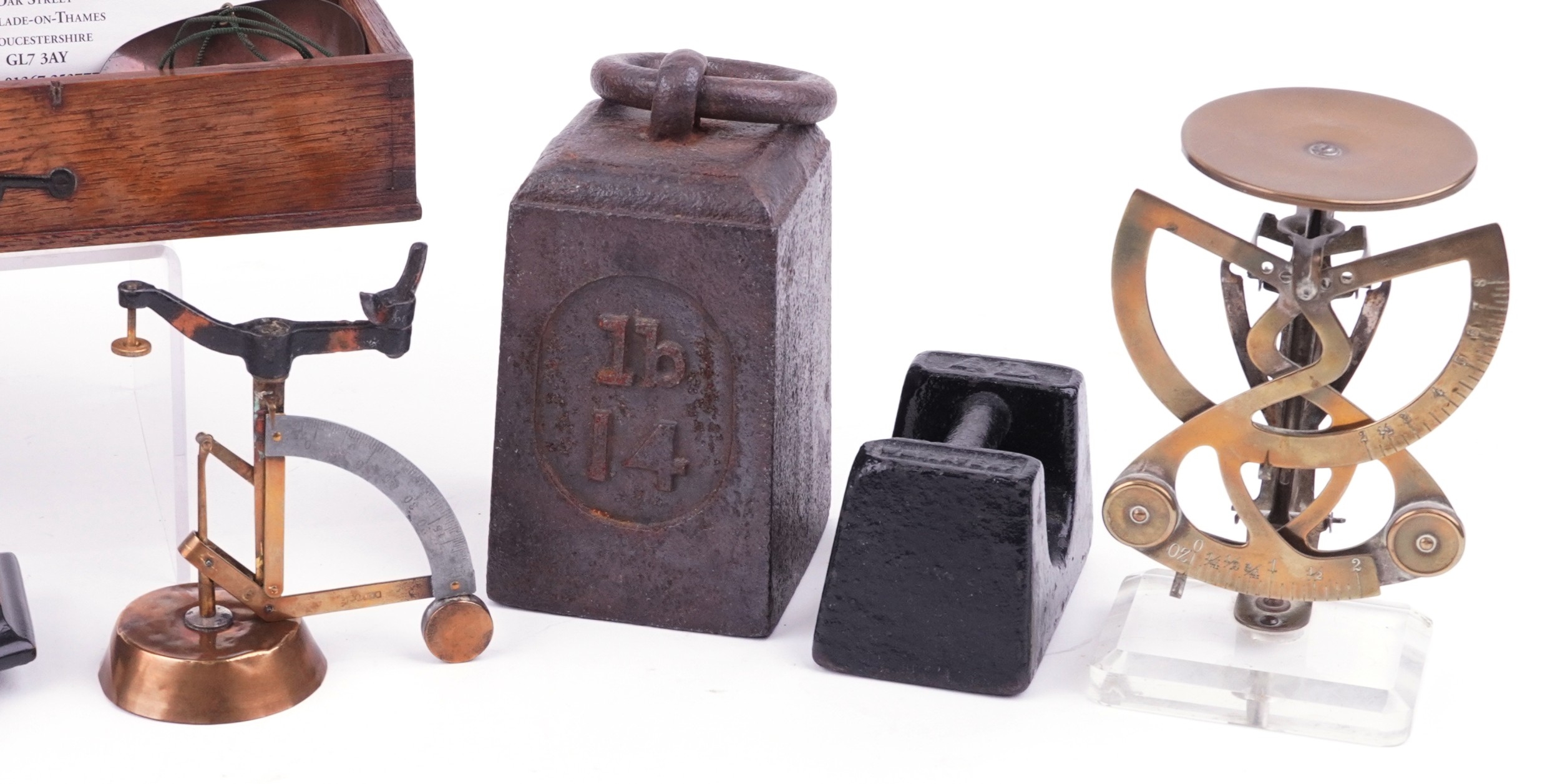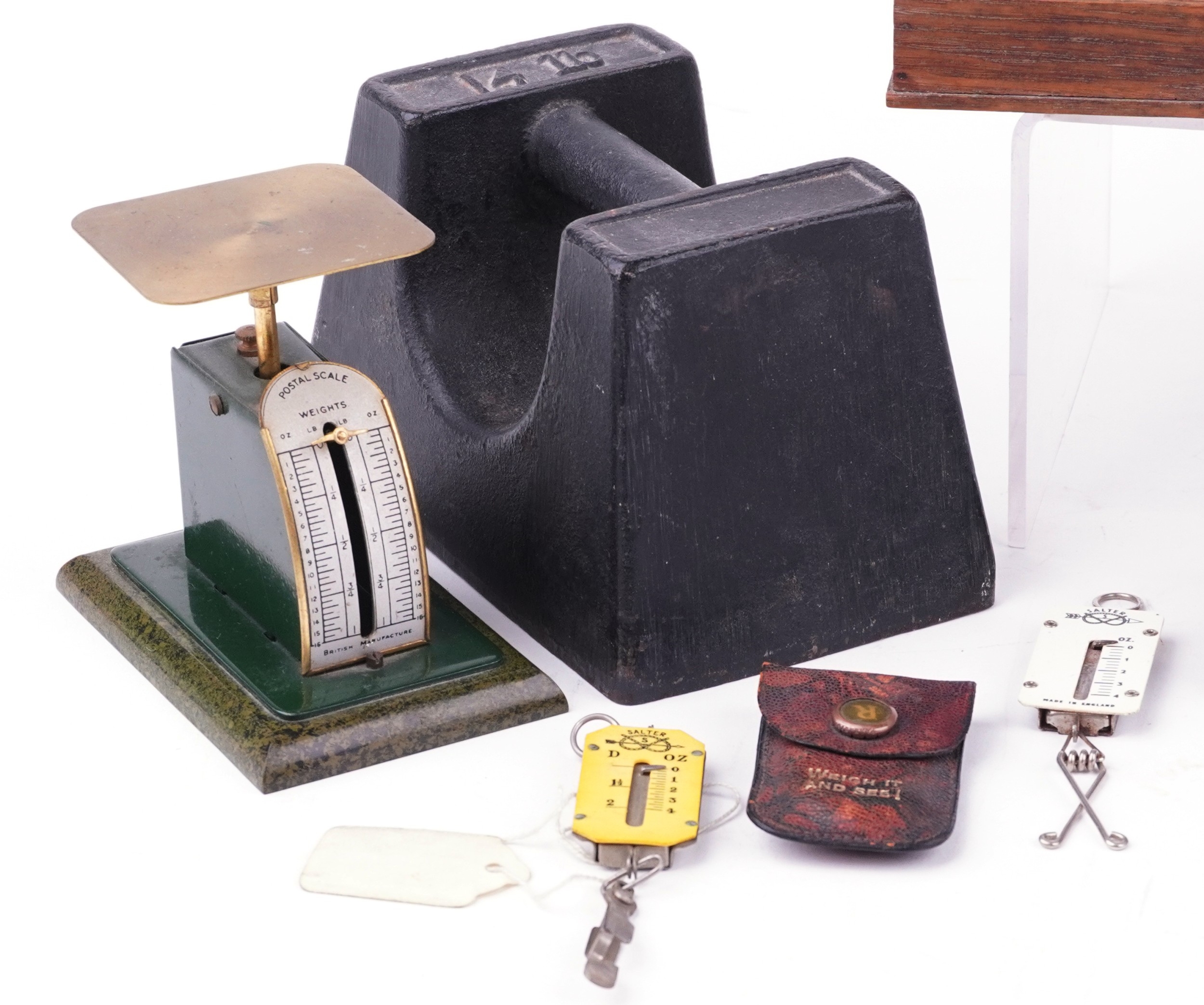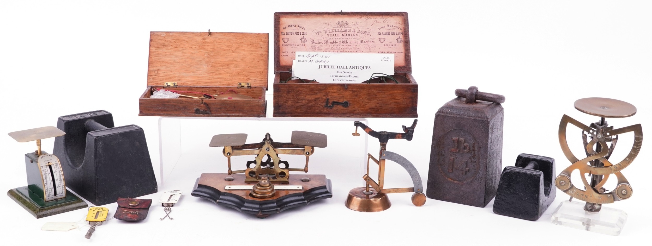A collection of antique and later postage scales and weights including Moore & Co. and Williams & Sons, the largest 21cm in length.
