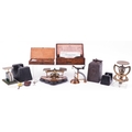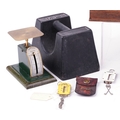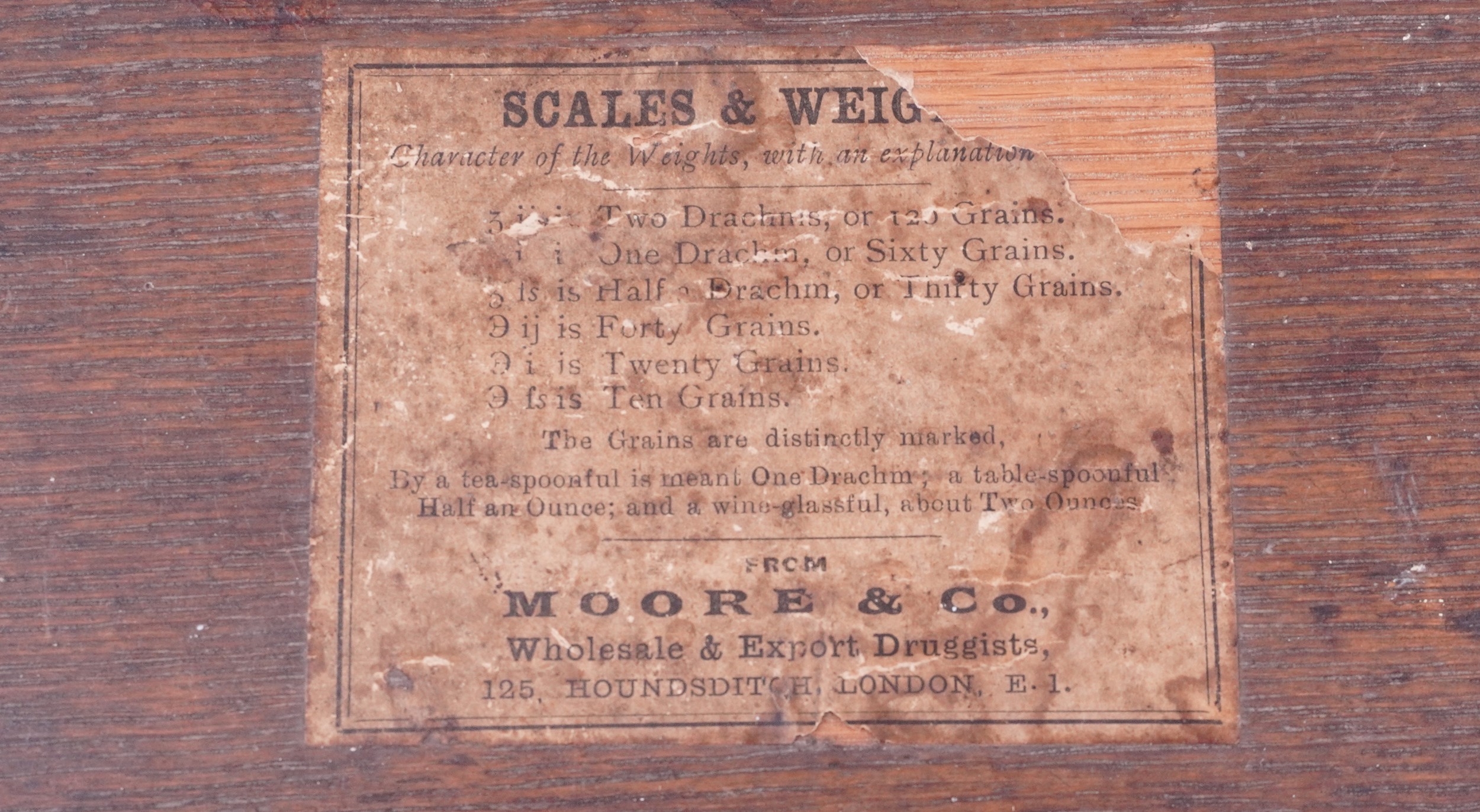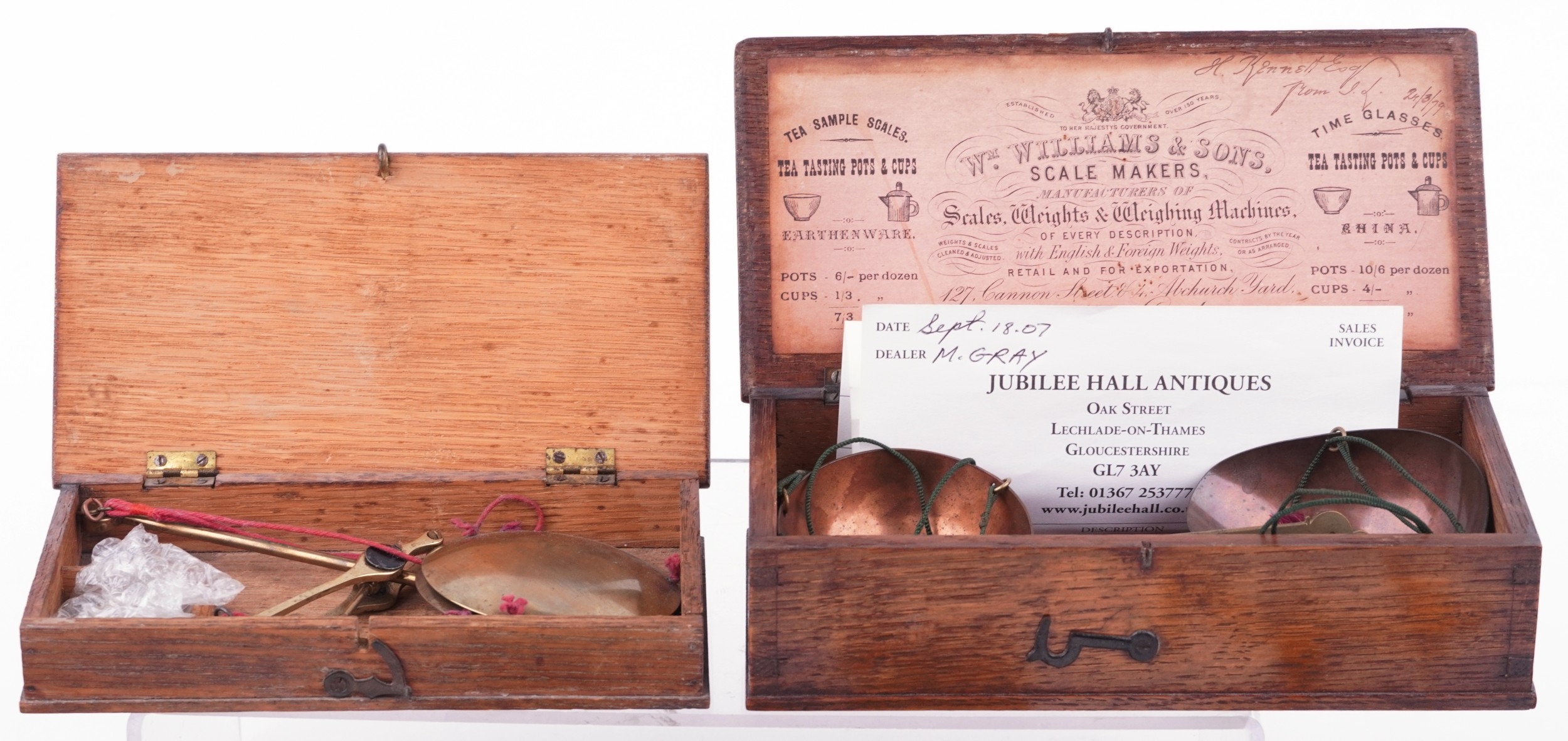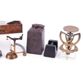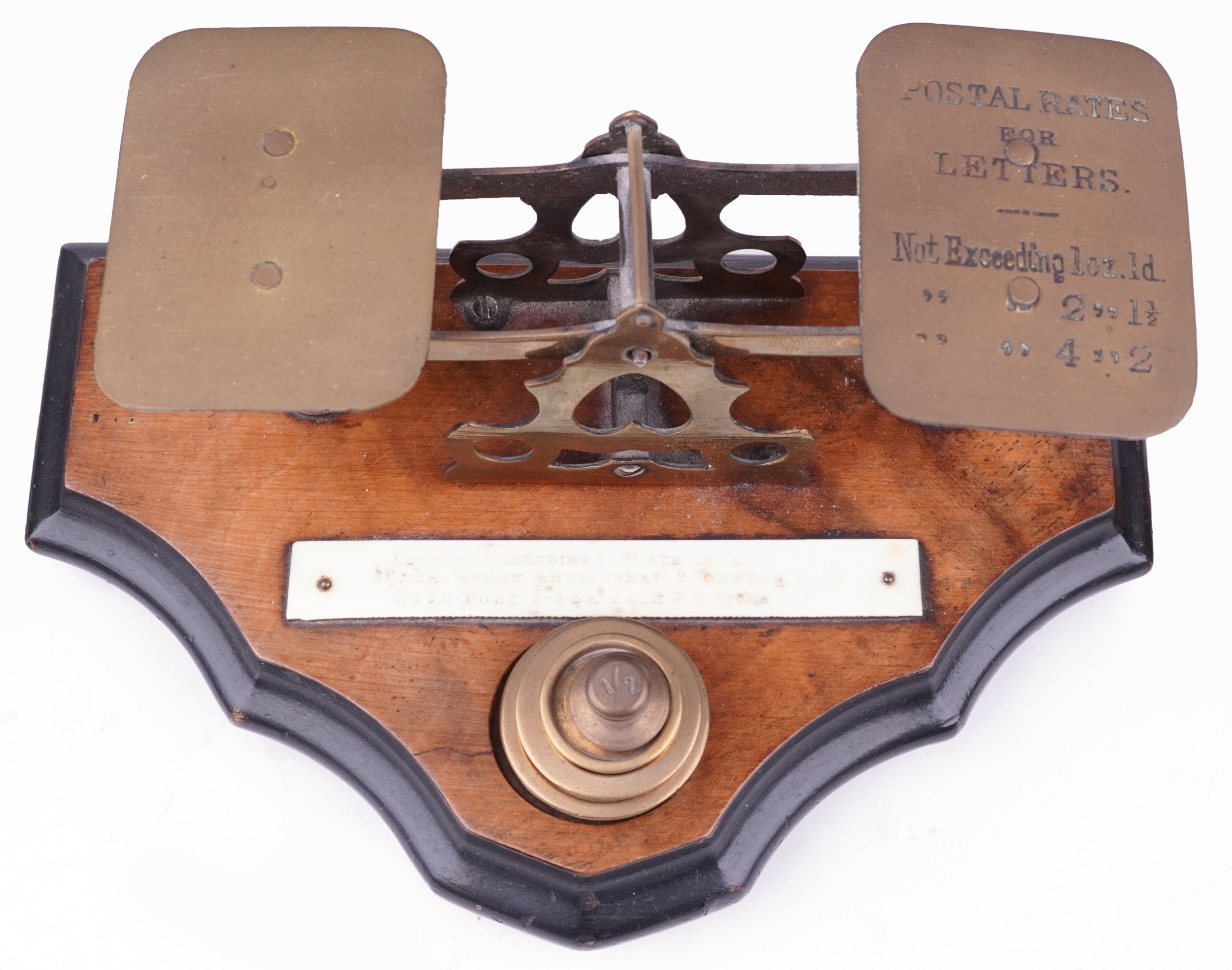 A collection of antique and later postage scales and weights including Moore & Co. and Williams & Sons, the largest 21cm in length.