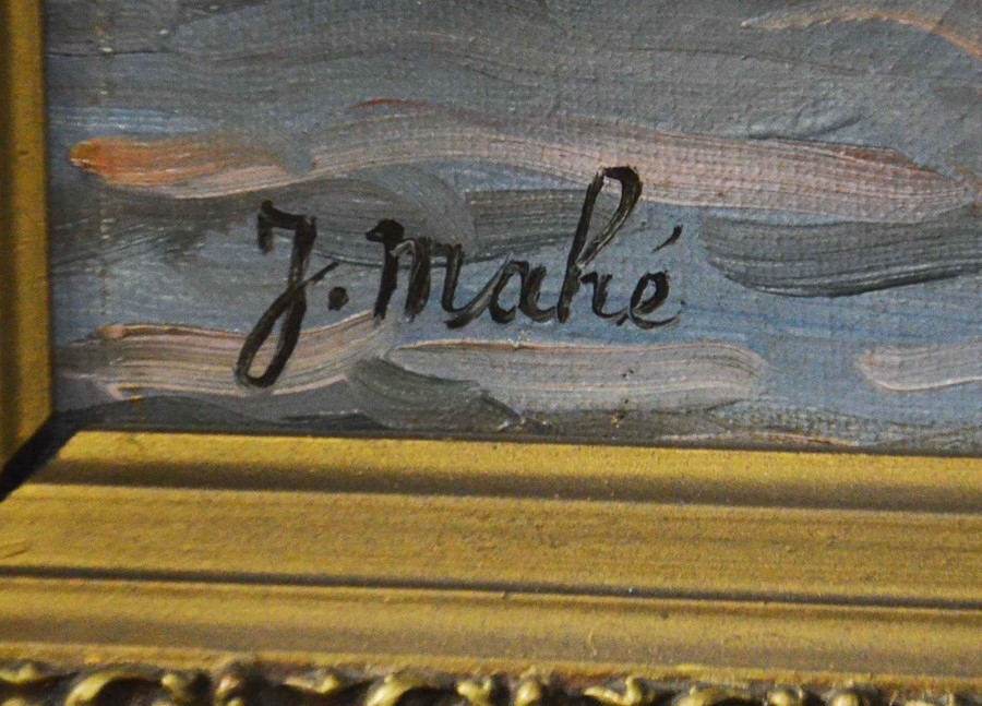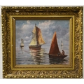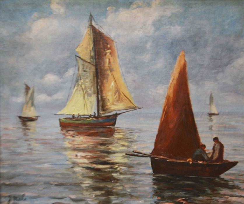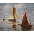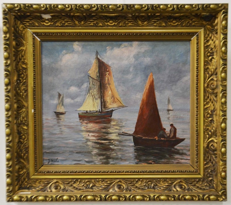 J. Mahe (20th century), Vessels in Calm Sea, oil on canvas, signed, 55cm x 45cm, framed