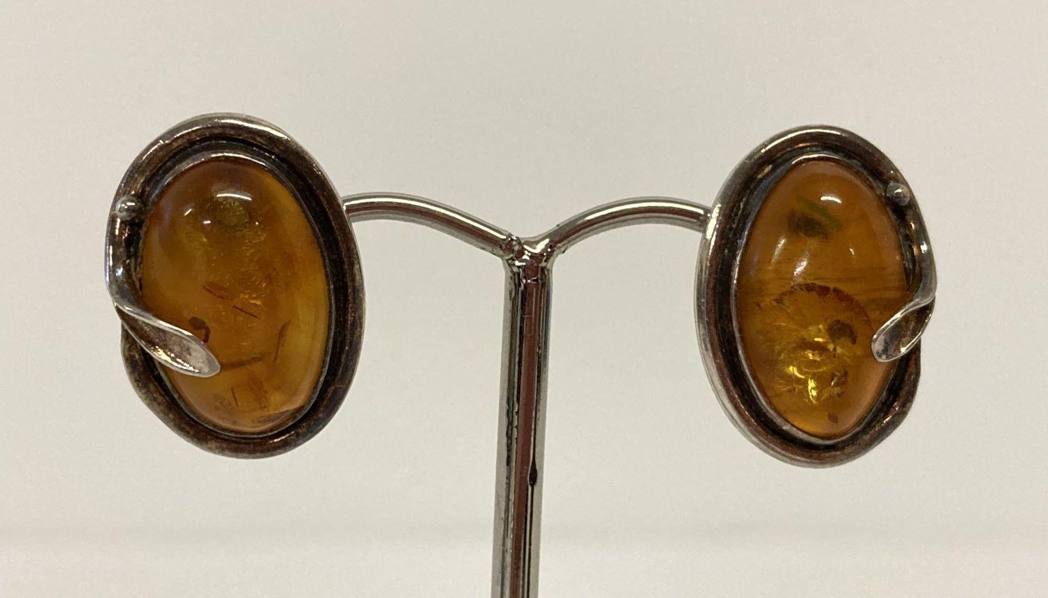 A pair of silver and amber stud style earrings with Art Nouveau style decoration. 925 and makers mark to reverse.