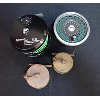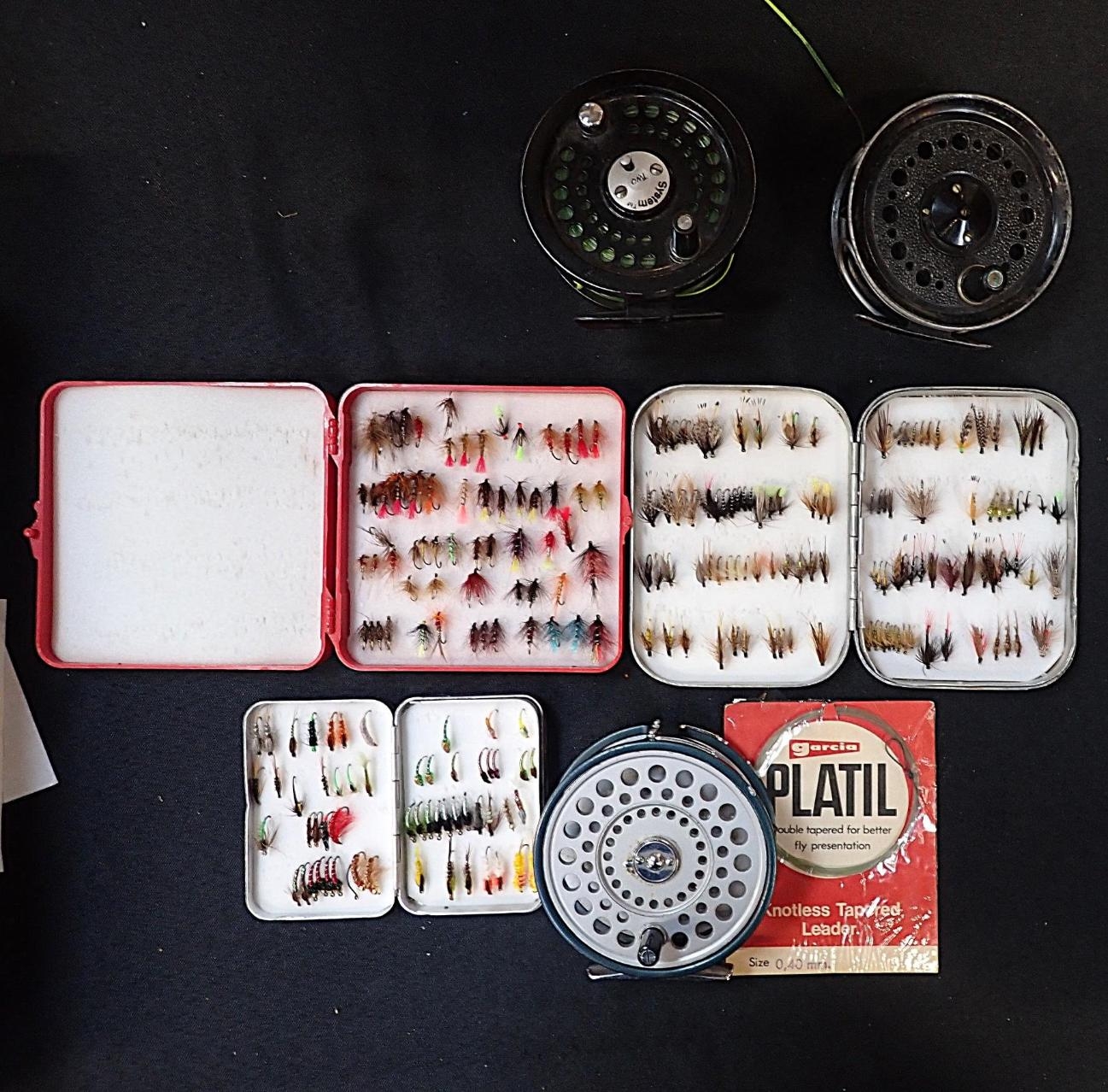 SCIENTIFIC ANGLERS: A SYSTEM 2 TROUT FLY REELtogether with two other fly reels, and three fly tins with various trout flies (6)