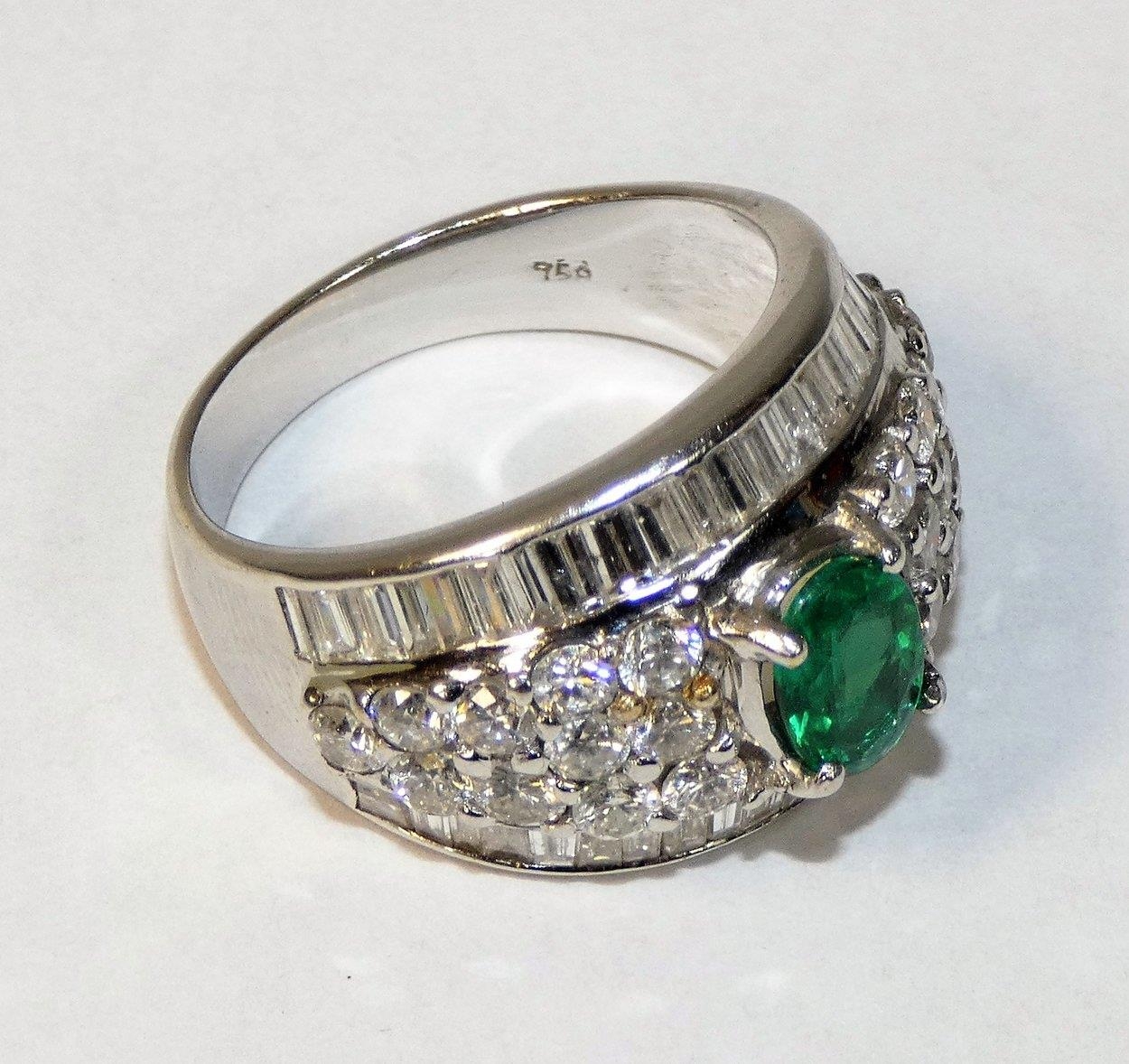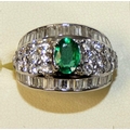 An 18ct white gold emerald and diamond dress ring, claw set with an oval mixed cut stone, weighing approximately 1 ct, bordered by brilliant and baguette cuts, total weight approximately 3 cts, size O.