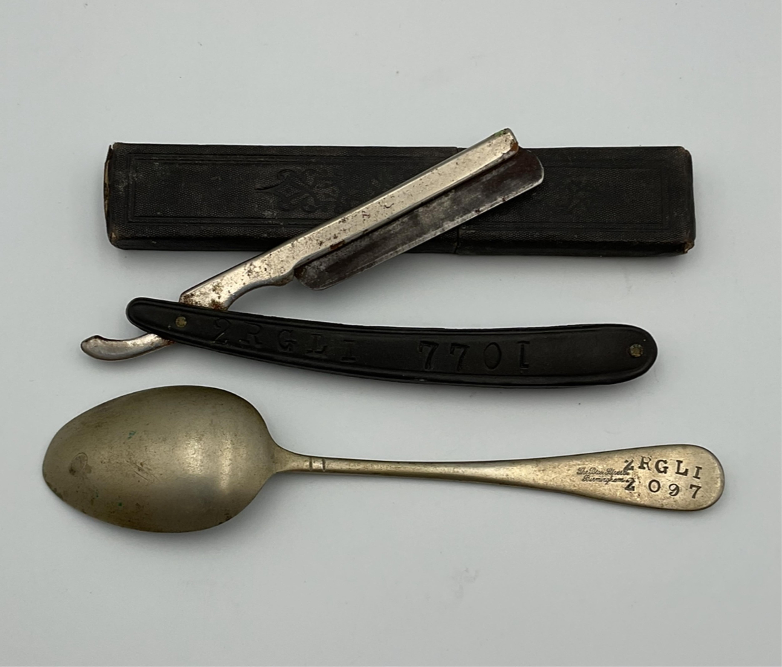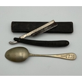 2nd Royal Guernsey Light Infantry - stamped and cased cut throat razor, the handle stamped 2 R G L I 7701, together with a dinner spoon stamped 2 R G L I 2097. (2)
