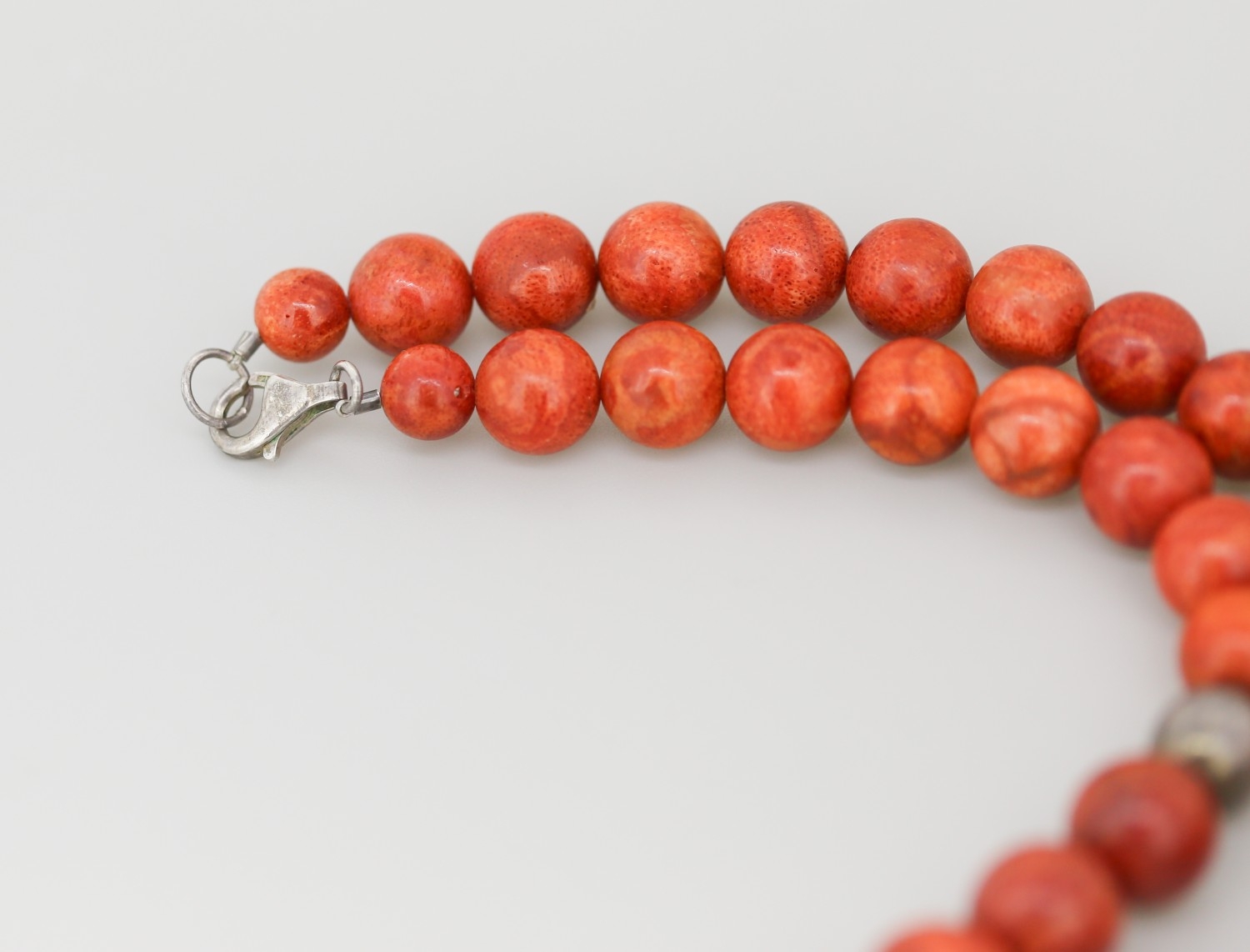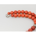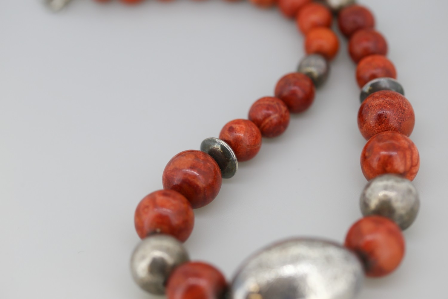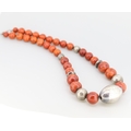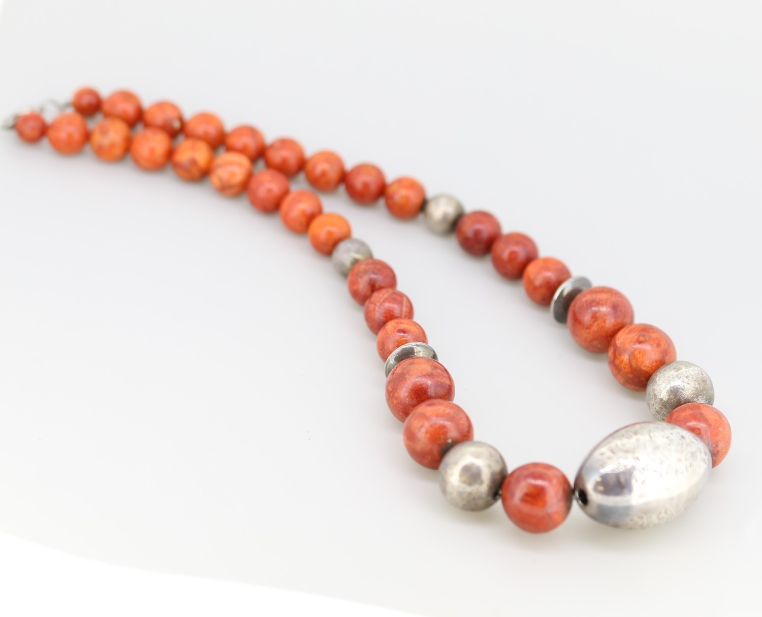 Coral and Silver Bead Graduated Form Necklace Incised Floral Motifs 45cm Long