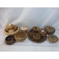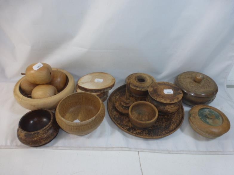Collection of treen to include Fruit bowl with apples, Bedroom set, coaters and other
