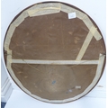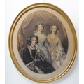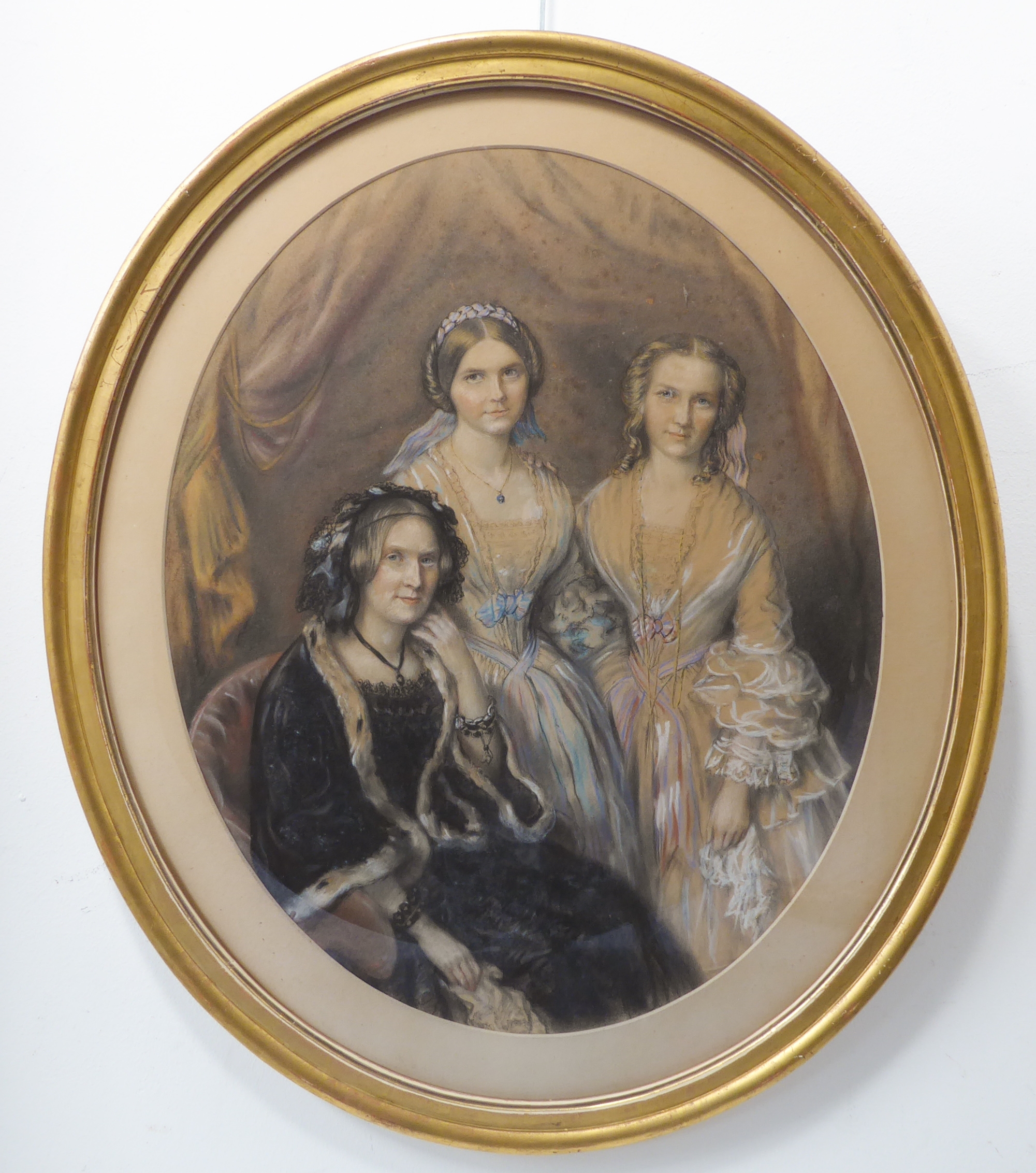Mid 19th century English School -- Triple three-quarter length portrait of a lady seated in an interior with her two daughters standing behind her, pastels, oval (19¾