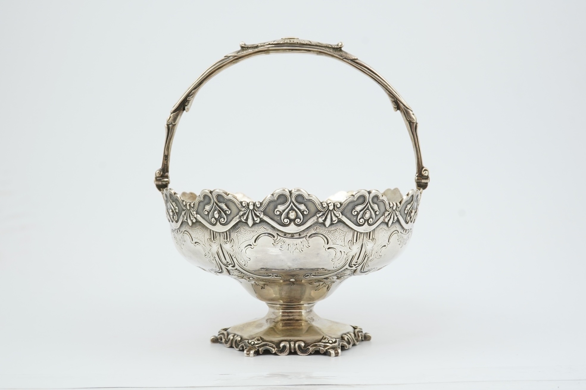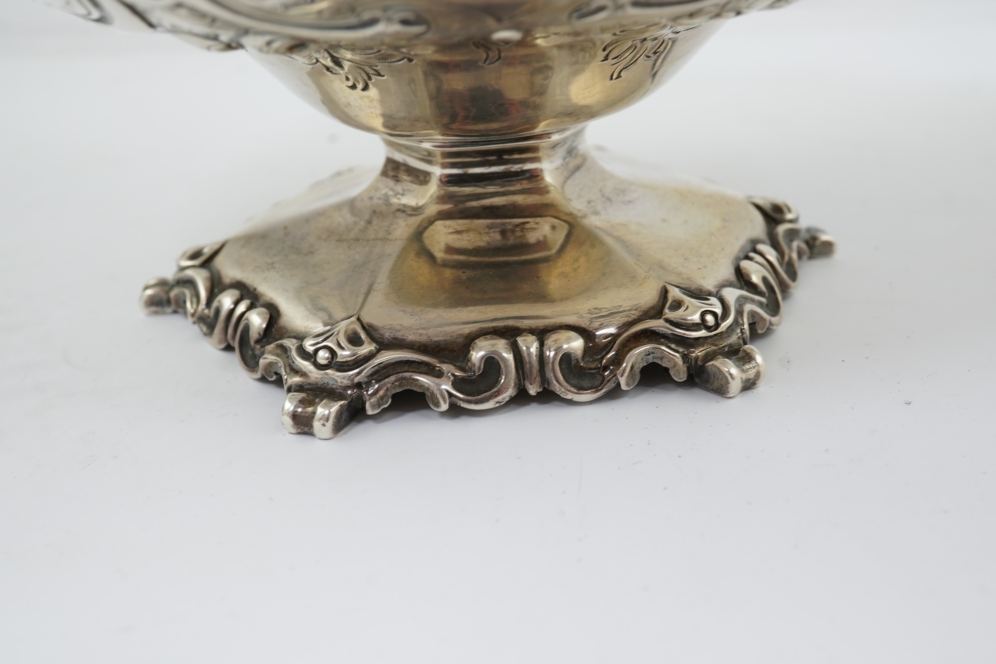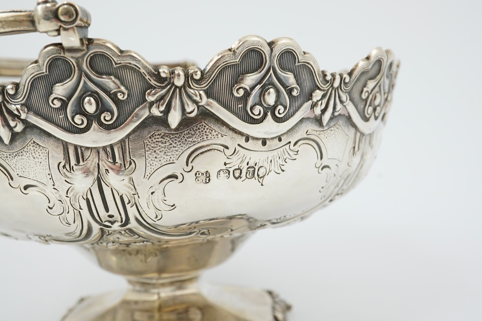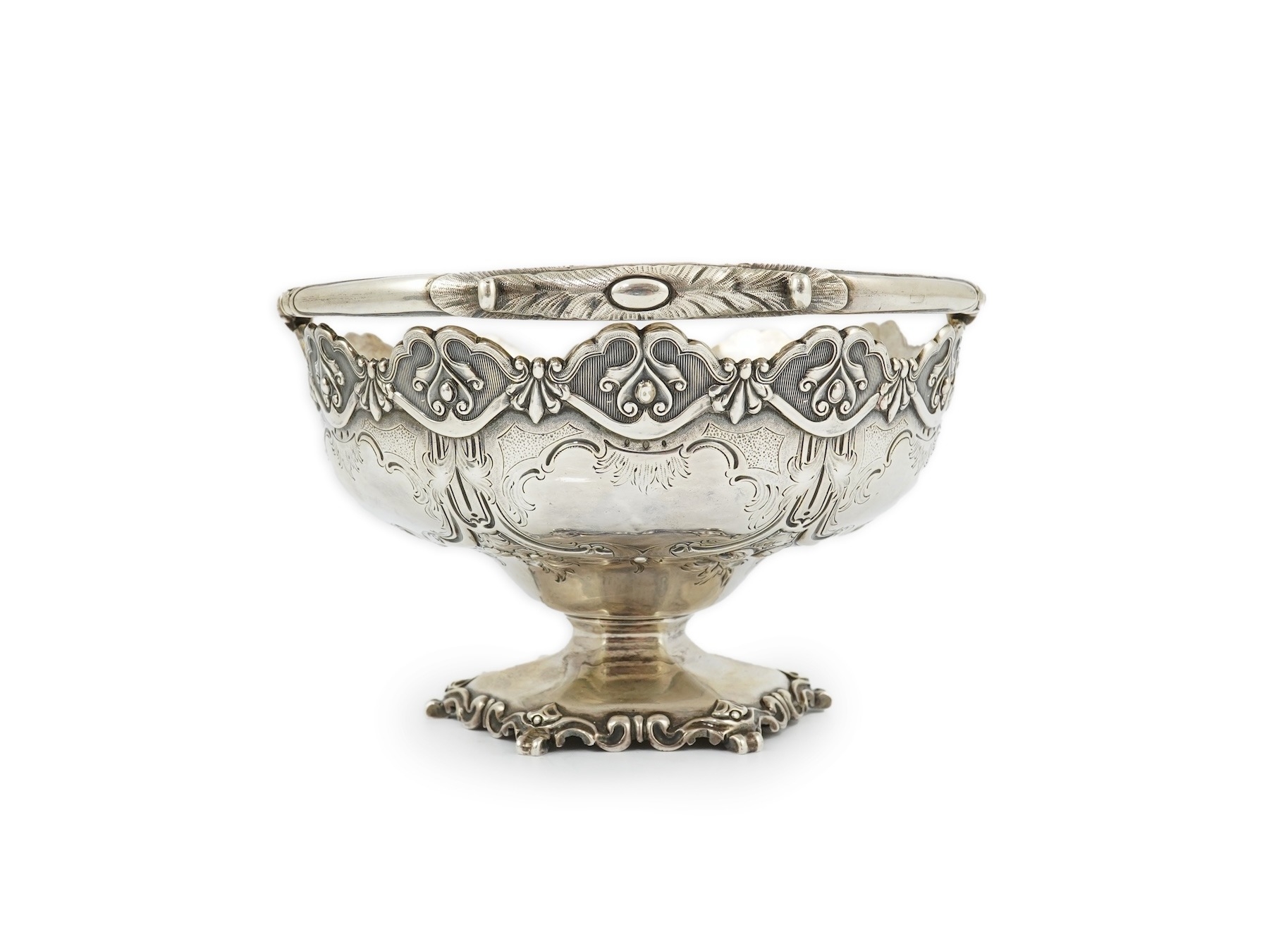 A Victorian silver circular basket, by Daniel & Charles Houle, with engraved foliate and scroll decoration, on pedestal foot, London, 1854, diameter 16cm, 13.7oz, lacking glass insert?
