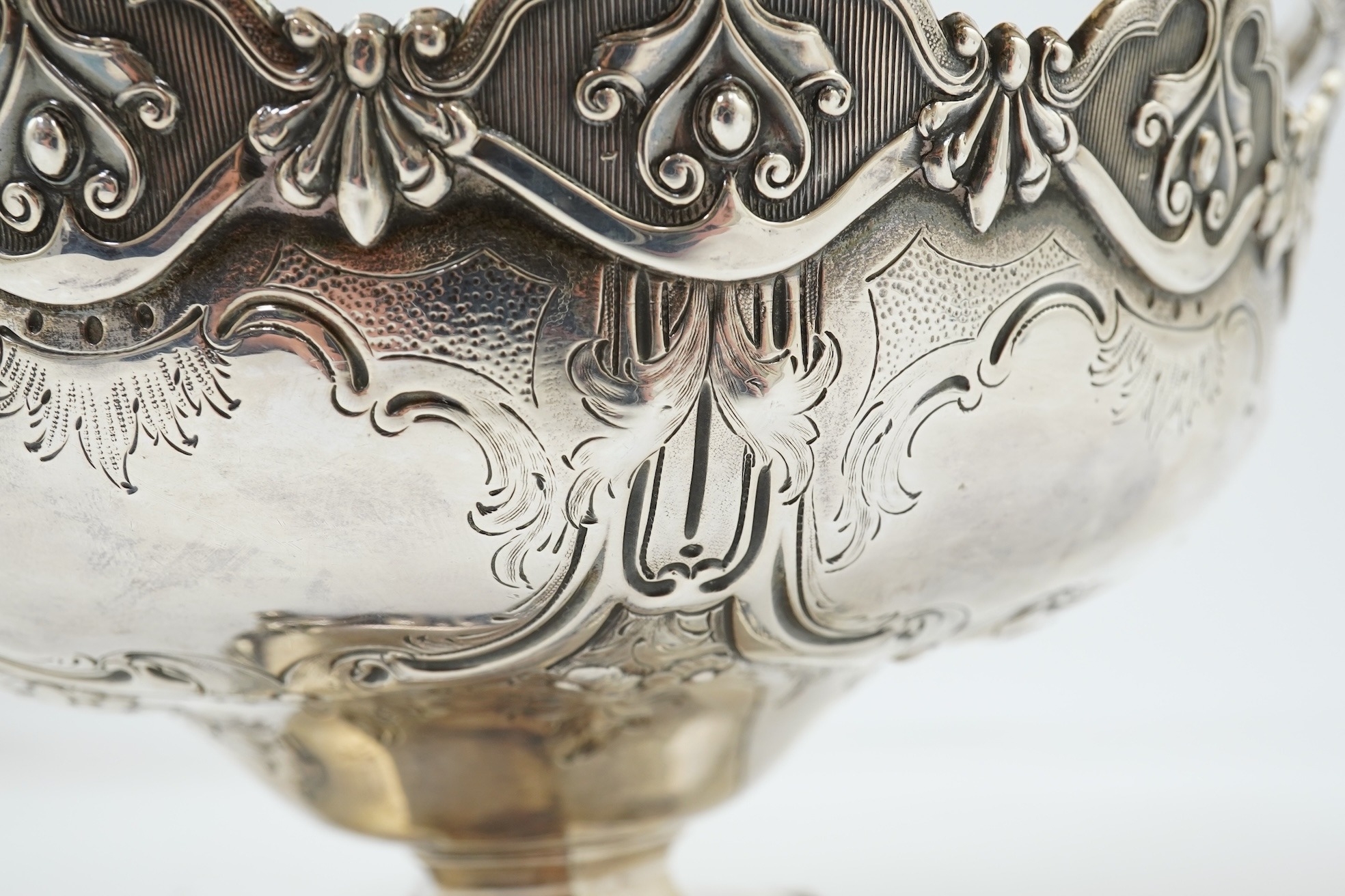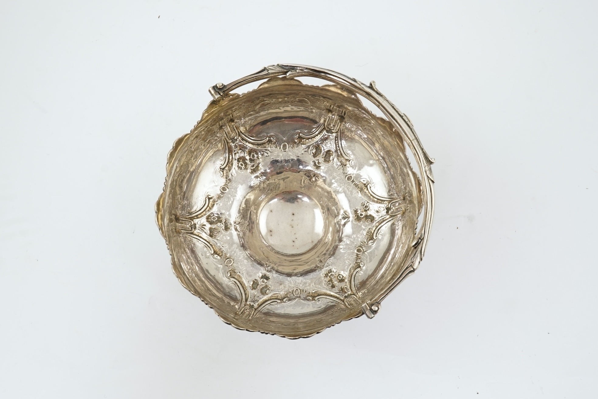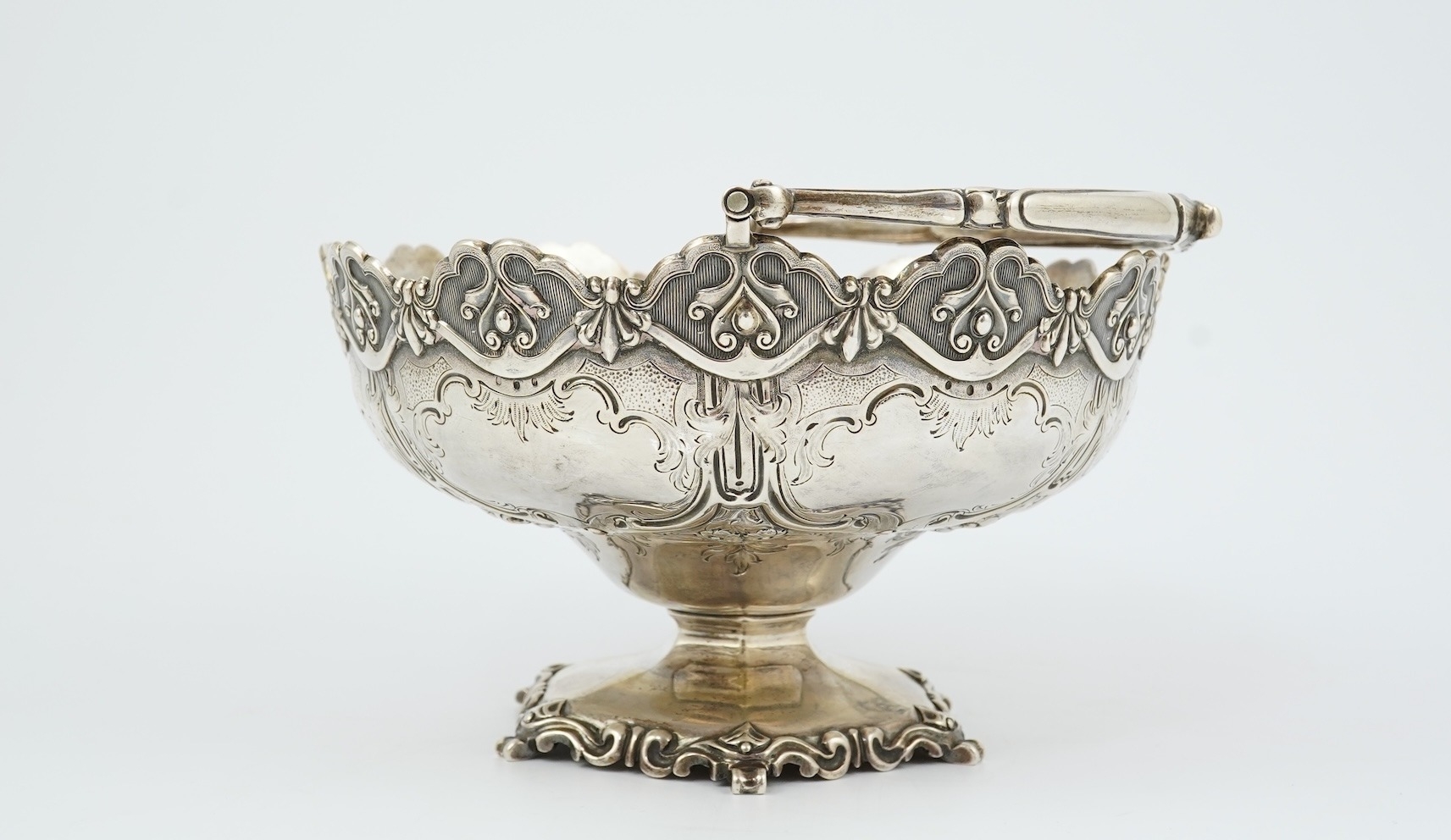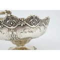 A Victorian silver circular basket, by Daniel & Charles Houle, with engraved foliate and scroll decoration, on pedestal foot, London, 1854, diameter 16cm, 13.7oz, lacking glass insert?