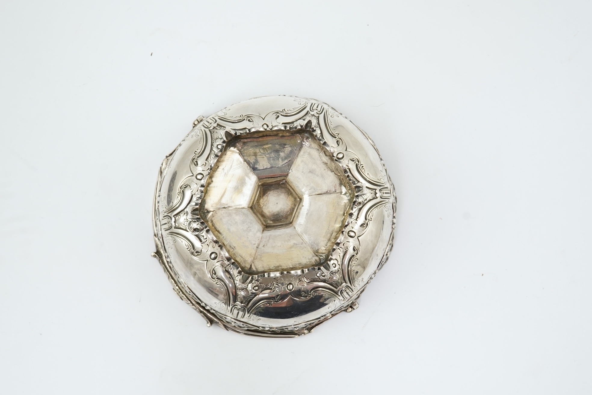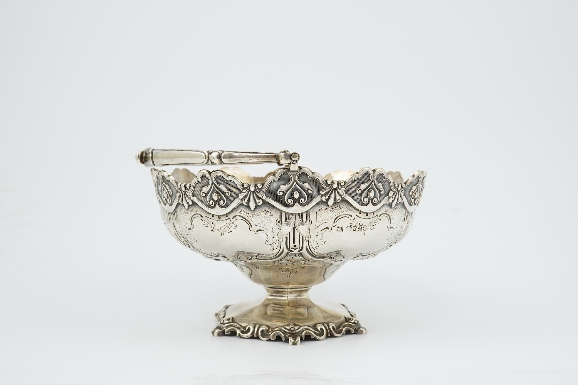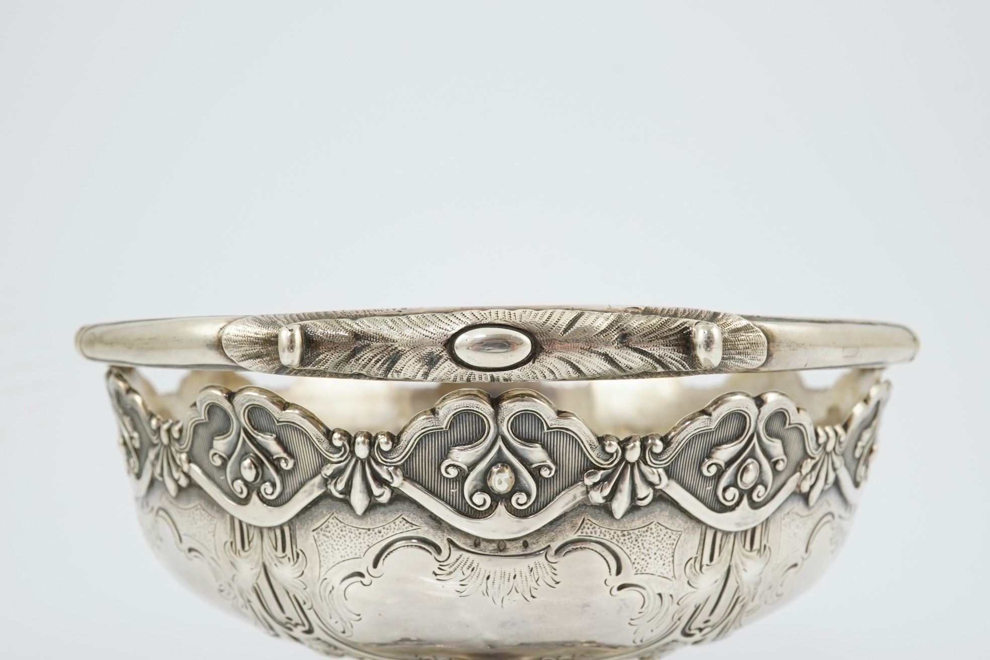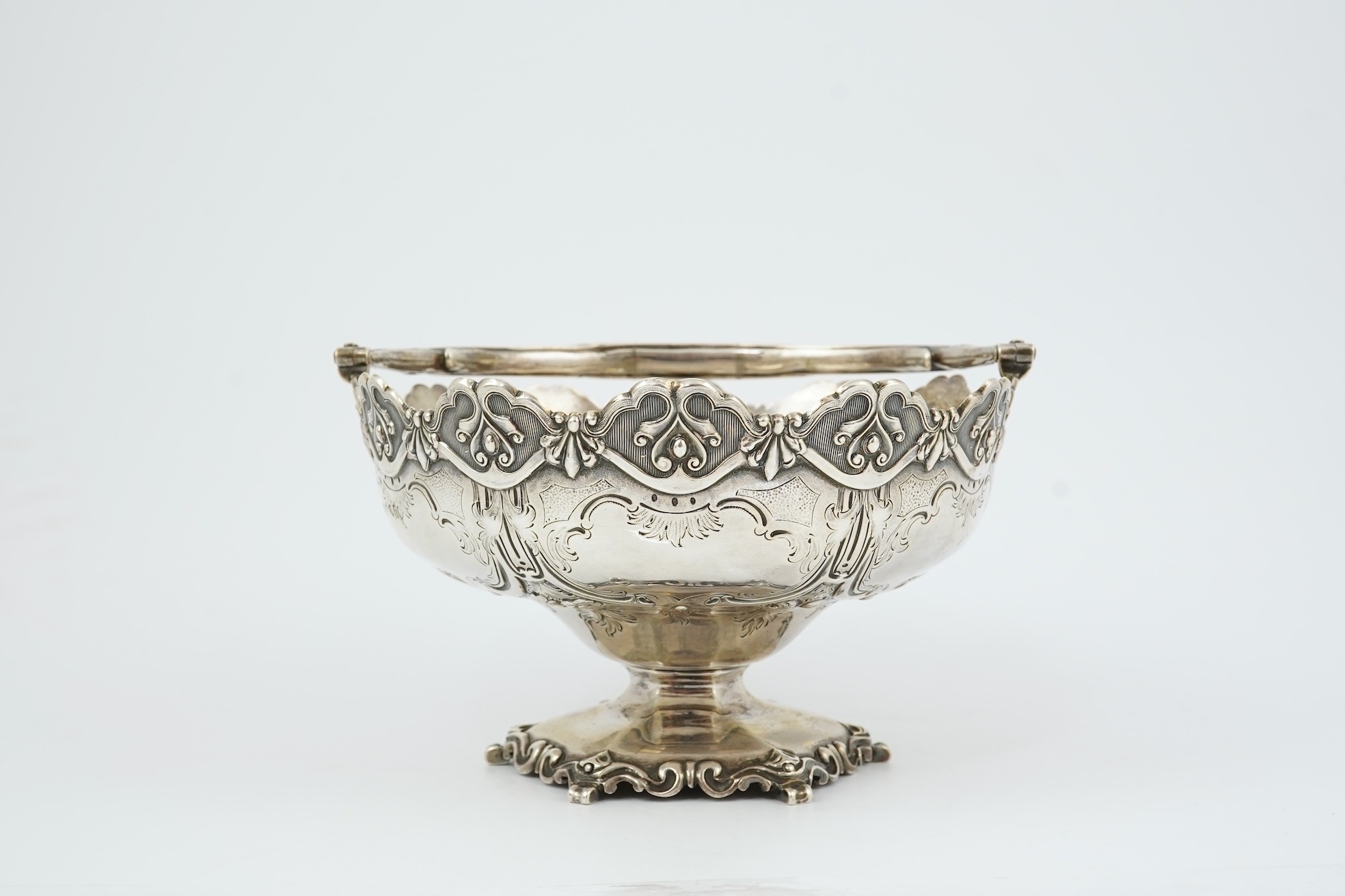 A Victorian silver circular basket, by Daniel & Charles Houle, with engraved foliate and scroll decoration, on pedestal foot, London, 1854, diameter 16cm, 13.7oz, lacking glass insert?