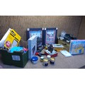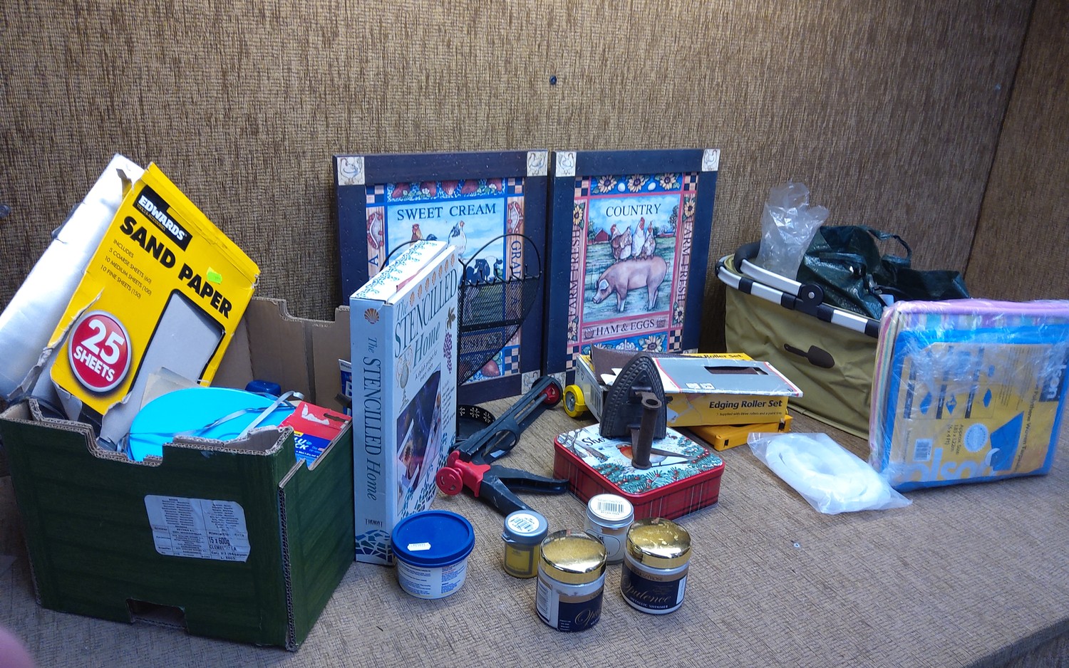 Box of mixed tools including a vintage cast iron, Garden items and selection of shabby chic items.