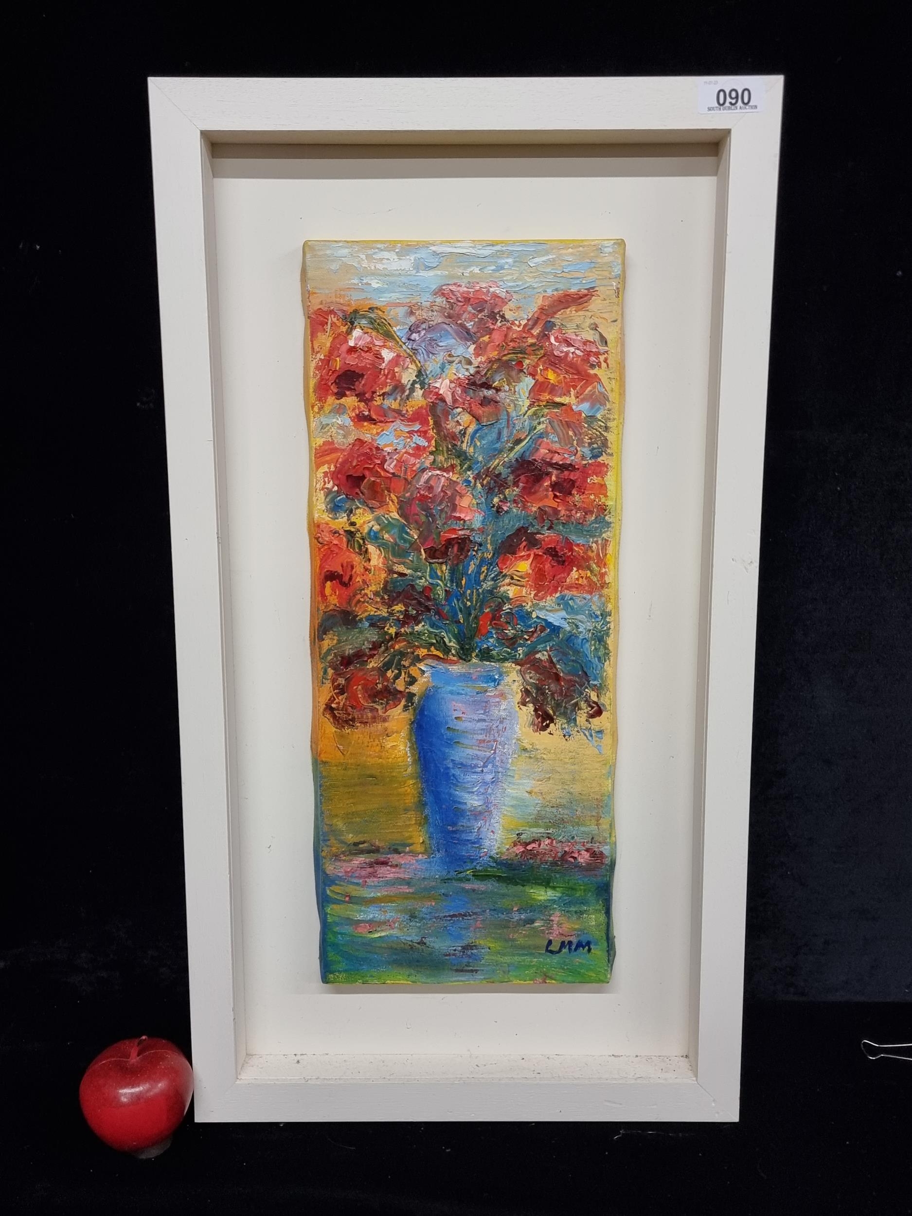 An original oil on canvas painting by artist Laura Marshall Morrisroe featuring a study of a still life of flowers in a blue vase in thick impasto. A highly vibrant and gestural piece.