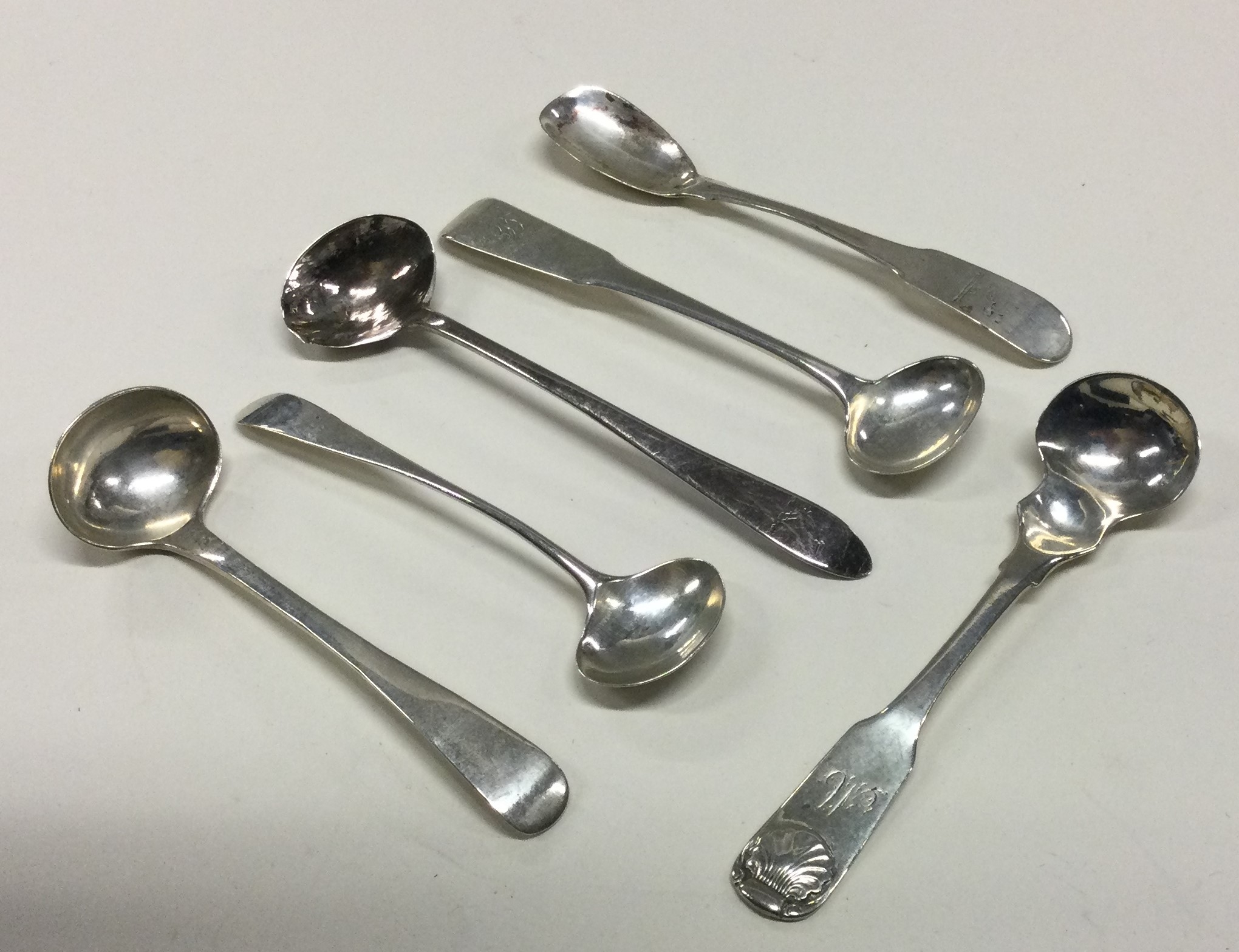 Six various Scottish and Irish silver salt and mustard spoons to include a Cork example by PW. Approx. 50 grams. Est. £40 - £60.