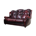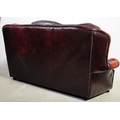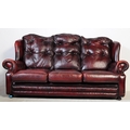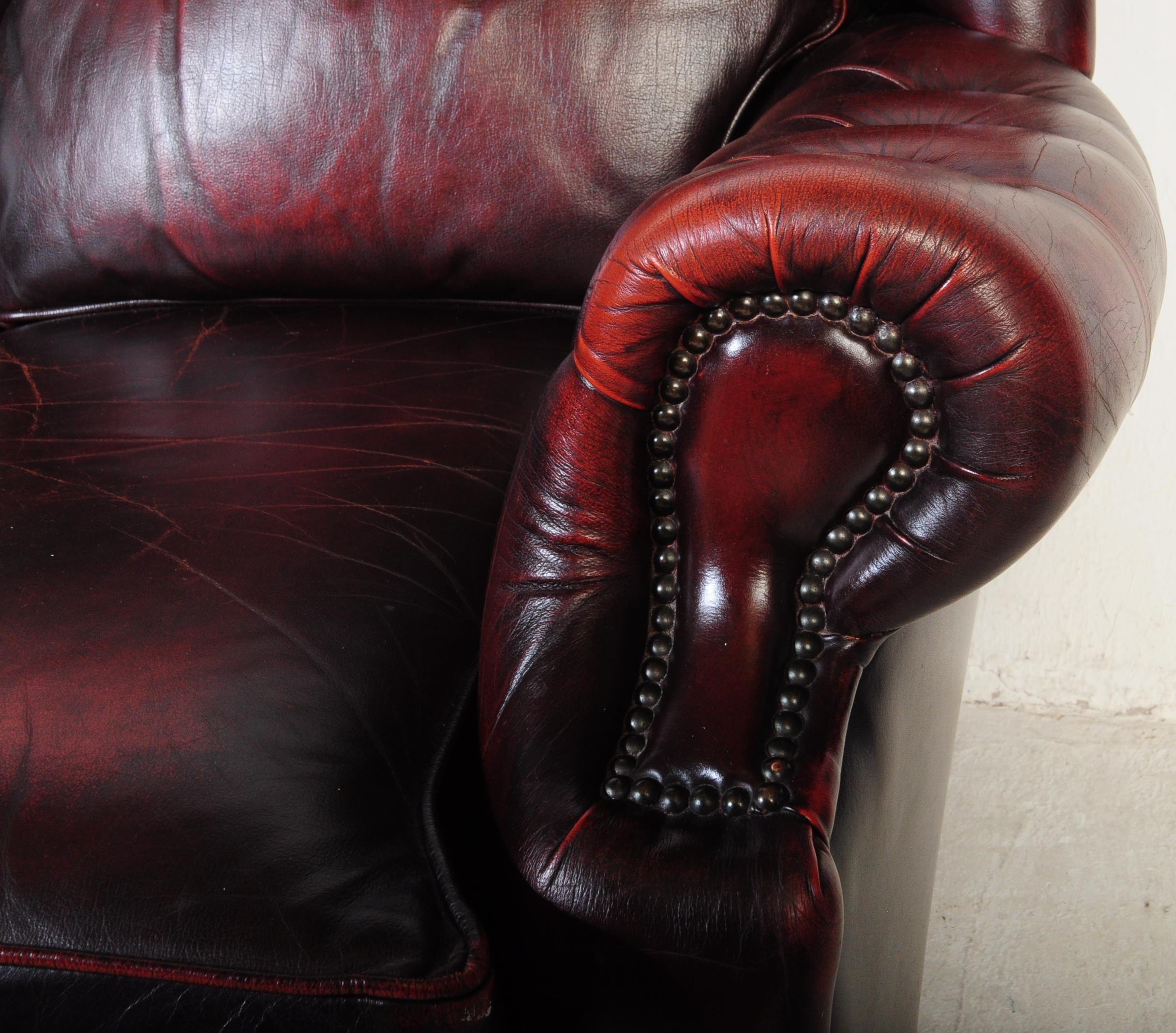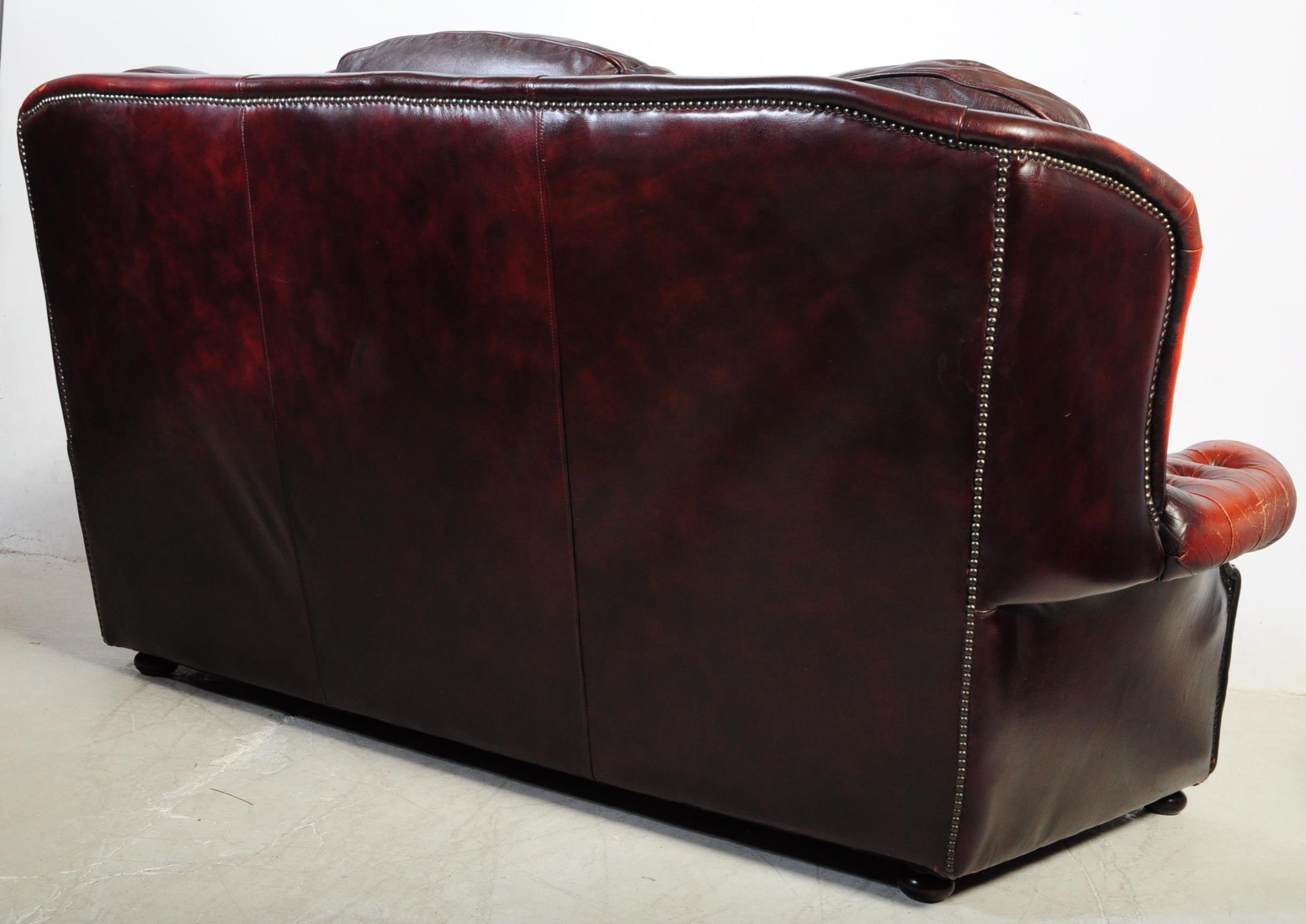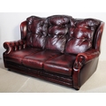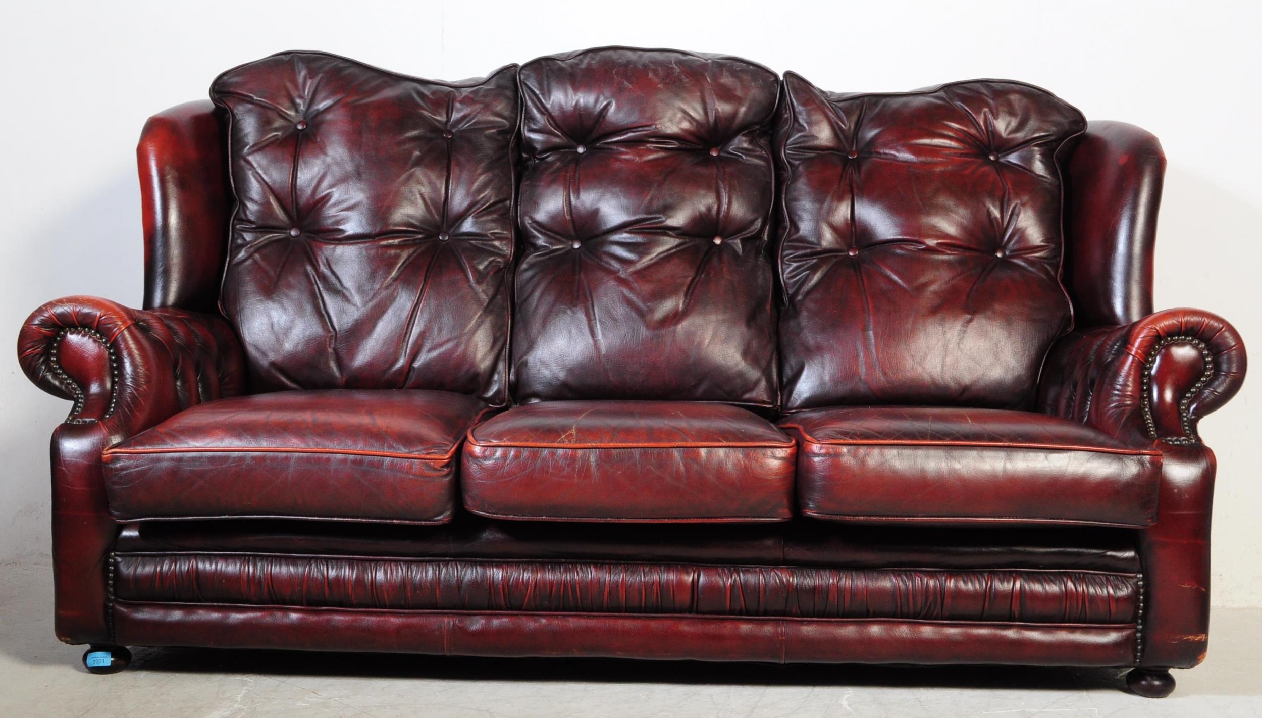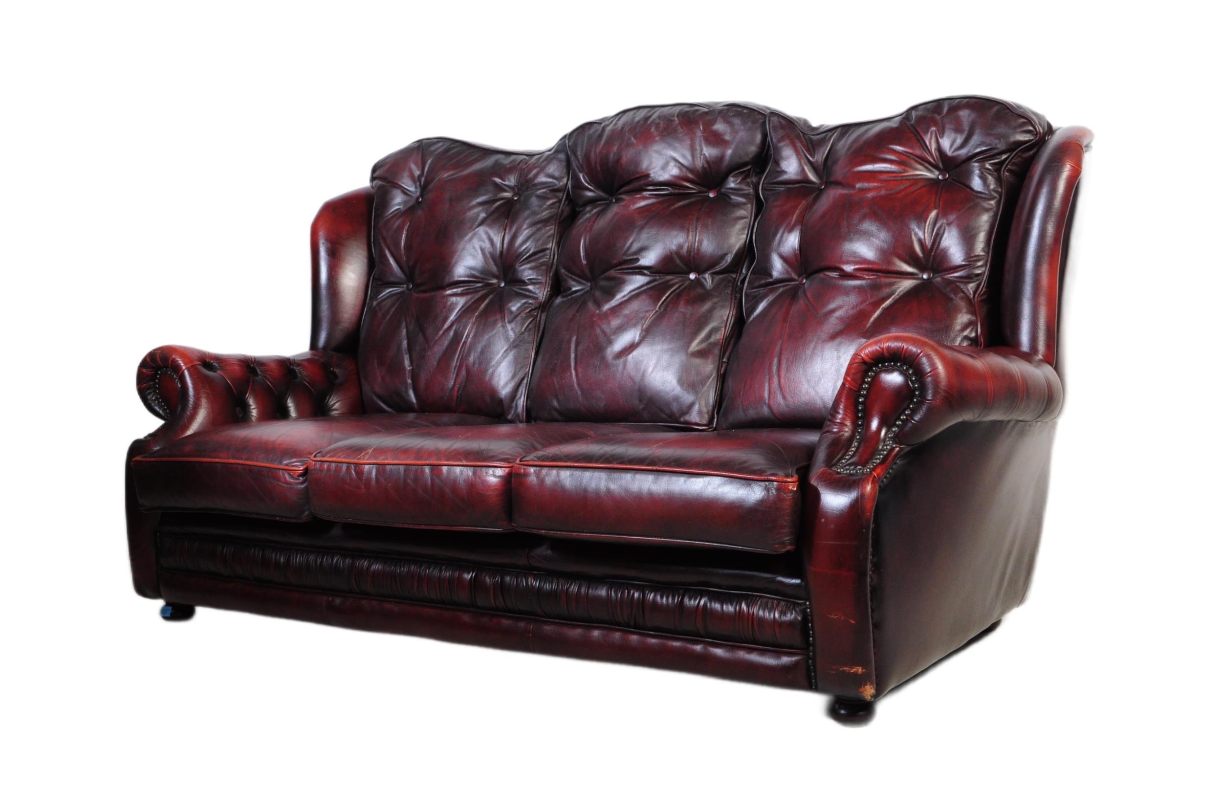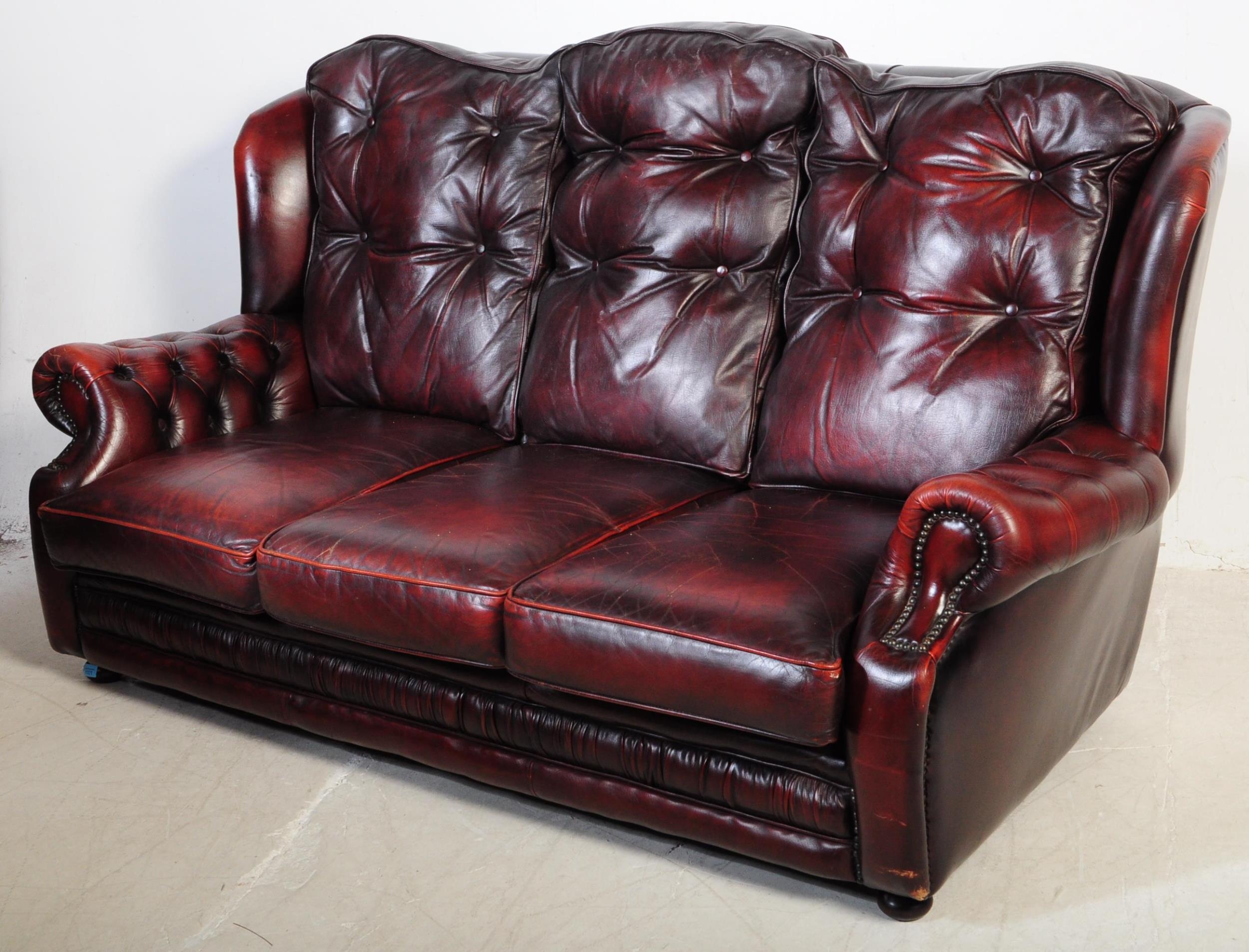 A vintage 20th century button back chesterfield three seater sofa settee couch. In oxblood colour with drop in button back cushioned back rests and seats. With winged sides and curved elbow rests. All raised on bun feet. Measures approx 98cm x 186cm x 99cm.