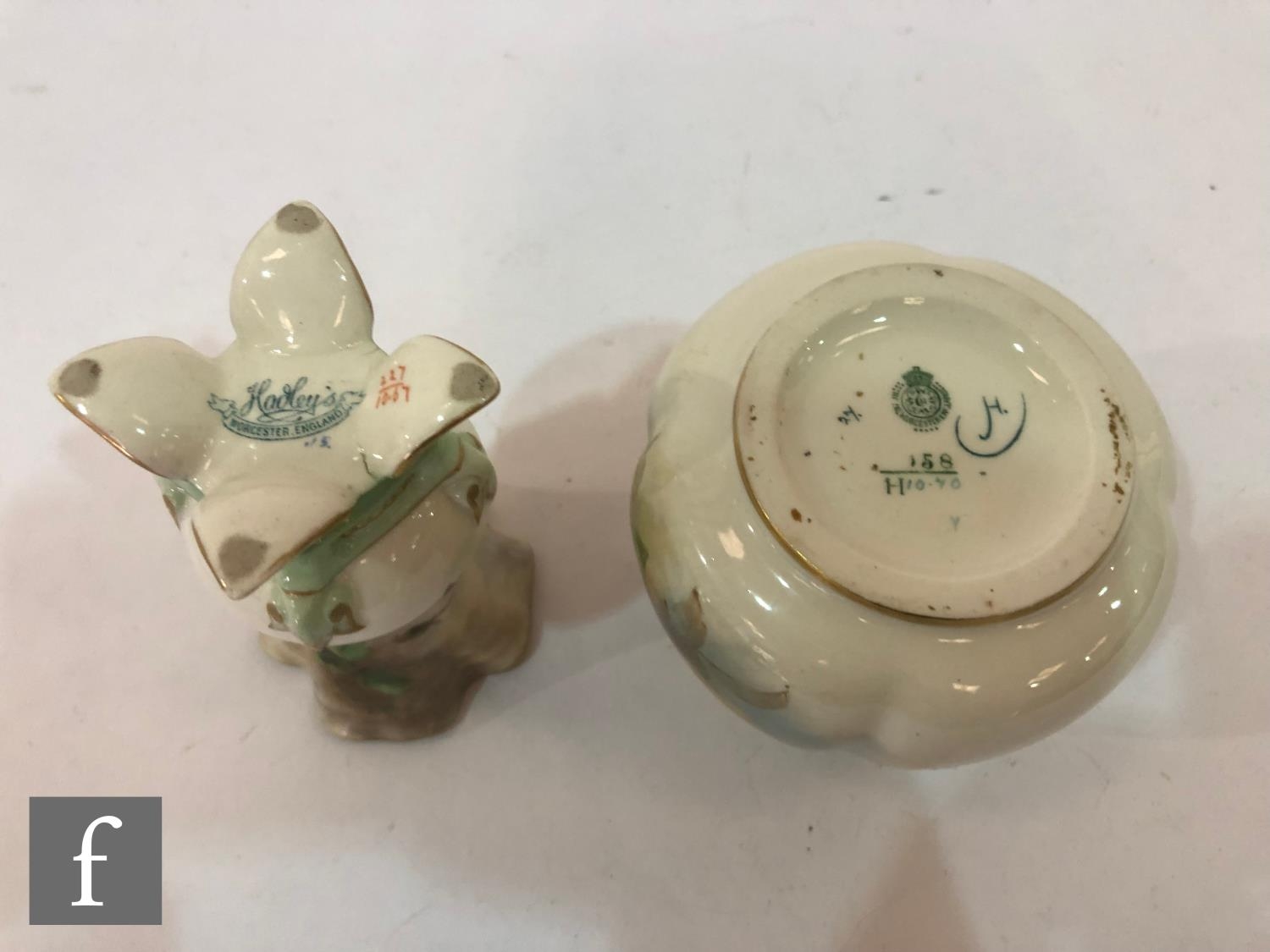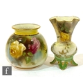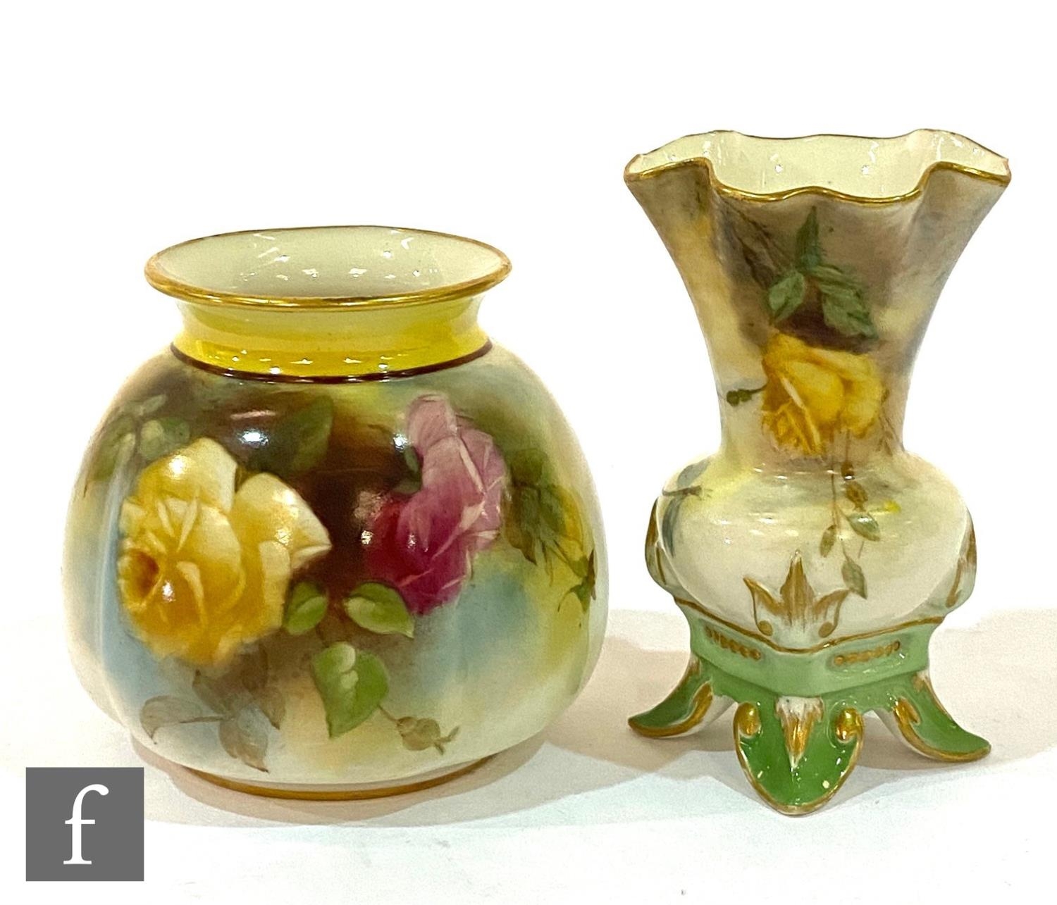 AMENDED DESCRIPTION - A Royal Worcester Hadley shape 158 vase panel decorated with hand painted roses, green mark with date code for 1908, height 8cm, together with a small Hadleys Worcester bud vase. (2)