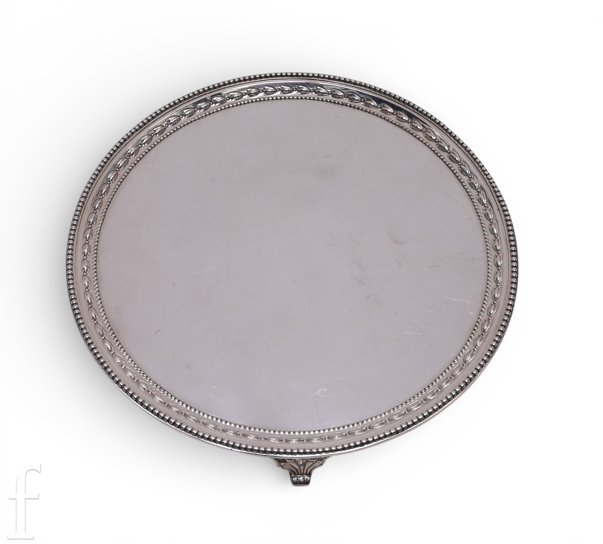 A George III silver waiter, of circular form with beaded and laurel leaf border decoration on three beaded and shell feet, hallmarked London 1818, maker initials I.S, diameter 20.5cm, weight 12oz.