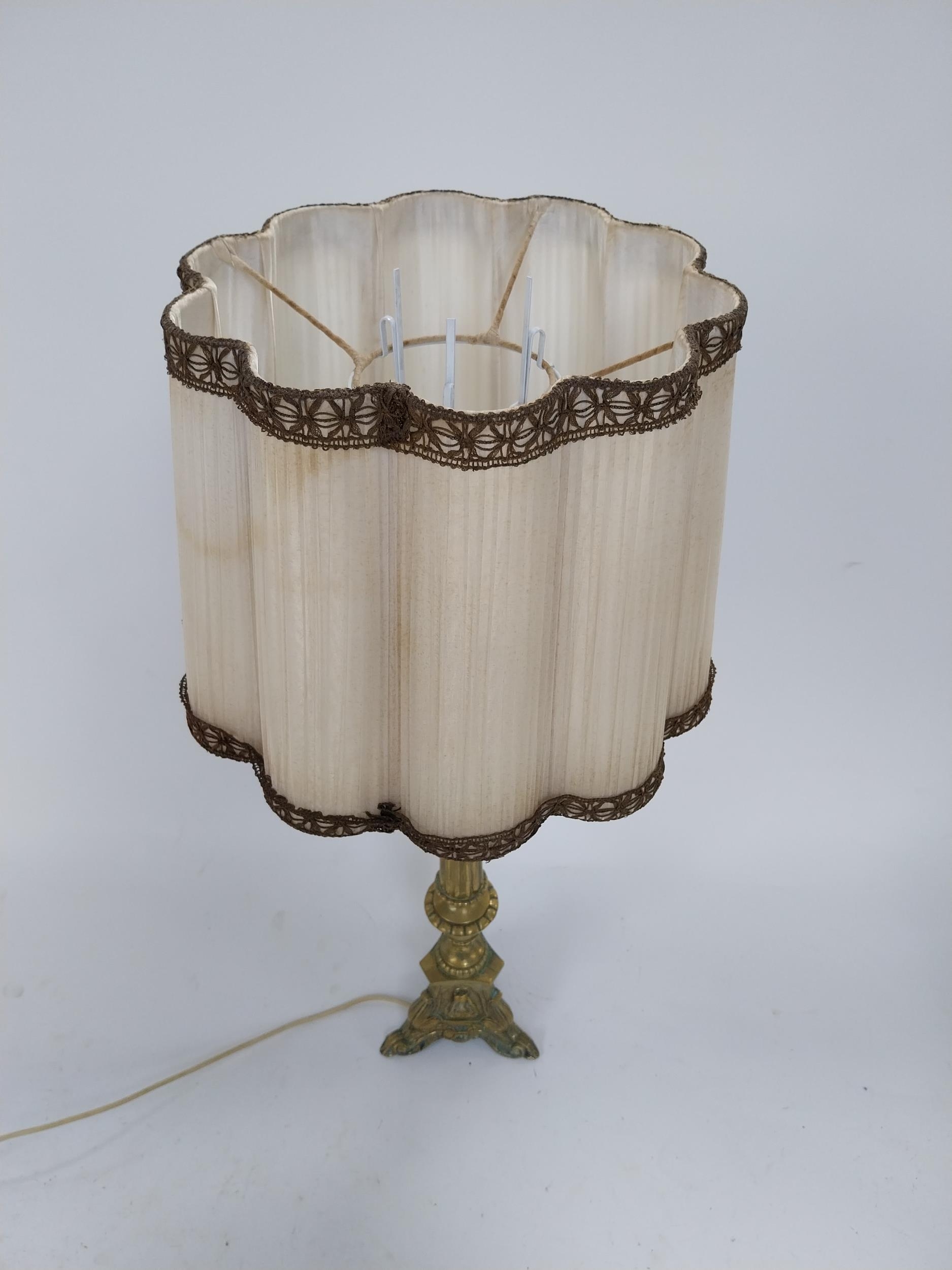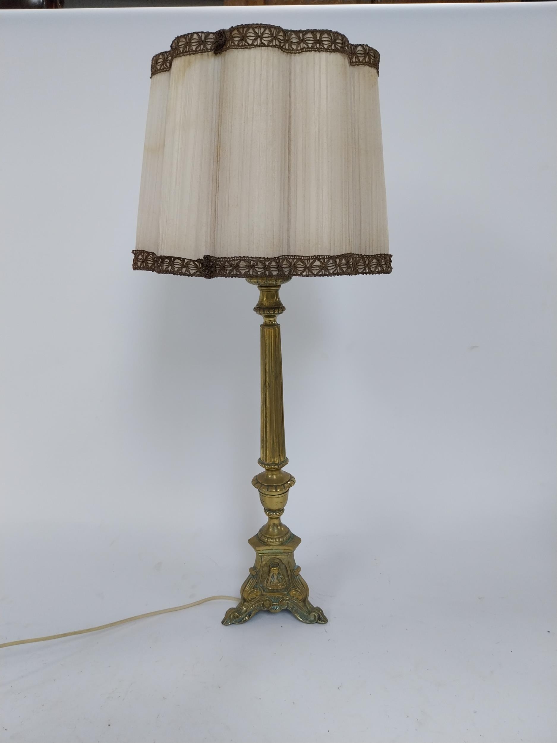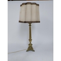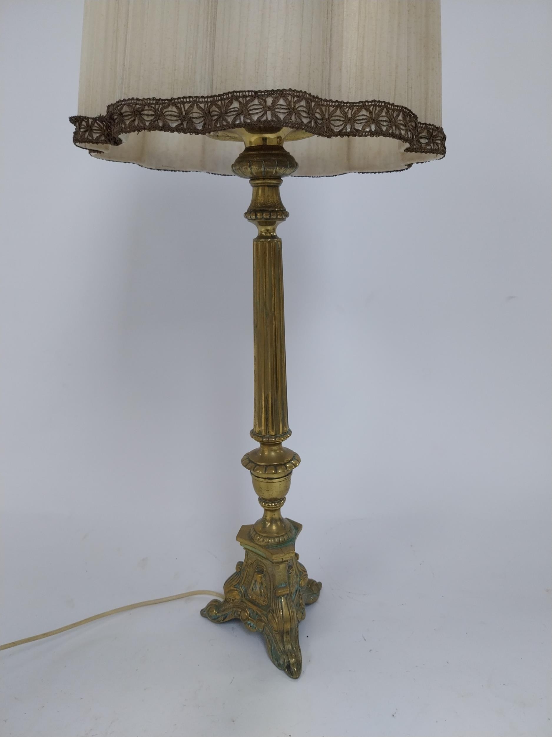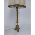 Edwardian ecclesiastical brass table lamp with cloth shade {86 cm H x 32 cm Dia.}.
