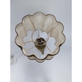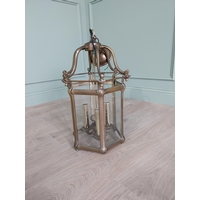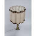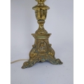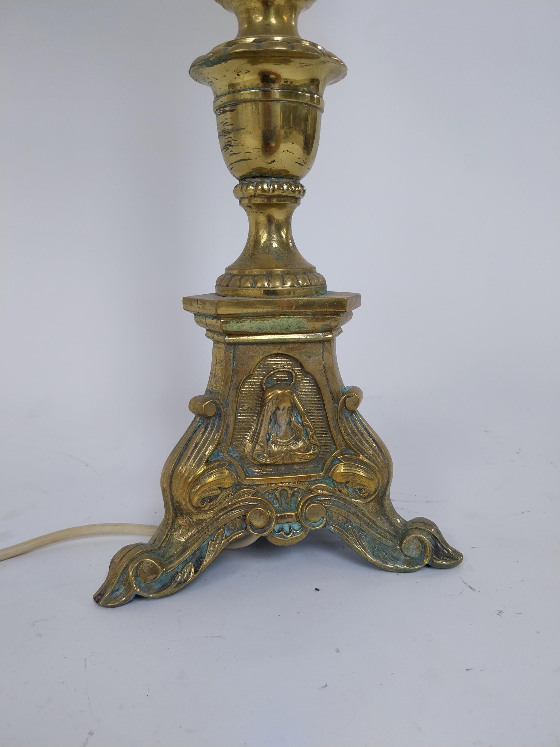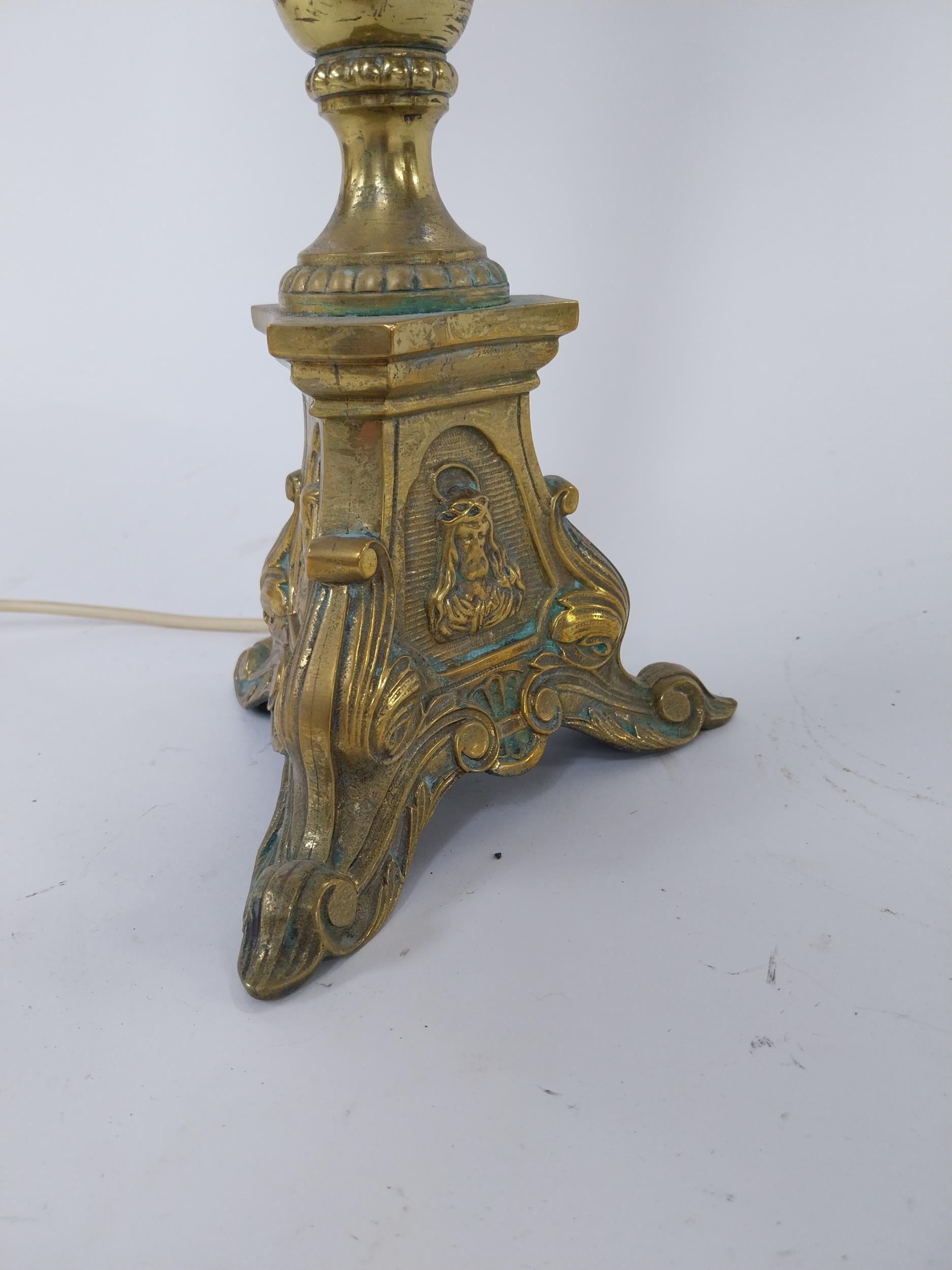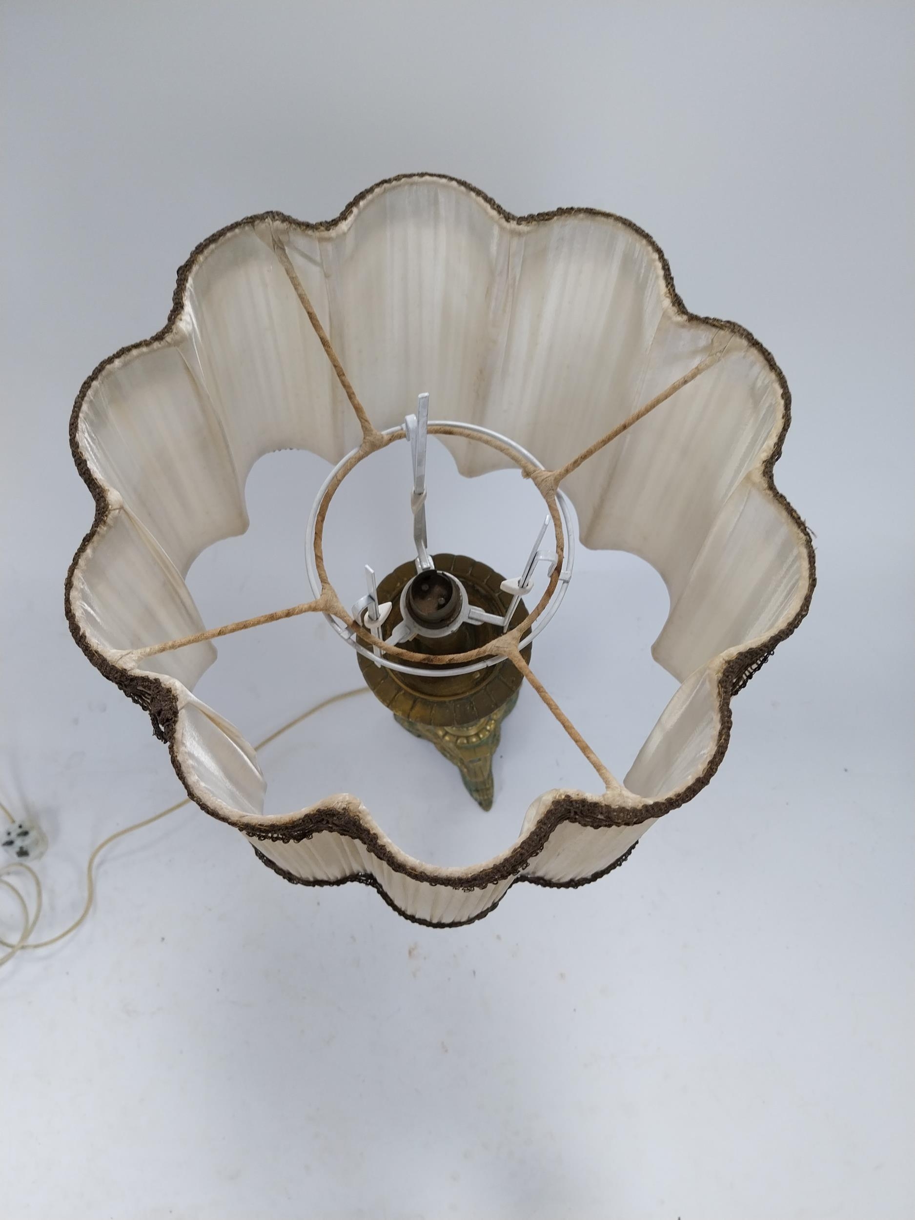 Edwardian ecclesiastical brass table lamp with cloth shade {86 cm H x 32 cm Dia.}.
