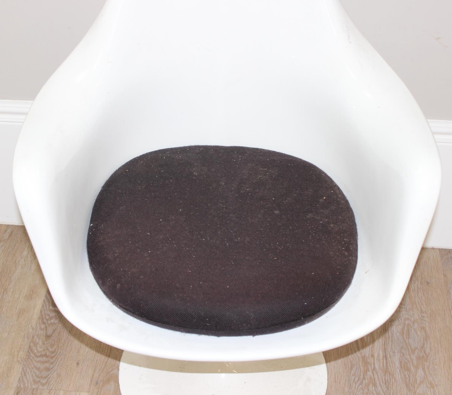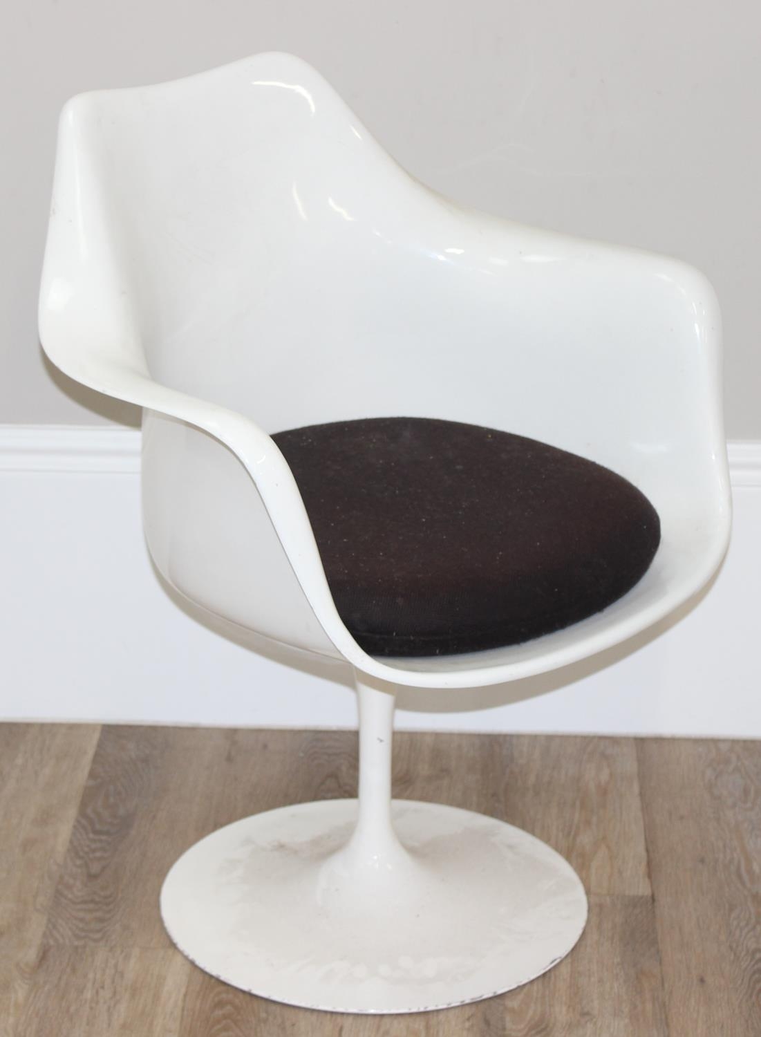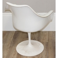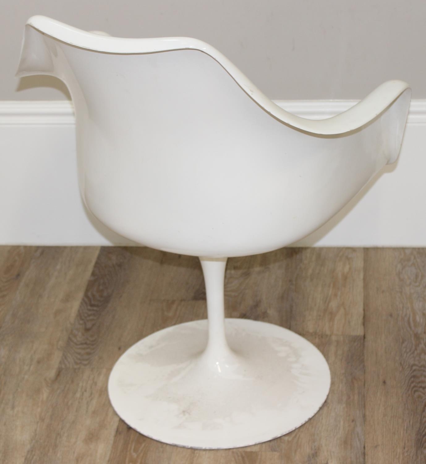 A retro style white tulip plastic moulded chair designed originally by Eero Saarinen, with label for Form International London, approx 64cm wide x 52cm deep x 79cm tall