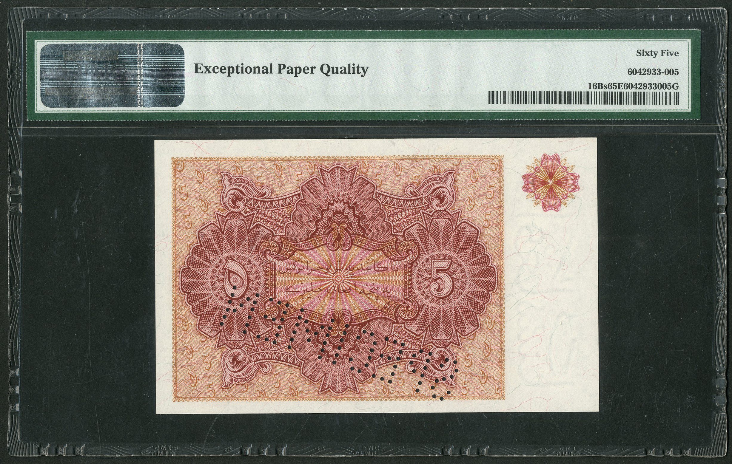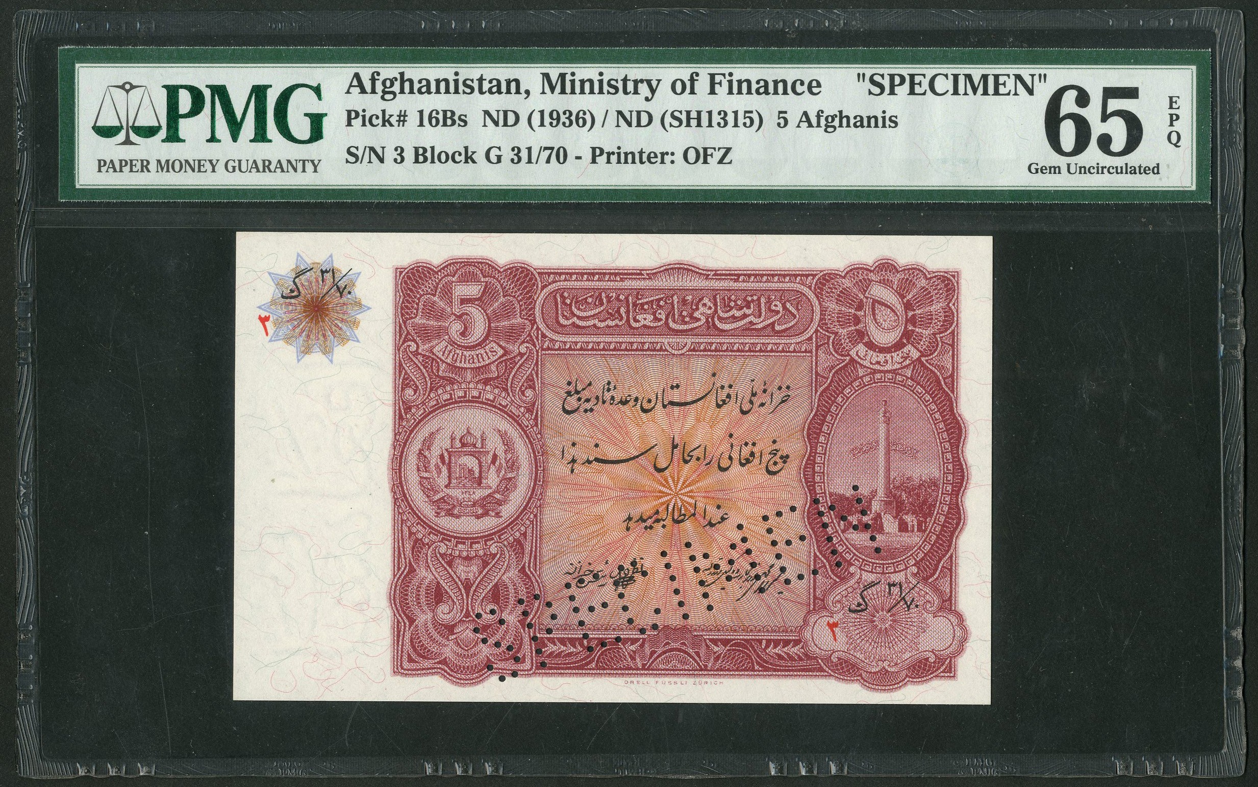 Afghanistan: Ministry of Finance, 5 Afghanis, ND (1936), perforated SPECIMEN, block 3 in red (Pick 16Bs). PMG 65 EPQ Gem Uncirculated.