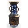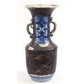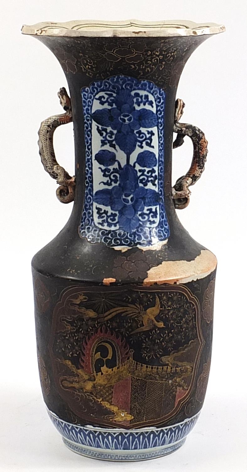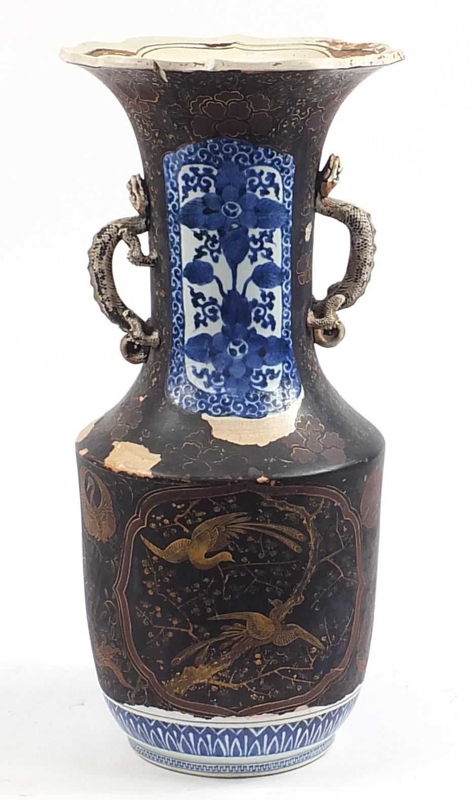 Large Japanese lacquered porcelain vase with dragon handles, gilded with birds of paradise amongst flowers, 68cm high
