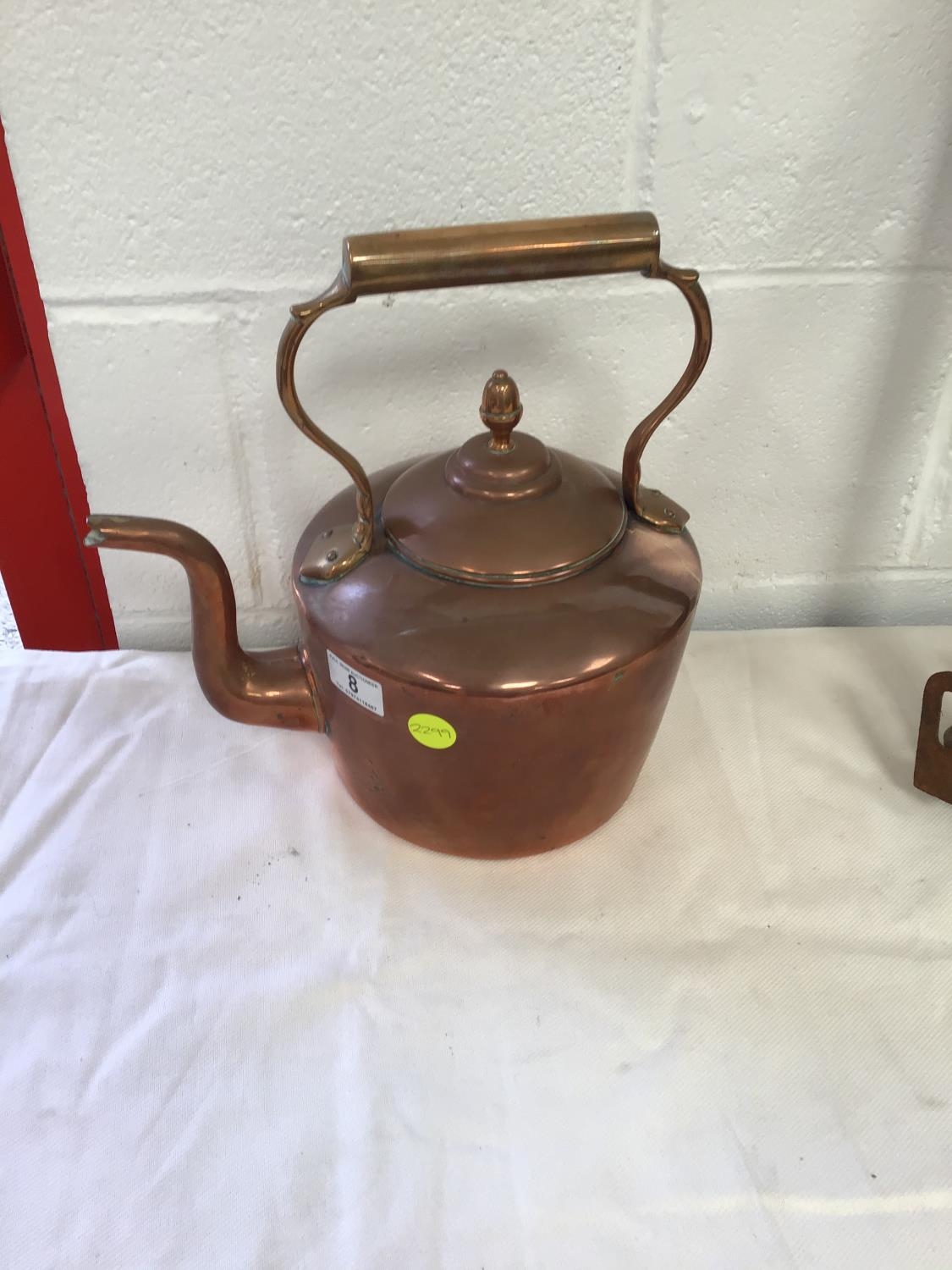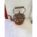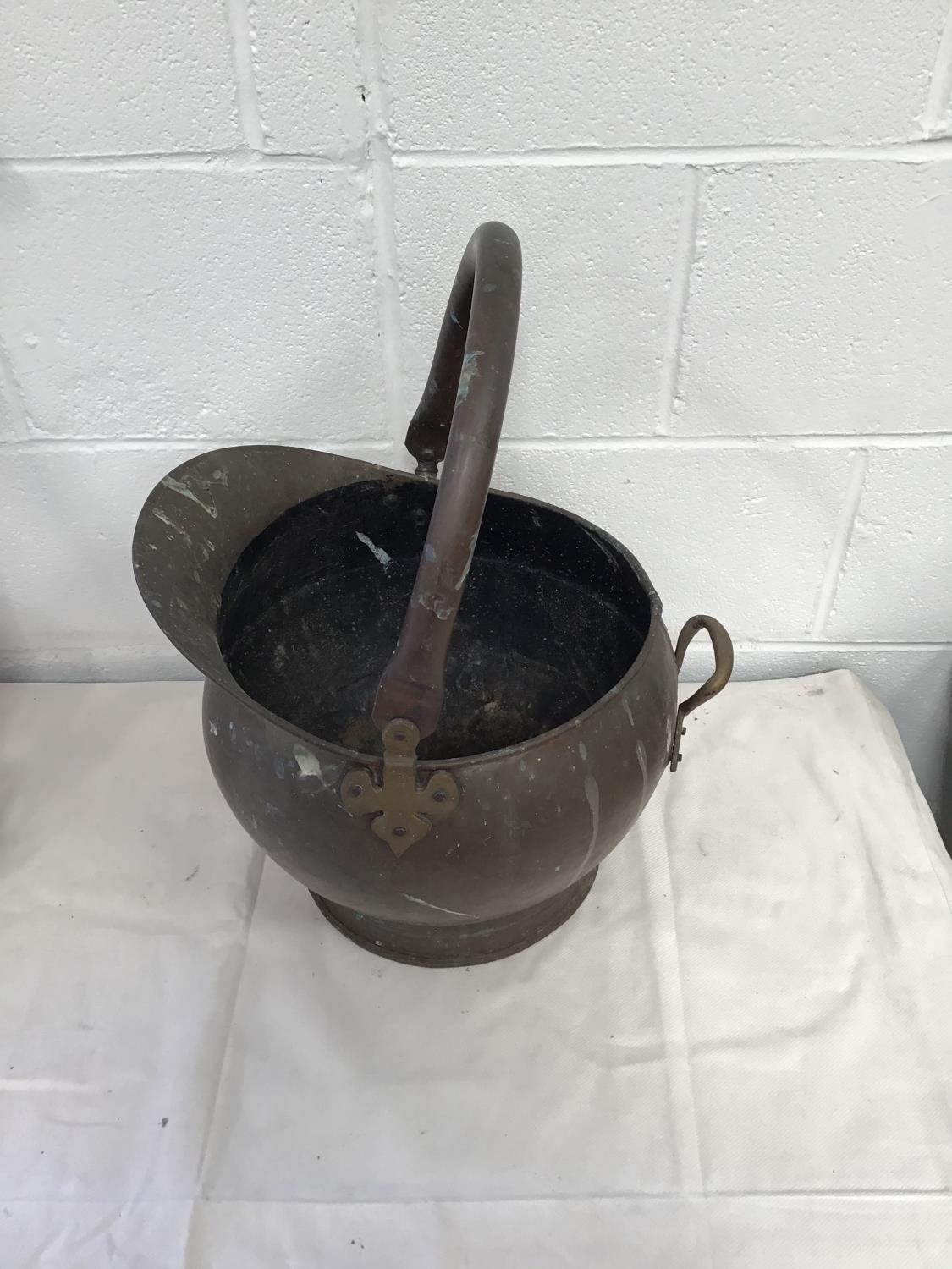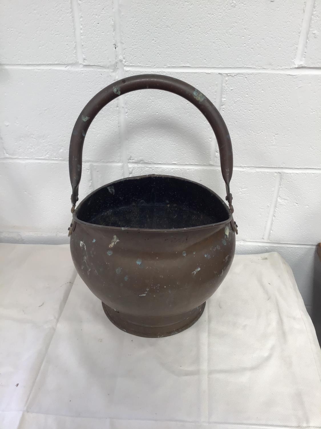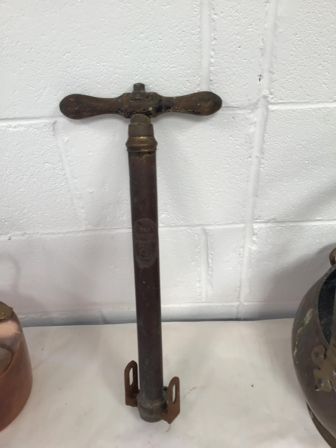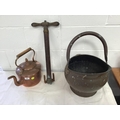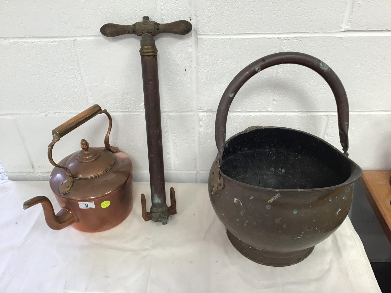 LARGE VICTORIAN COPPER KETTLE, STIRRUP PUMP AND COPPER COAL SCUTTLE