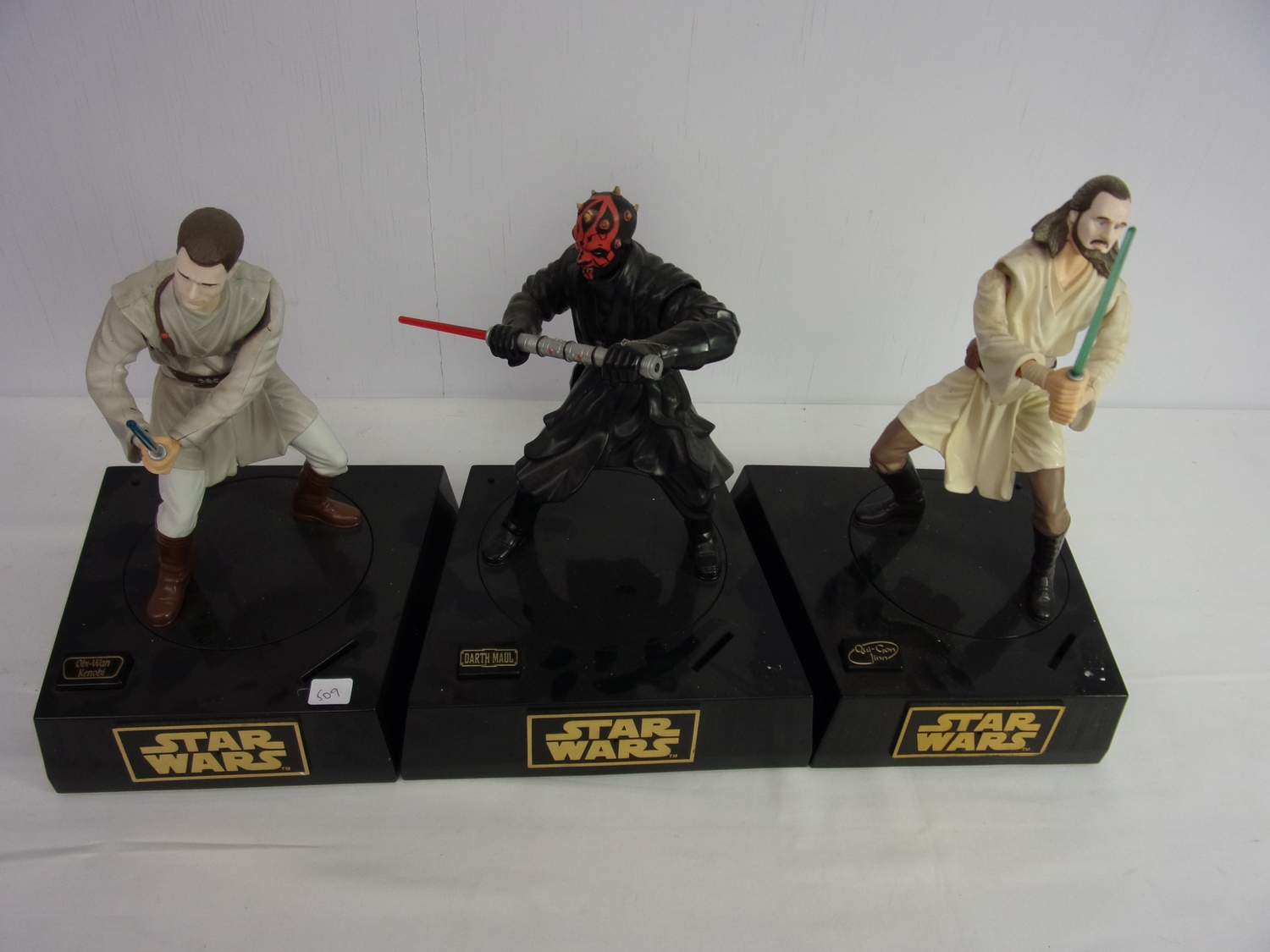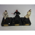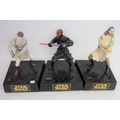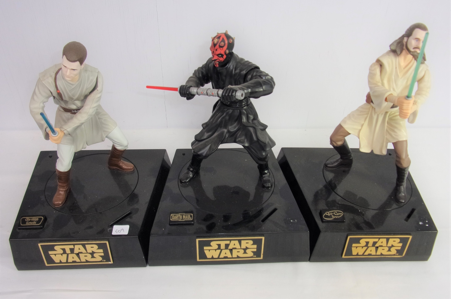 TRIO OF STAR WARS FIGHTING CHARACTERS WHICH CLIP TOGETHER TO FORM A SCENE WHEN COIN IS ADDED TO THE CHARACTERS BEING BATTERY OPERATED AND COMPRISING OBI-WAN-KNOBI, DARTH MAUL, AND QUI JON JINN