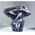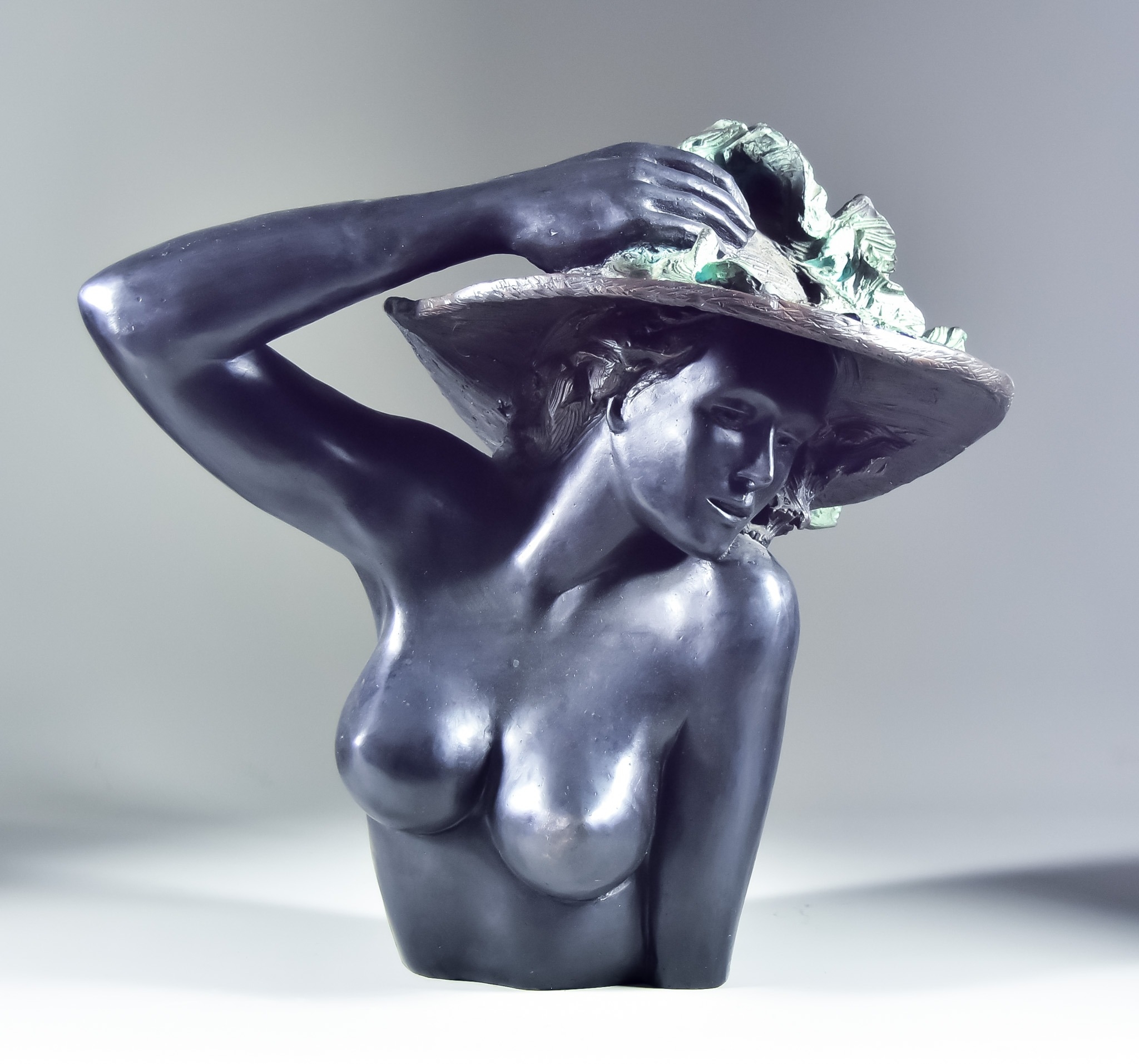 A Bronze Bust of a Woman with Hat, indistinctly signed, with green highlighting to top of hat, 19ins overall