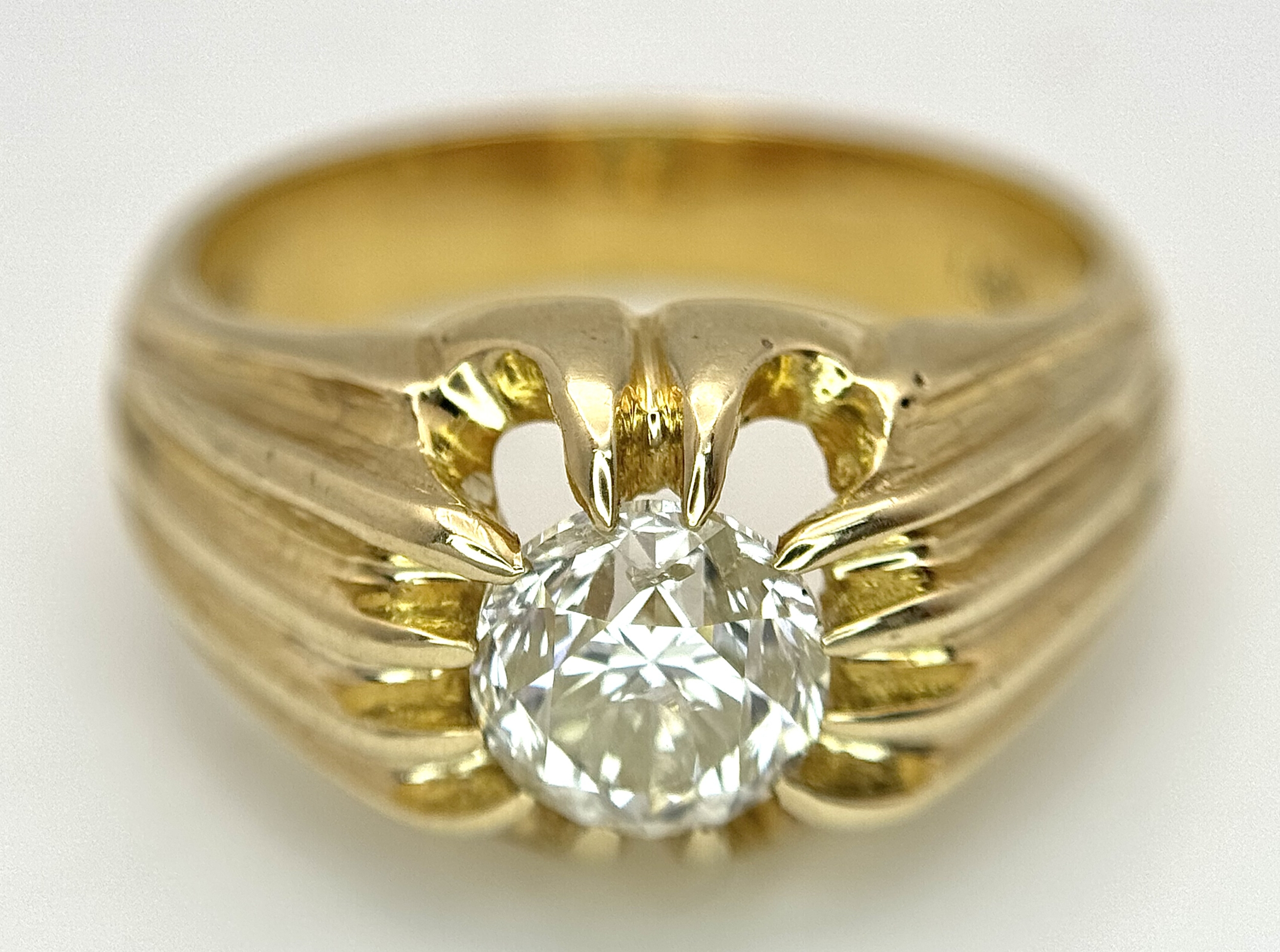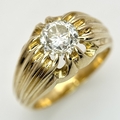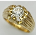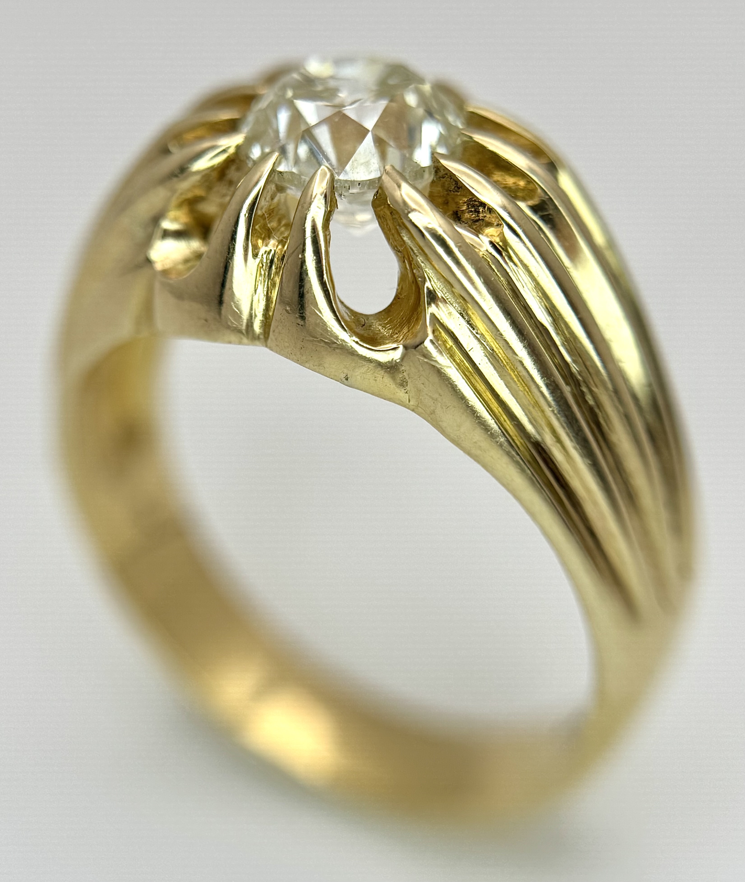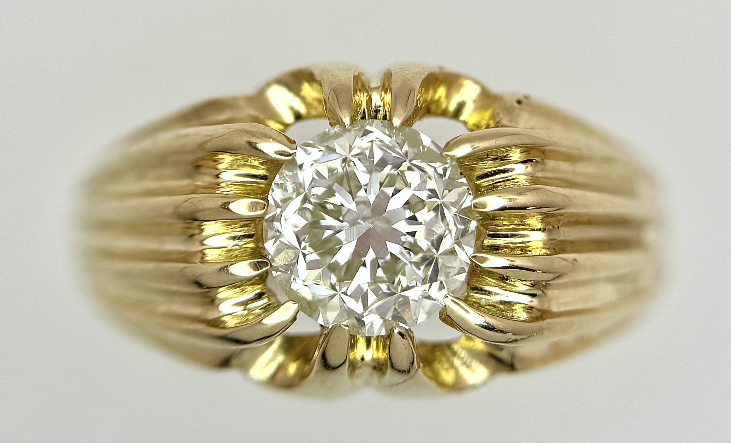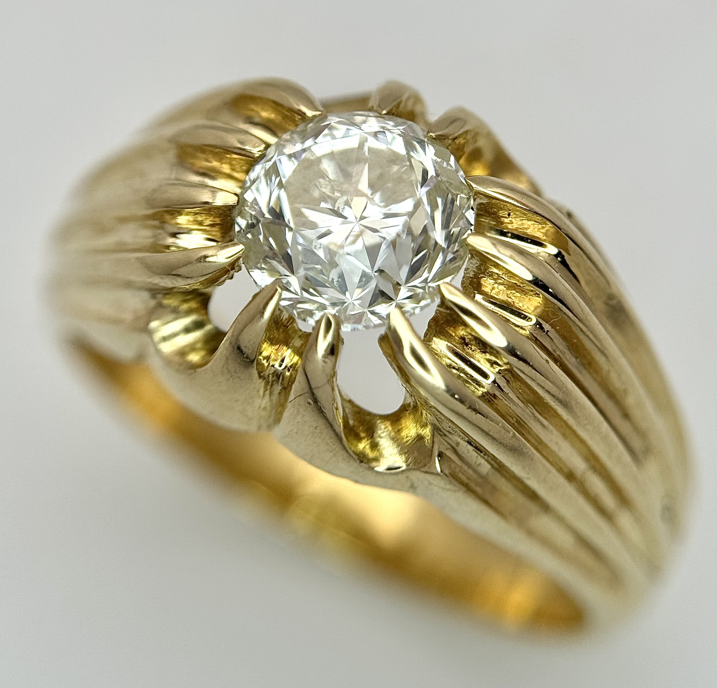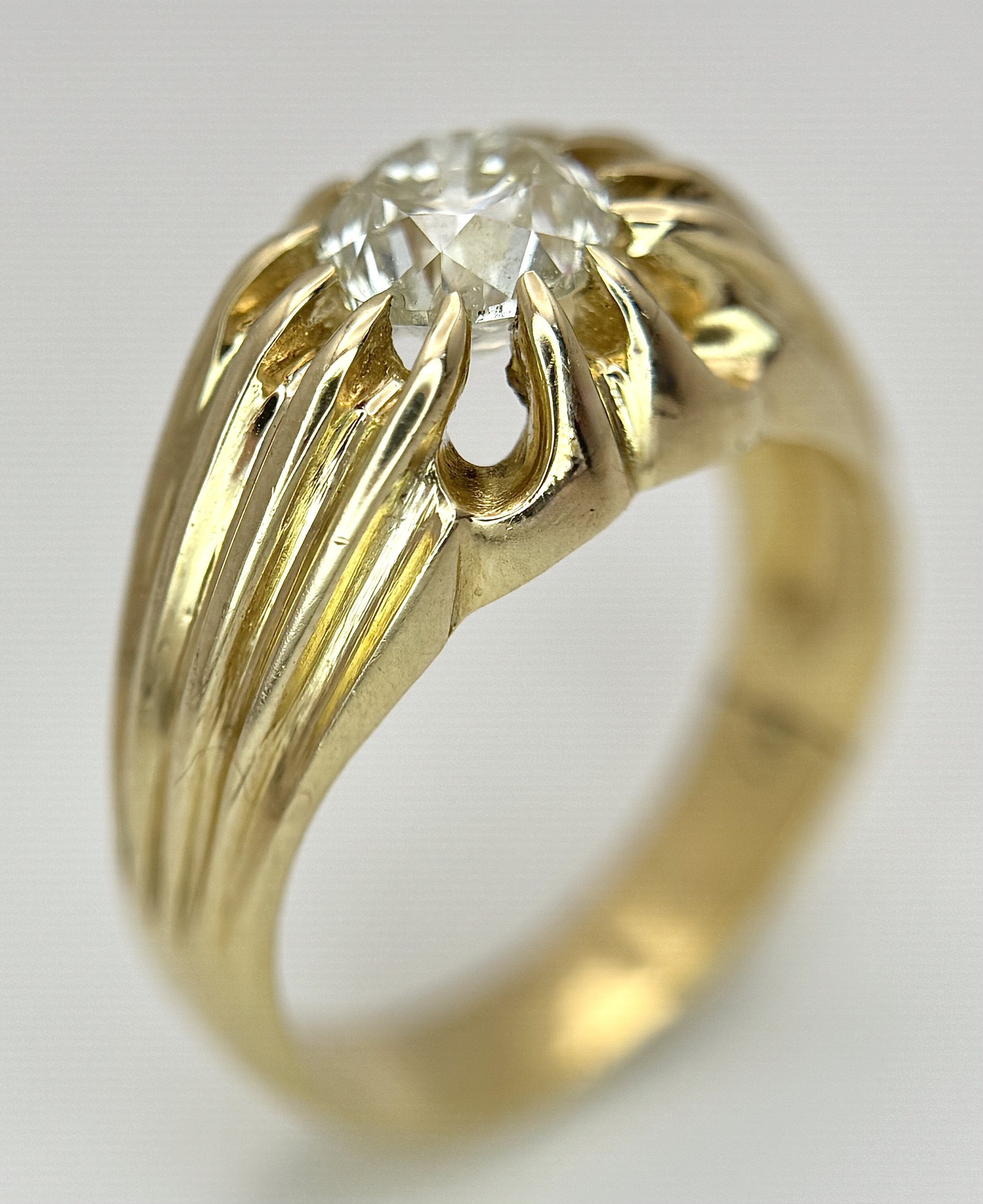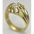A 9K YELLOW GOLD, GYPSY SET, OLD CUT DIAMOND, SINGLE STONE RING. 1.50CTW APPROX. 6.8G, SIZE T. SPSA 1029