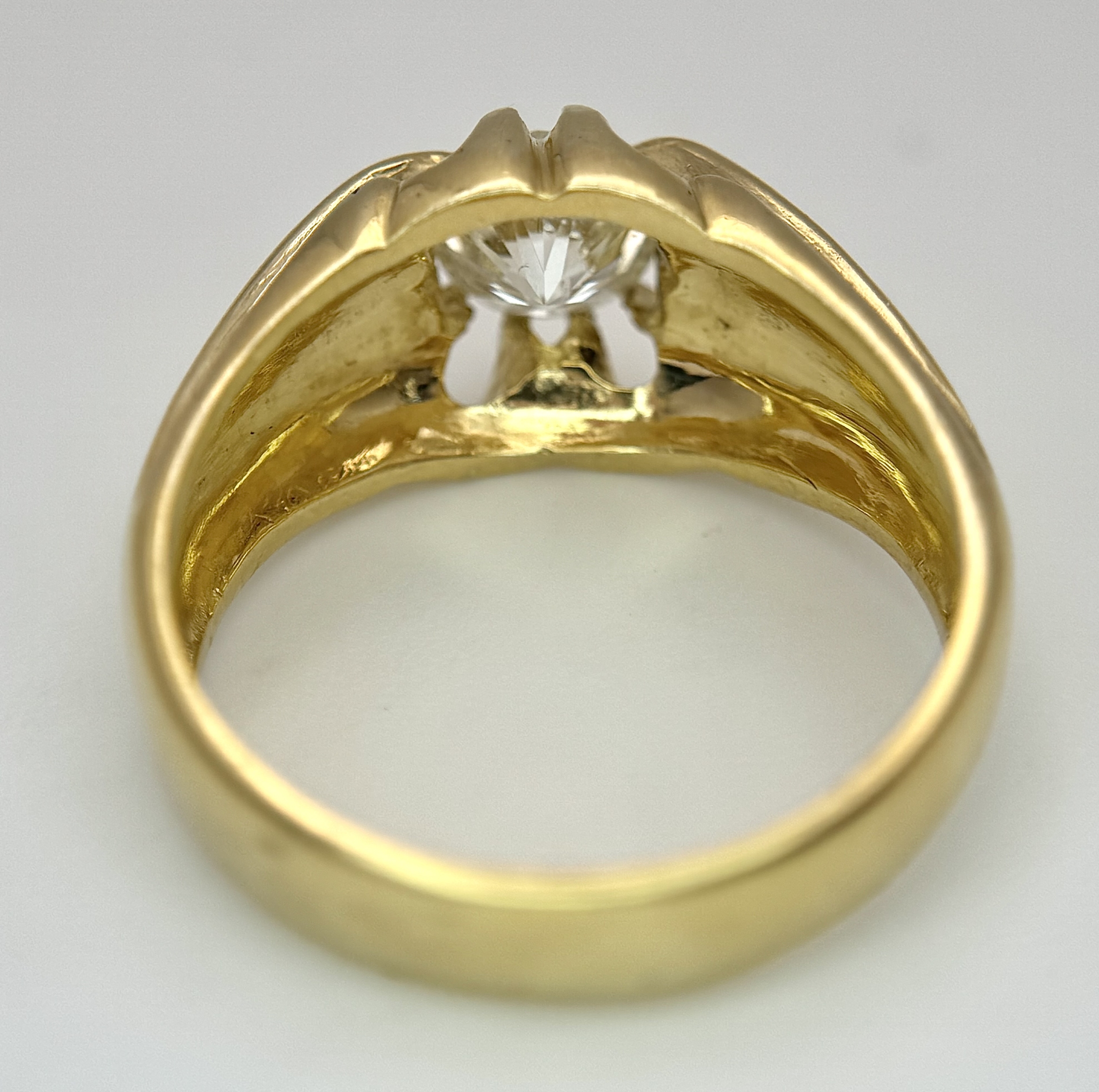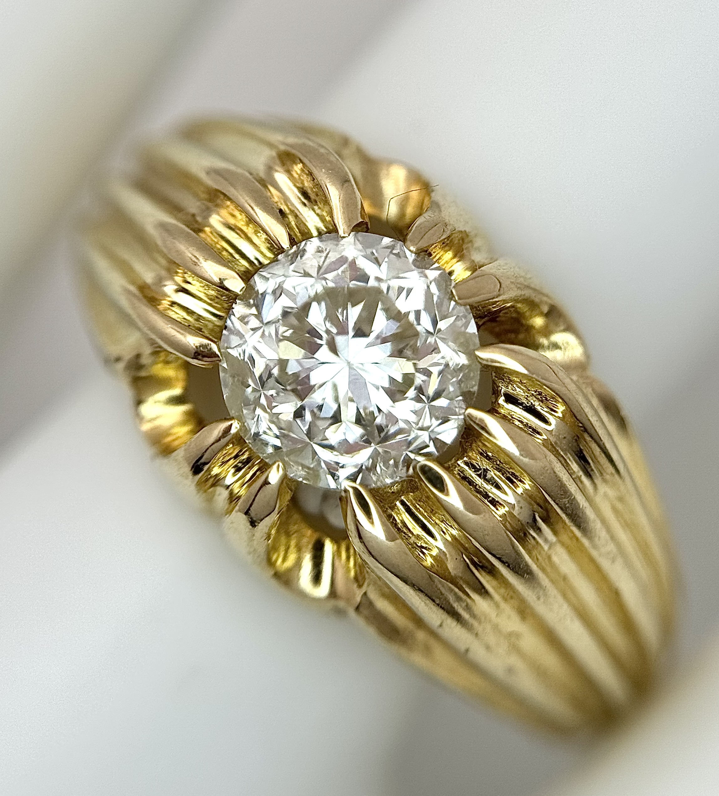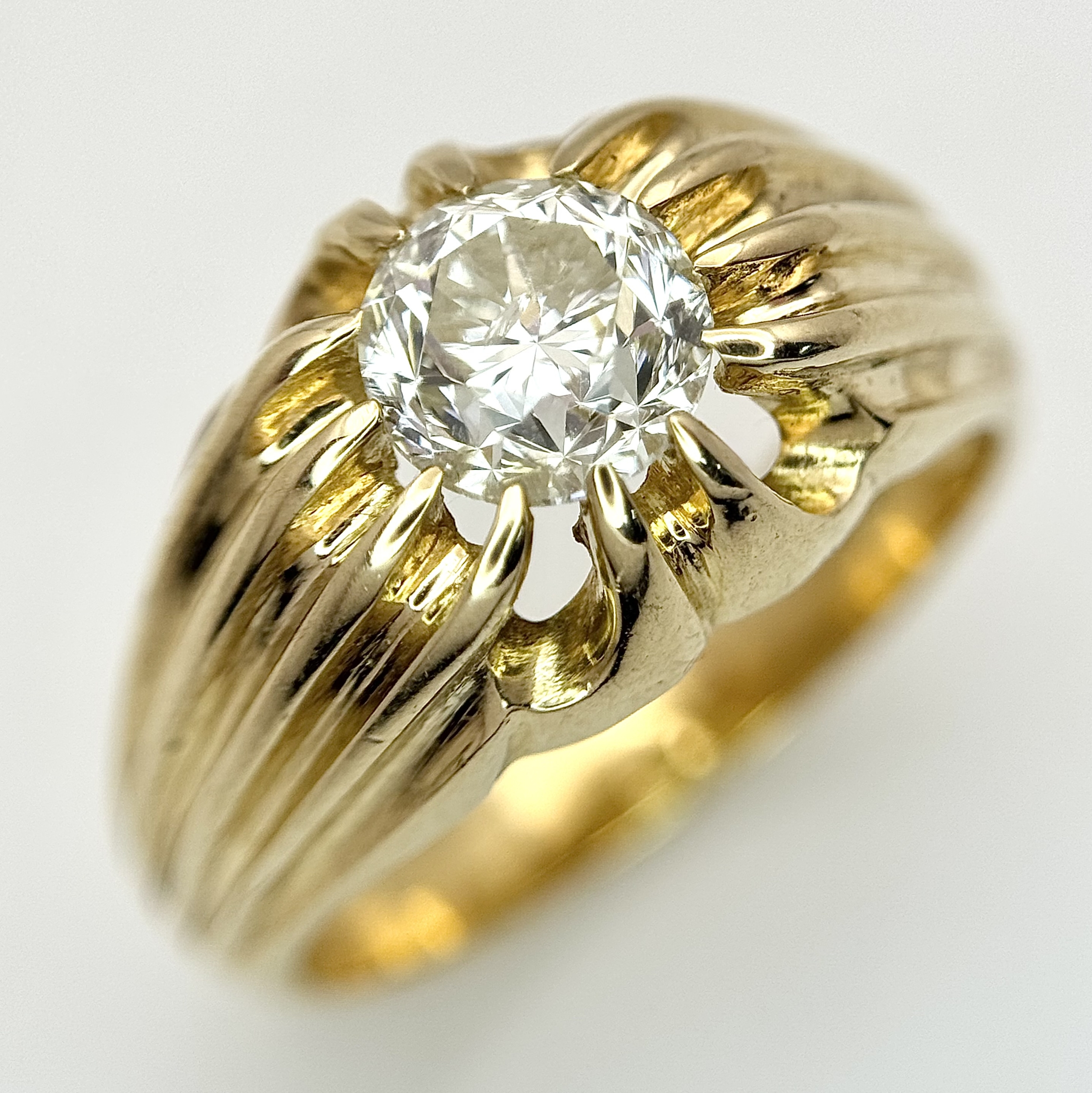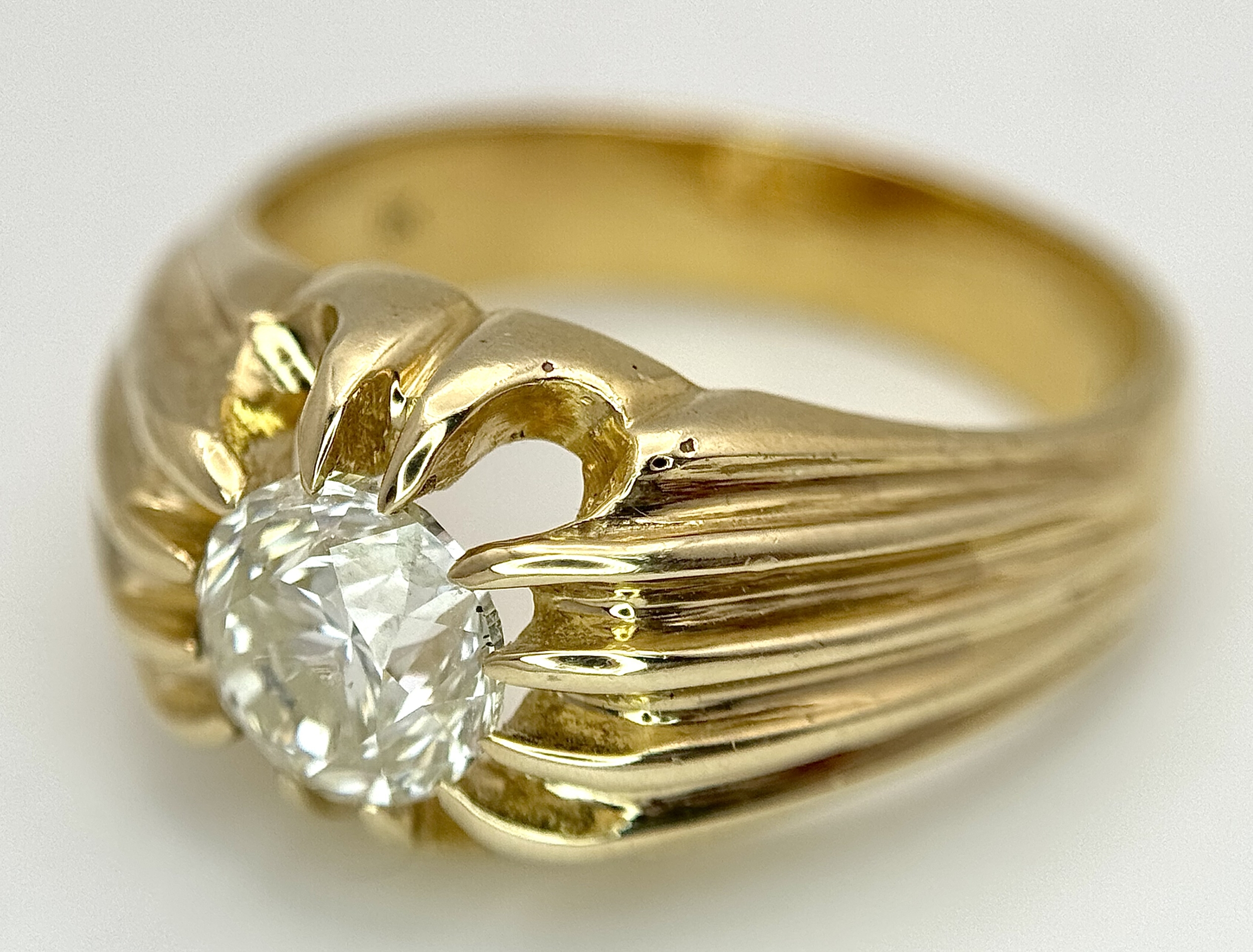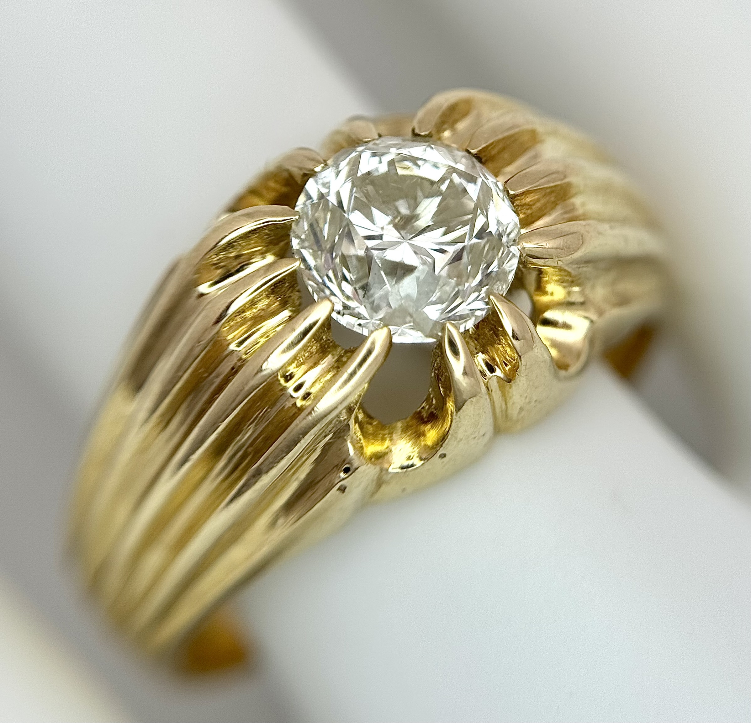 A 9K YELLOW GOLD, GYPSY SET, OLD CUT DIAMOND, SINGLE STONE RING. 1.50CTW APPROX. 6.8G, SIZE T. SPSA 1029