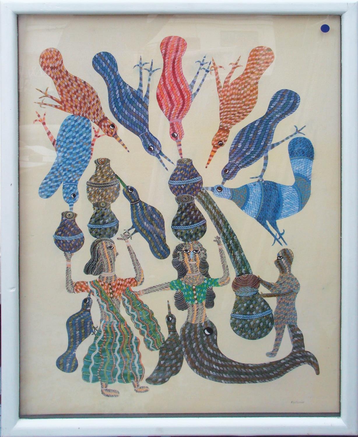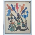 CONTEMPORARY INDIAN SCHOOL 'Lady surrounded by a Siren and Birds', acrylic on canvas, signed lower right, 92cm 66cm, framed.