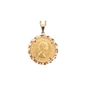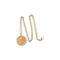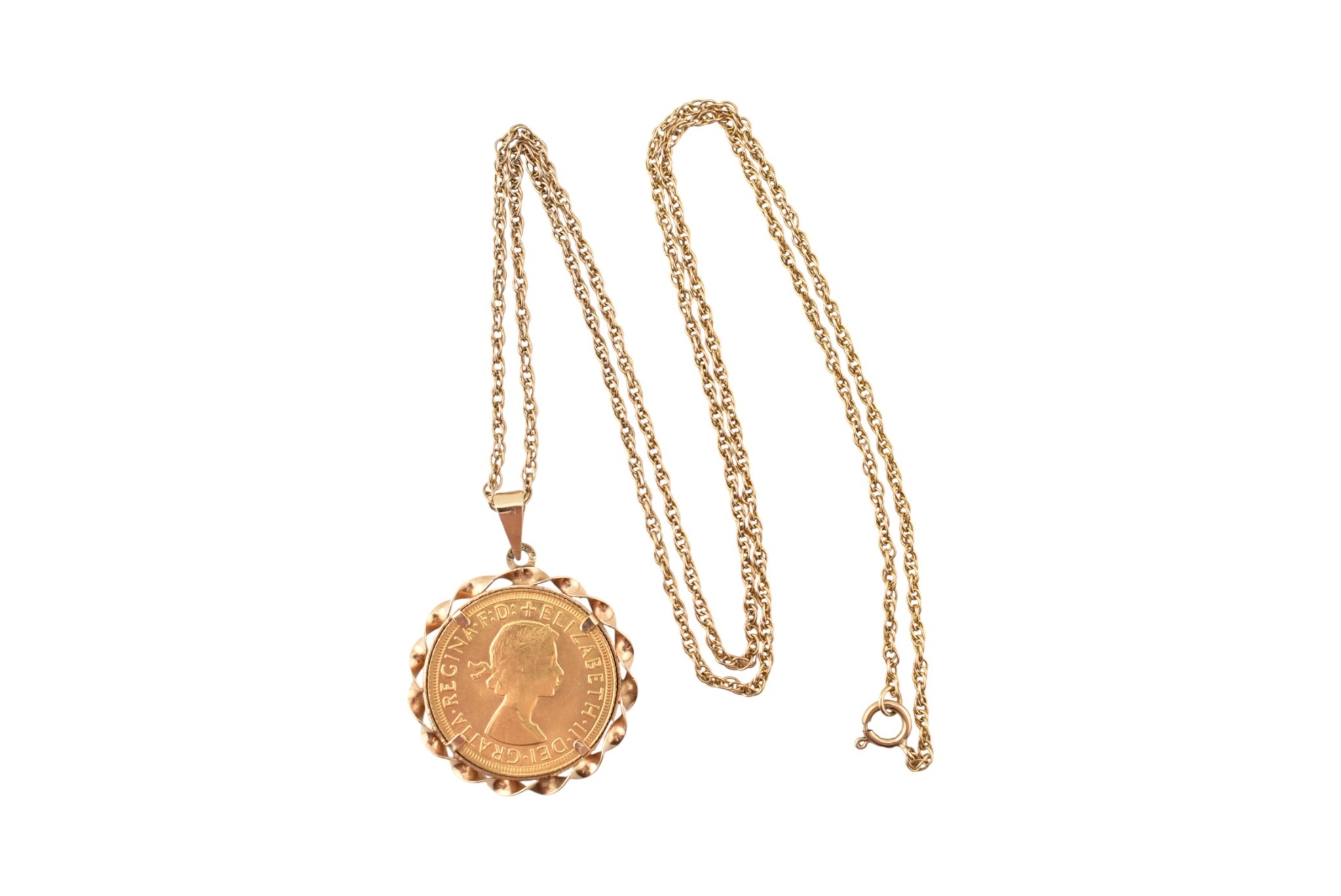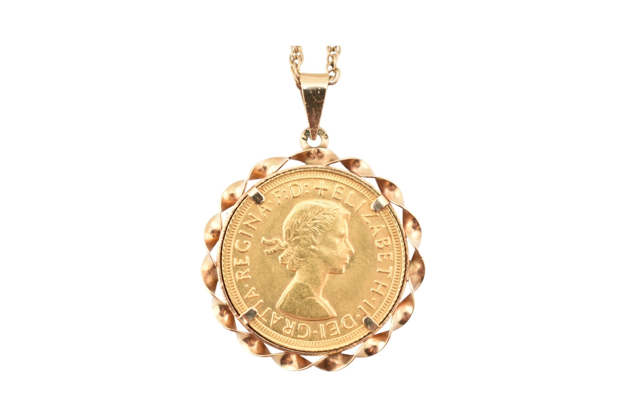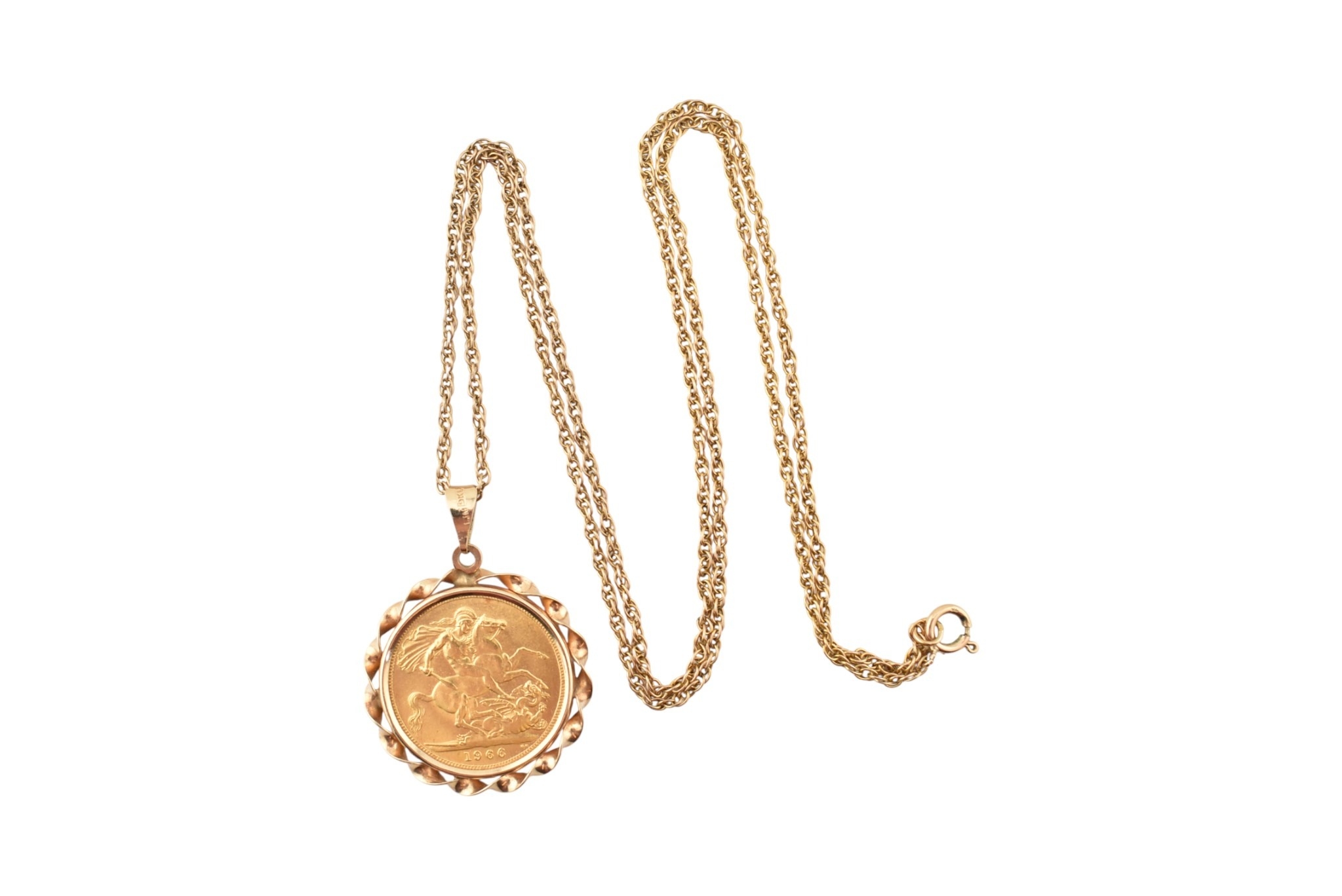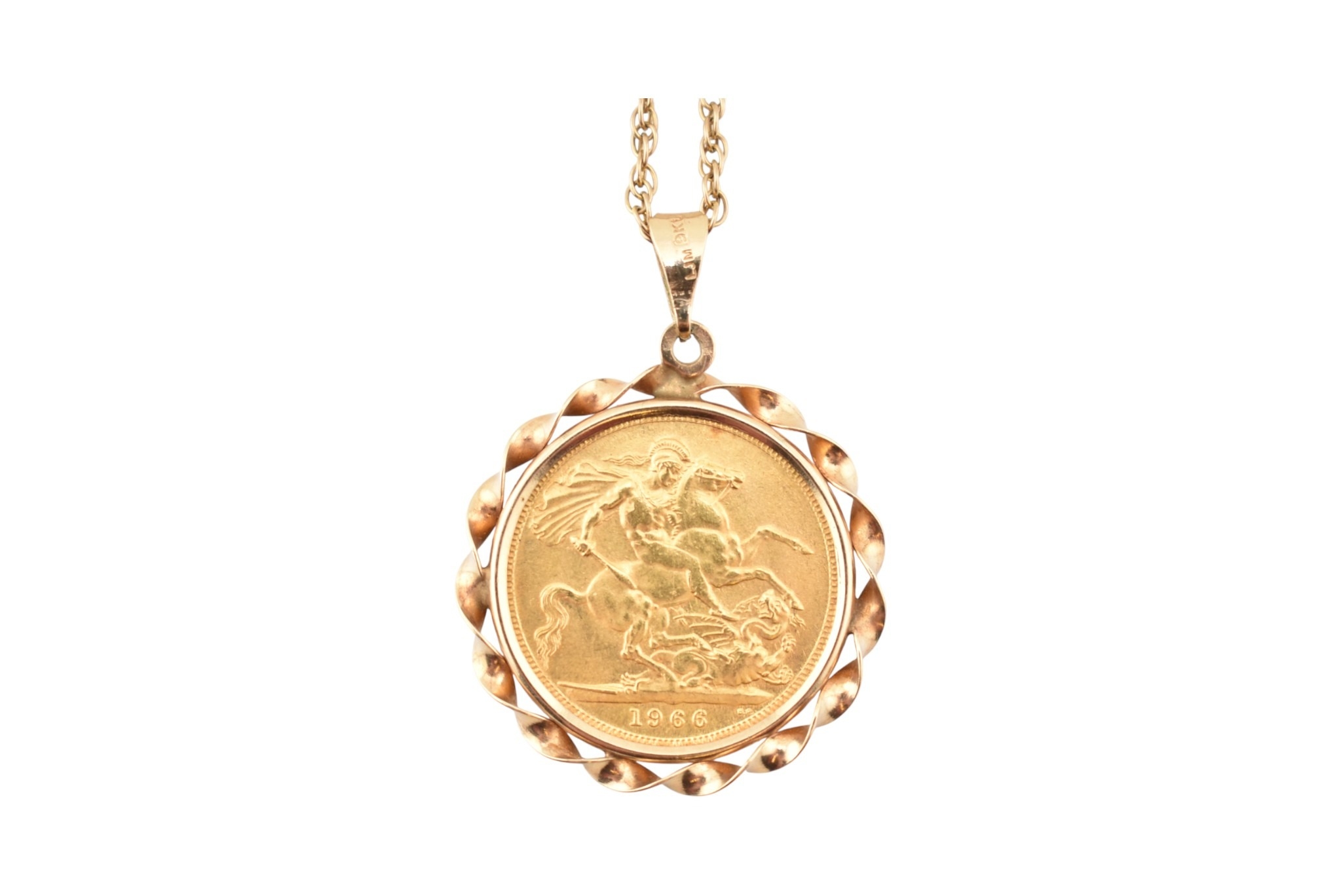 An Elizabeth II sovereign mounted pendant and necklace chain. The sovereign dated to 1966. Weight of coin 7.98g Chain stamped 9k. Weight 13.1g. Chain measures 56cm