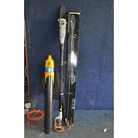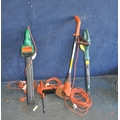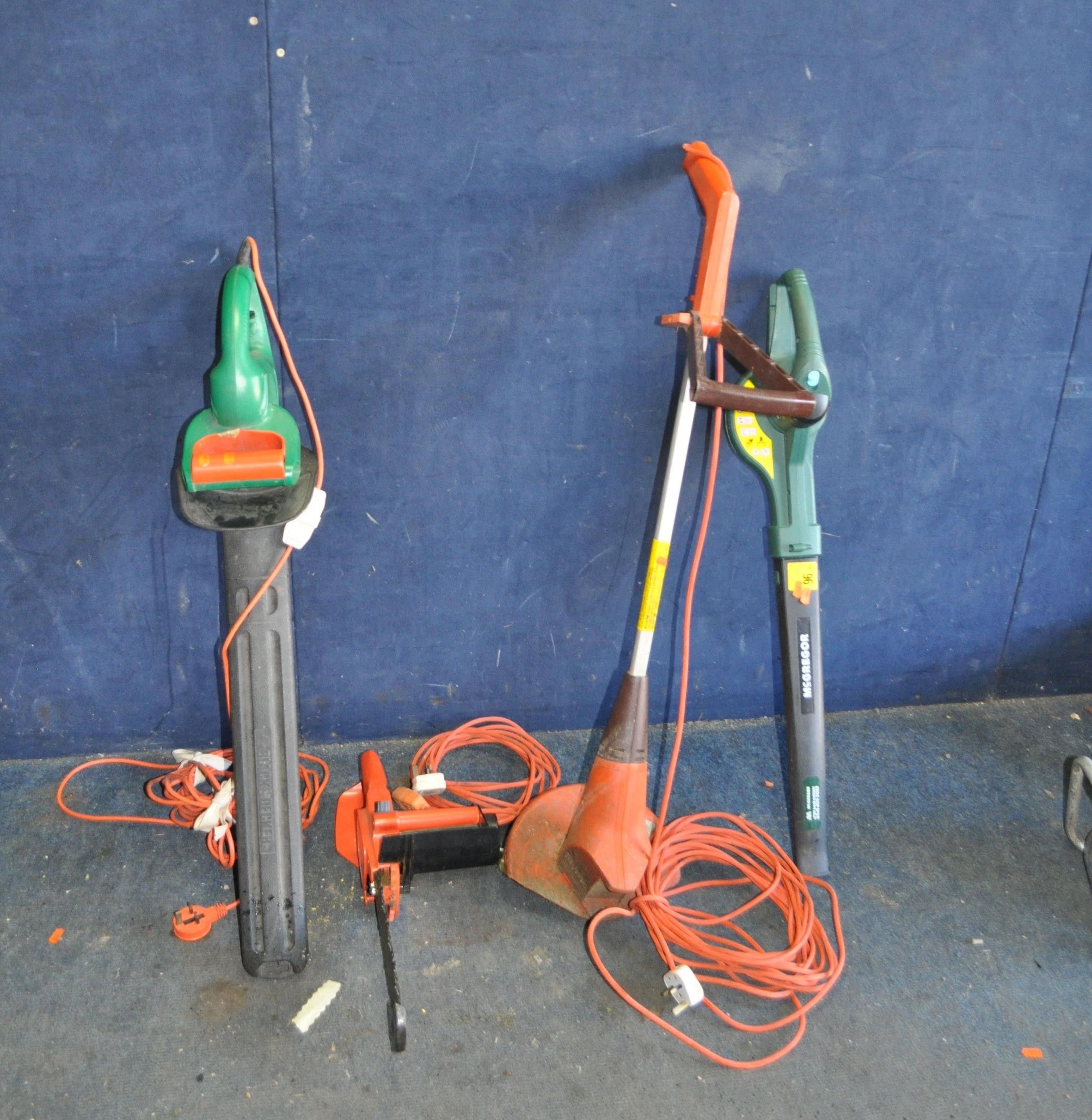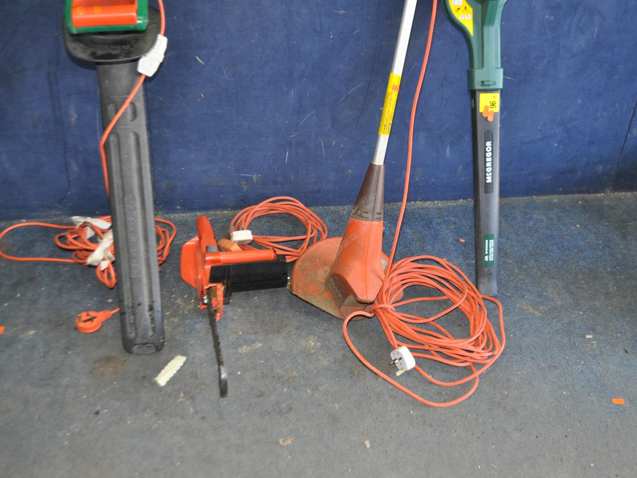 FOUR ELECTRIC GARDENING TOOLS comprising of a Black and Decker hedge trimmer (PAT pass and working), a vintage Remington chain saw, a Flymo Strimmer (both PAT fail due to uninsulated or broken plugs) and a MacGregor cordless blower (no battery or charger)(4)