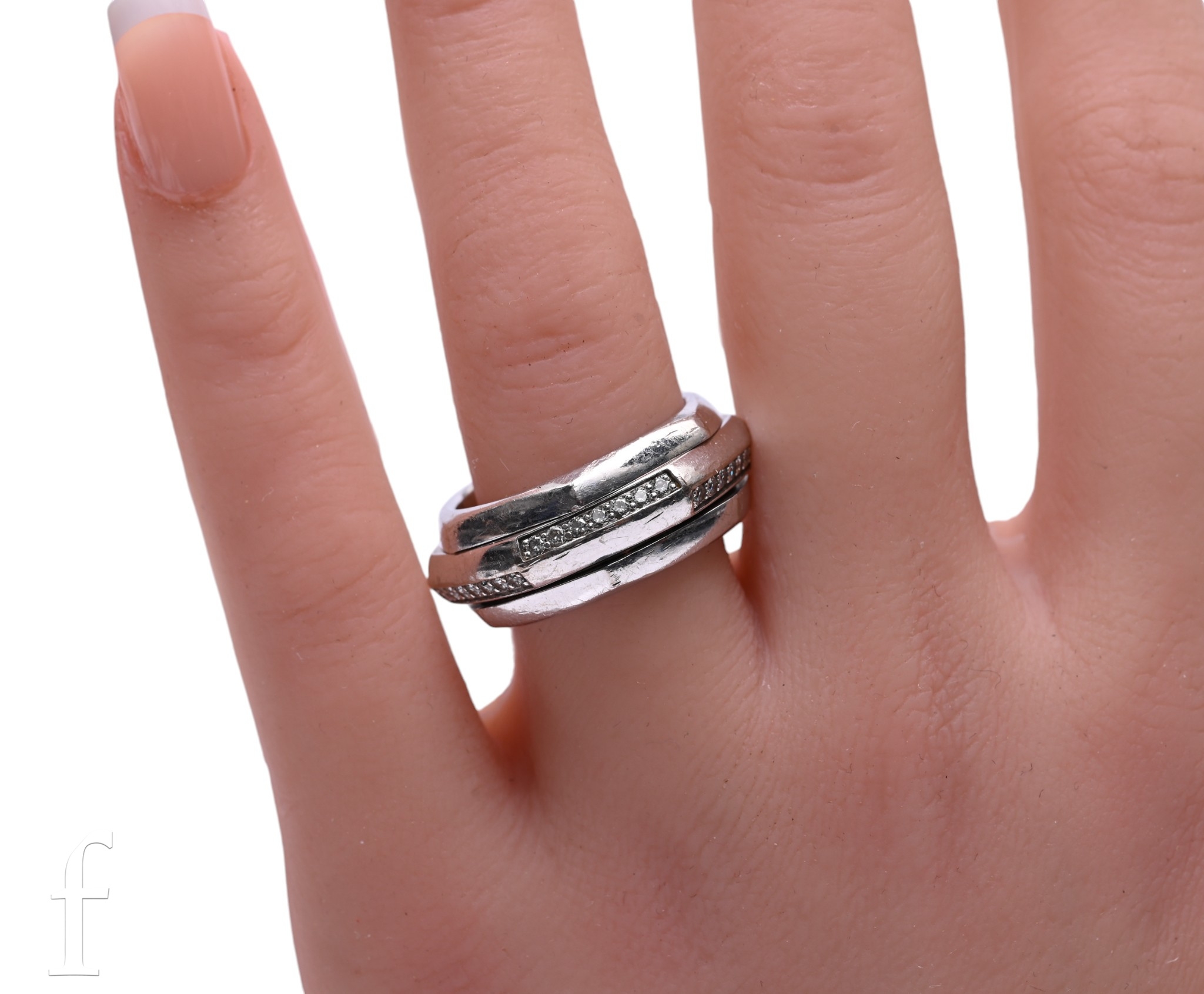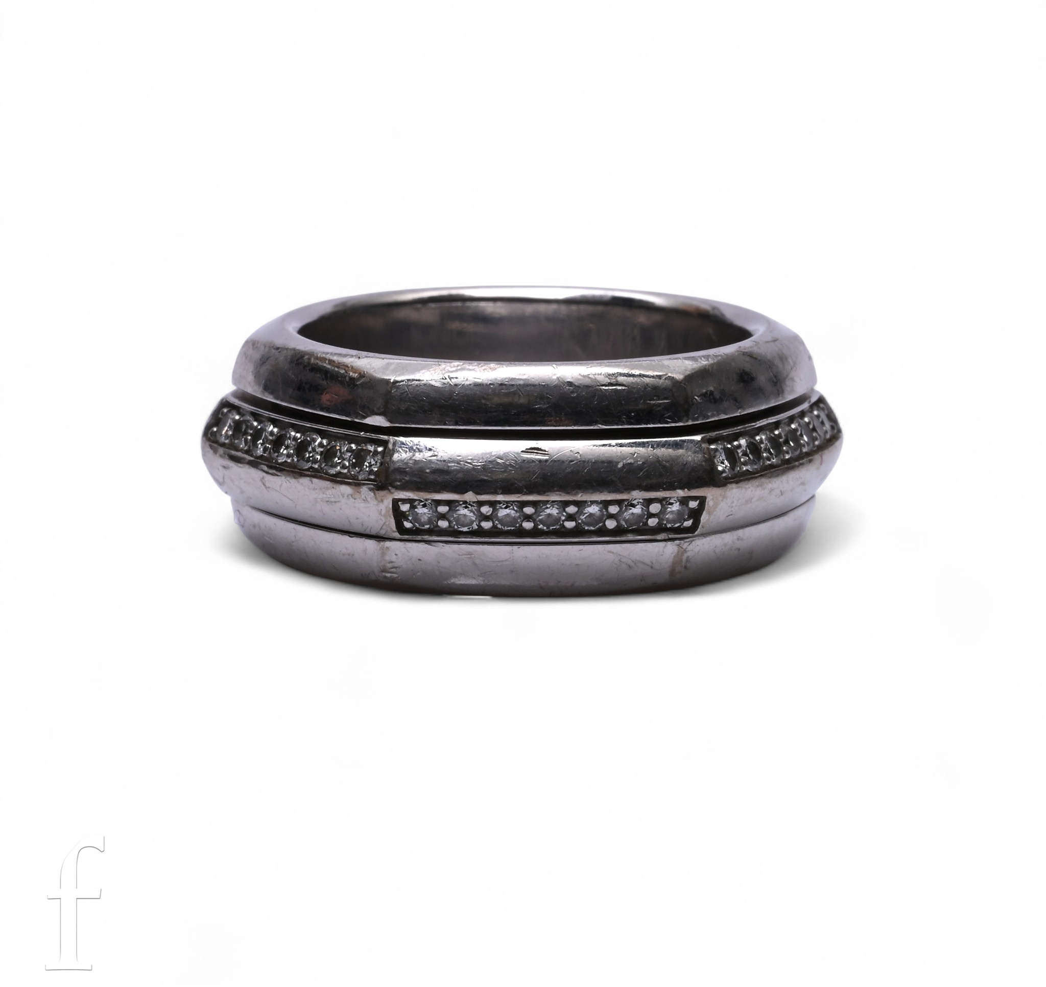 Piaget; A diamond and white gold ring, of hexagonal shape, the central swivel section set throughout with brilliant-cut diamonds, marked 'PIAGET', '750' 'A97593' '56', total weight 19.9g, ring size O.