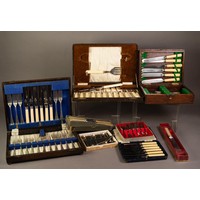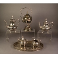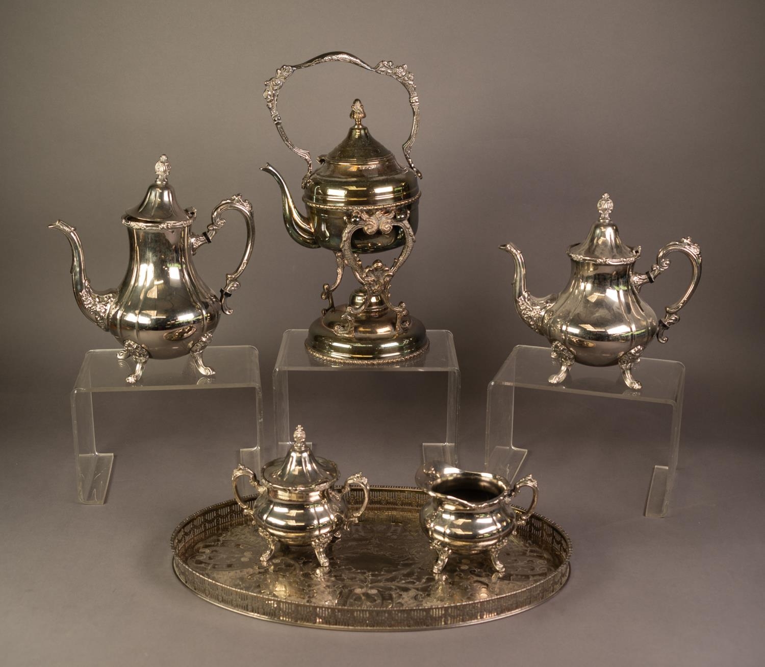 HOUSE OF FRAZER FOUR PIECE ELECTROPLATED TEA AND COFFEE SET, of baluster form with ornate scroll handles, cast finials and scroll supports, together with an ELECTROPLATED SPIRIT KETTLE ON STAND, cover a/f, and an OVAL GALLERIED TRAY with scroll chased centre and embossed garlands to the gallery, 17 ½” x 11 ¼” (44.4cm x 28.6cm), (6)