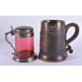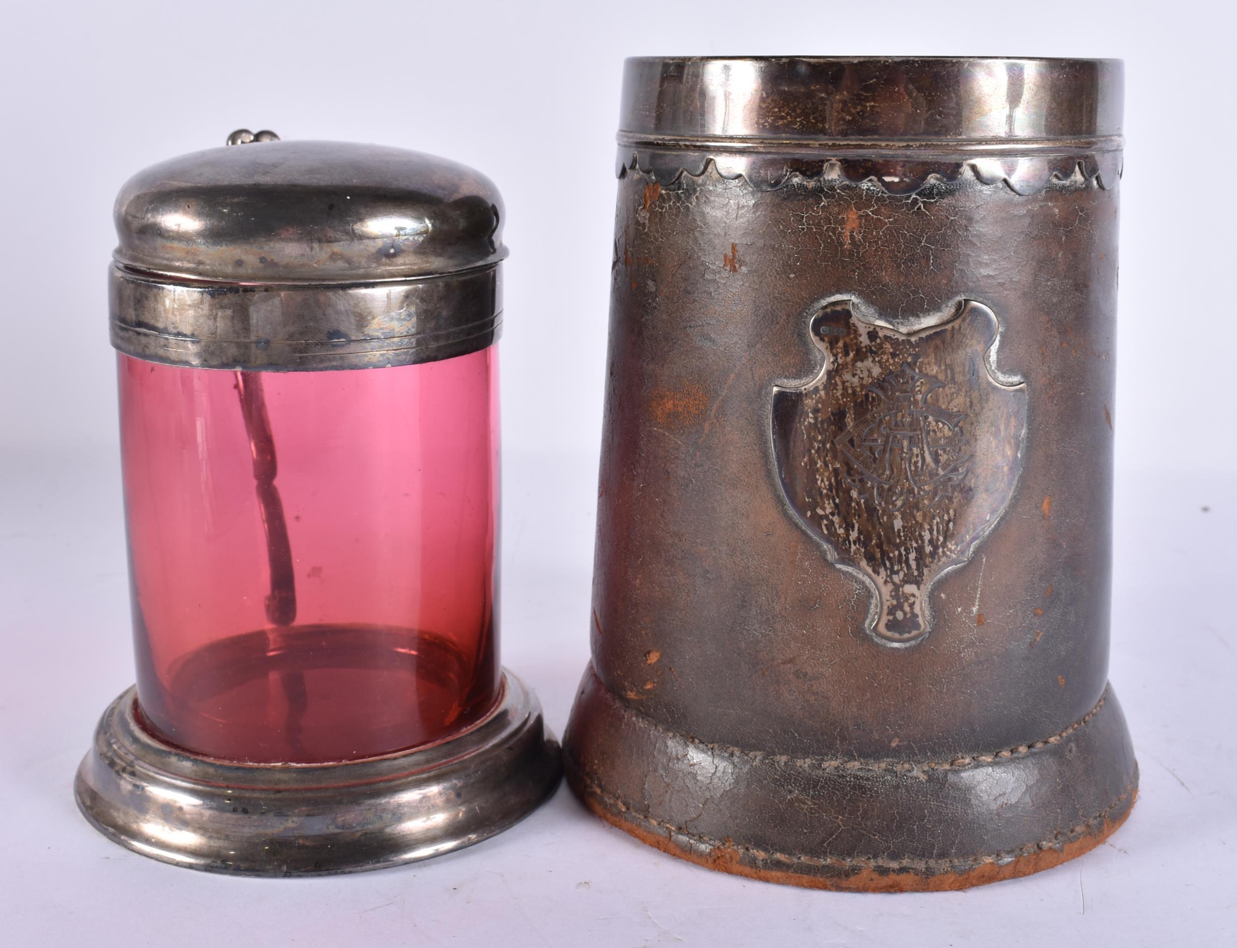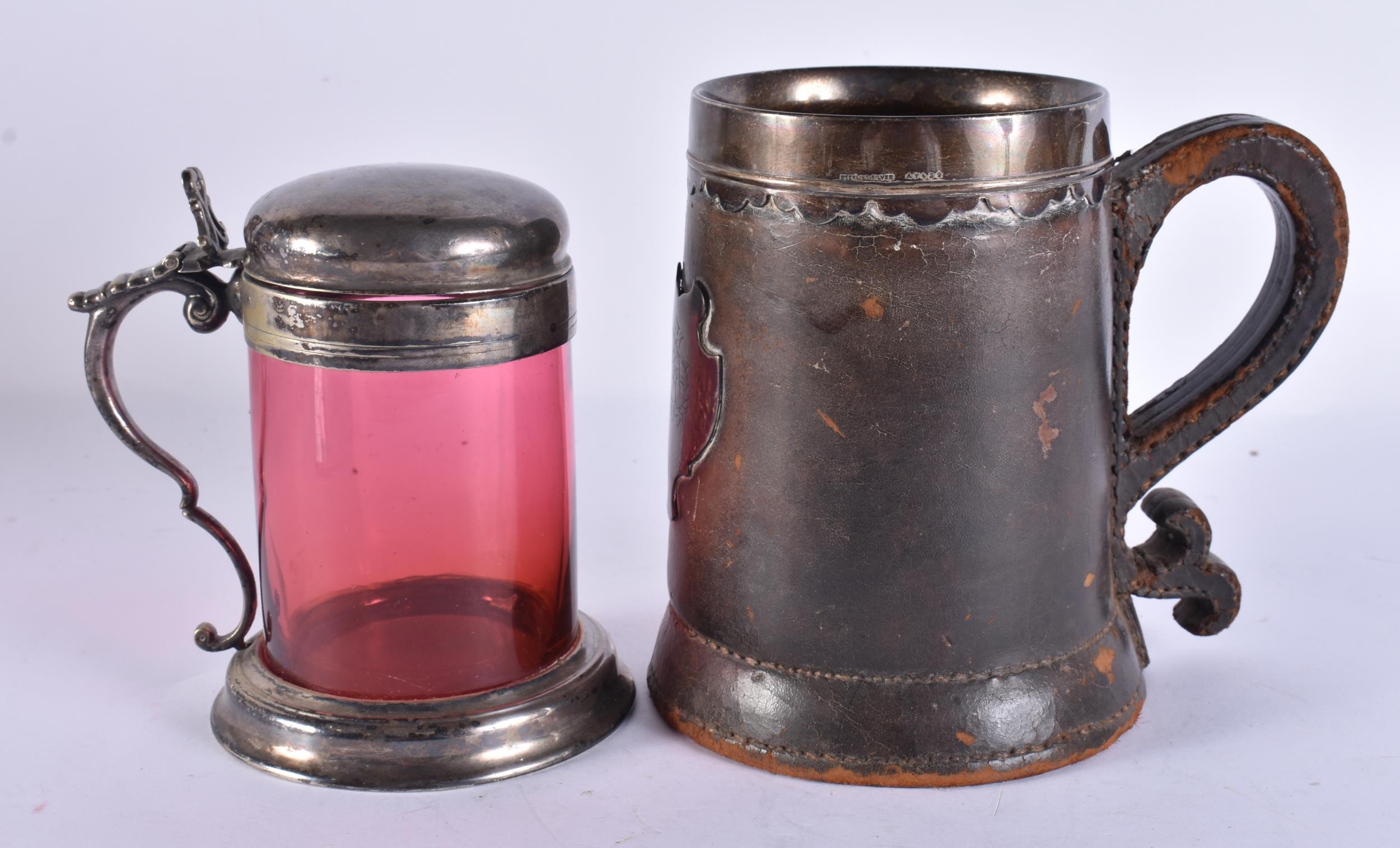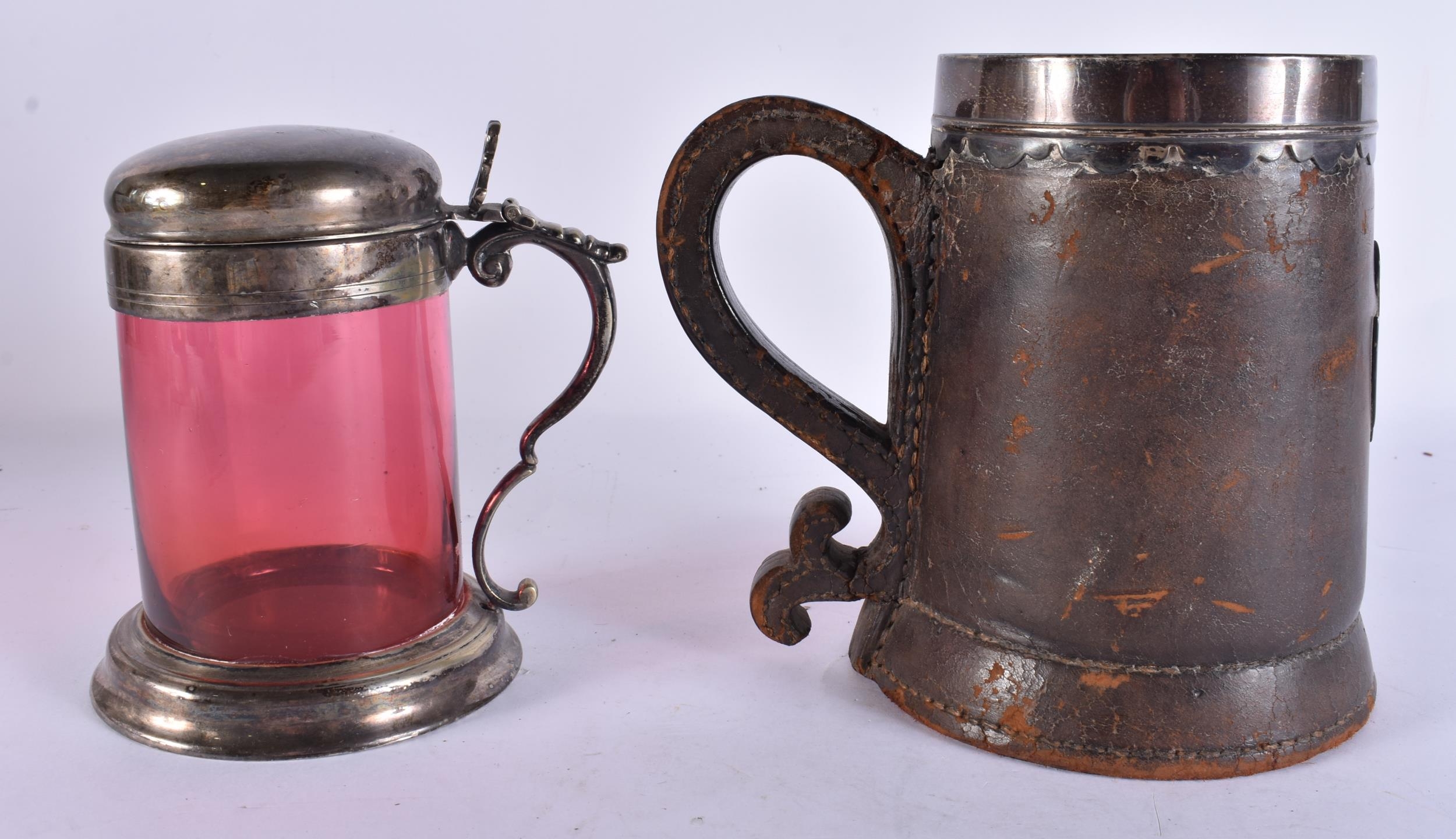 AN ANTIQUE SILVER MOUNTED LEATHER TANKARD together with a smaller silver plated ruby glass tankard. Largest 16 cm x 16 cm. (2)