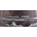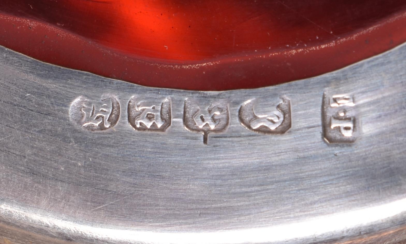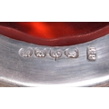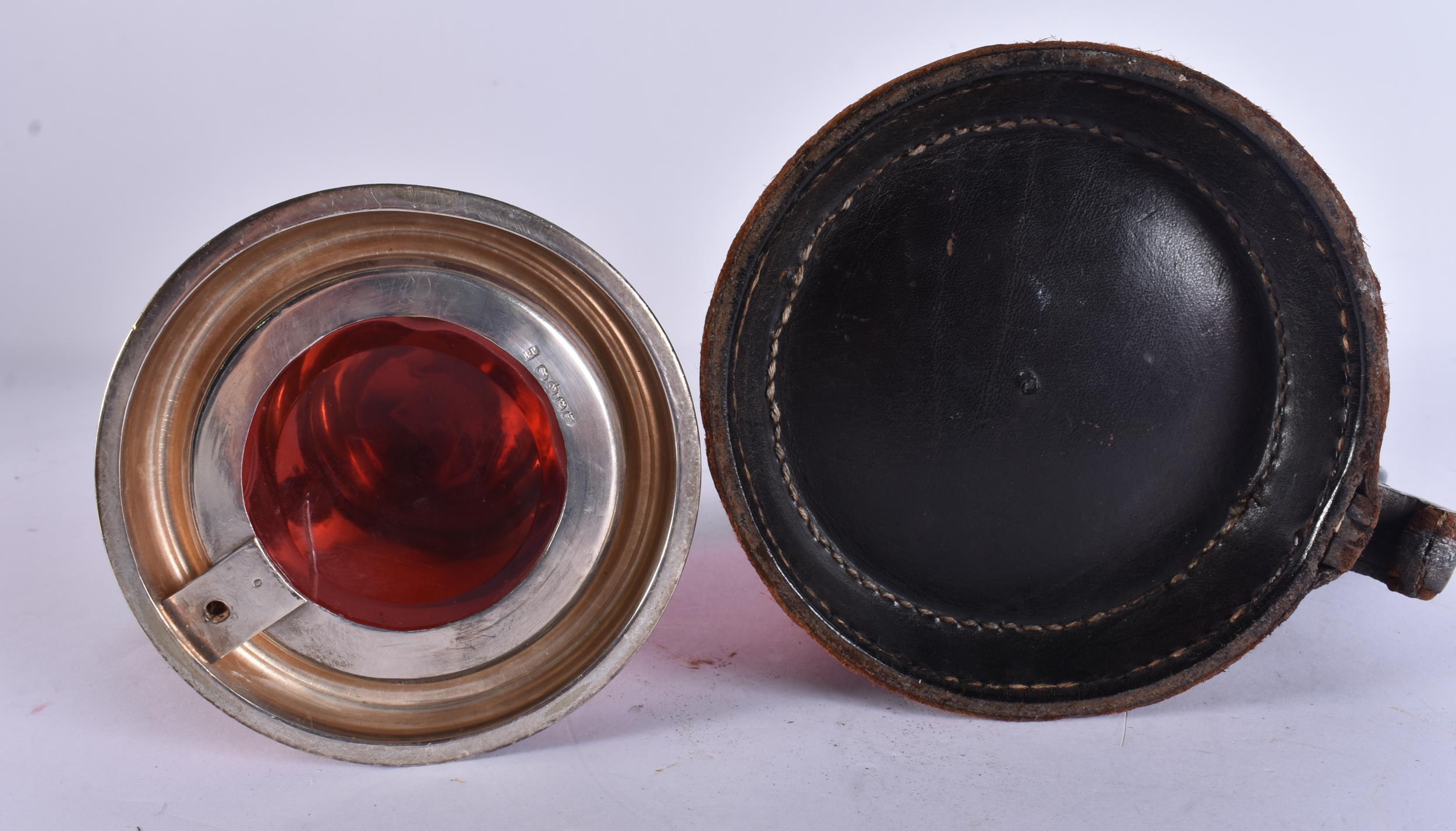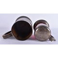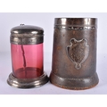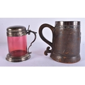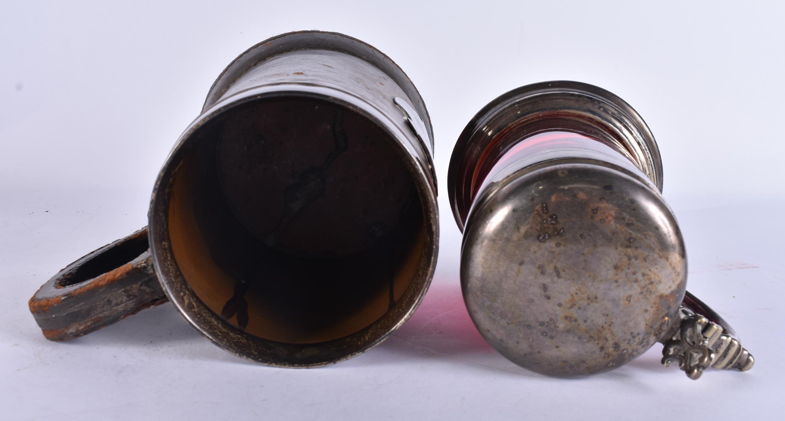 AN ANTIQUE SILVER MOUNTED LEATHER TANKARD together with a smaller silver plated ruby glass tankard. Largest 16 cm x 16 cm. (2)