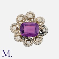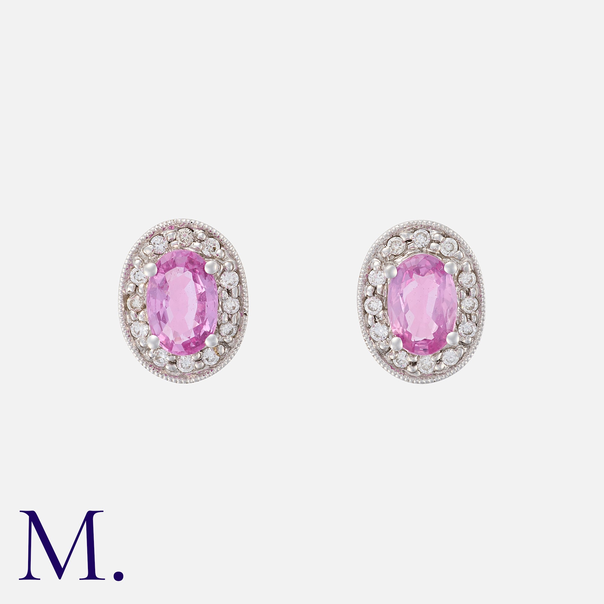 A Pair of Pink Sapphire and Diamond Earrings in 18K white gold, each set with an oval cut pink sapphire (approx. 6x4mm) with diamond accents in surround. Stamped '750' and tests indicate 18ct gold.