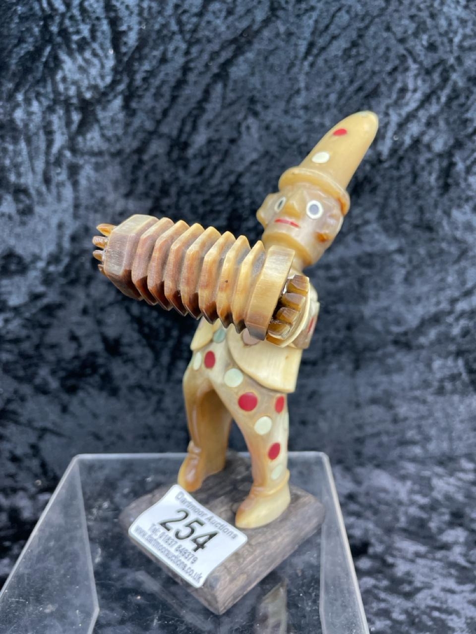 Charming vintage jester/clown figurine playing an accordian, made from bone. Approx H16cm.