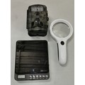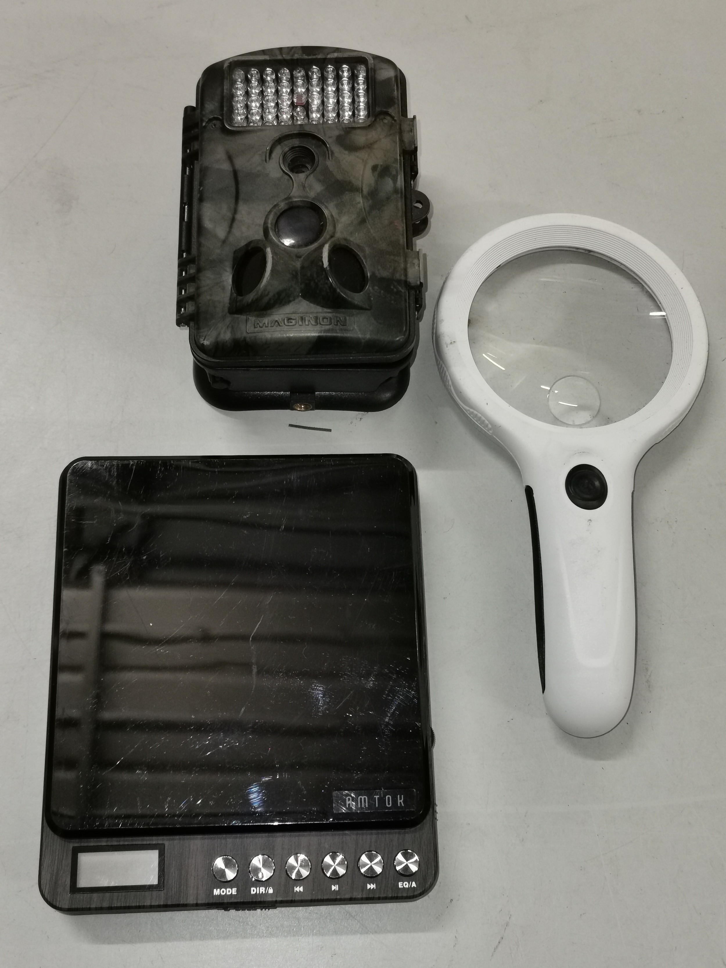 Amtok personal CD player - working, hand held magnifying glass with light & Maginon WK 3 HD wildlife camera - untested