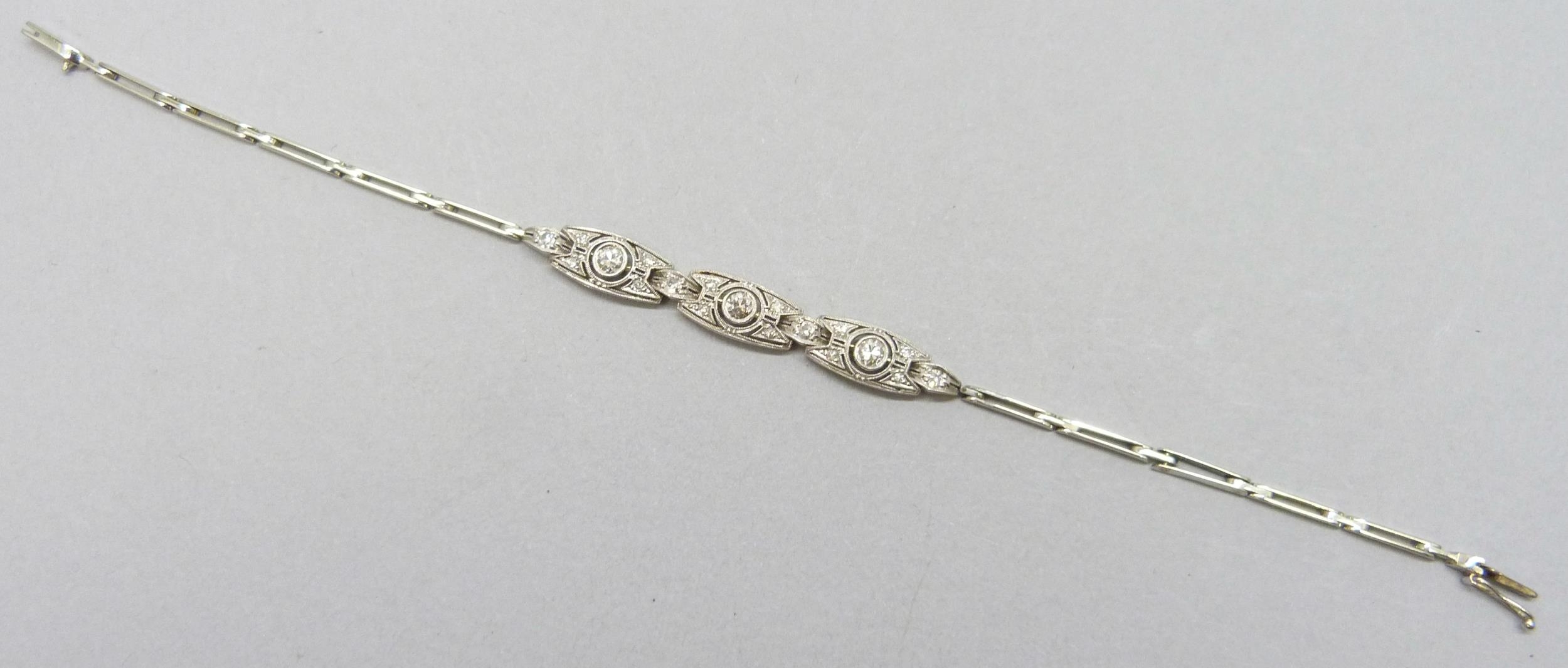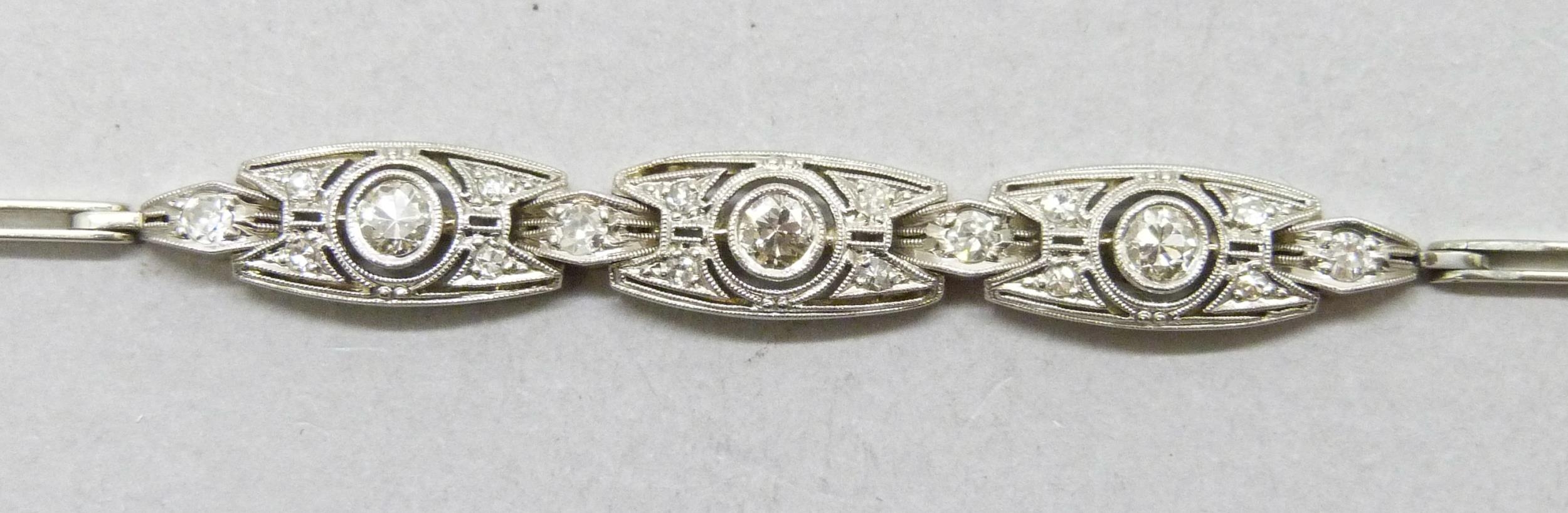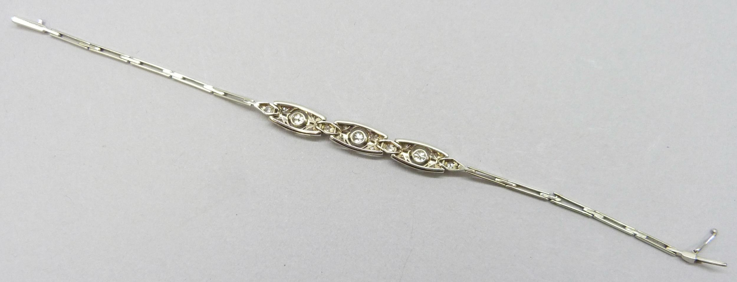 An Art Deco white metal and diamond bracelet, one link requires attention, 8g, 17.3cm