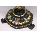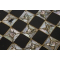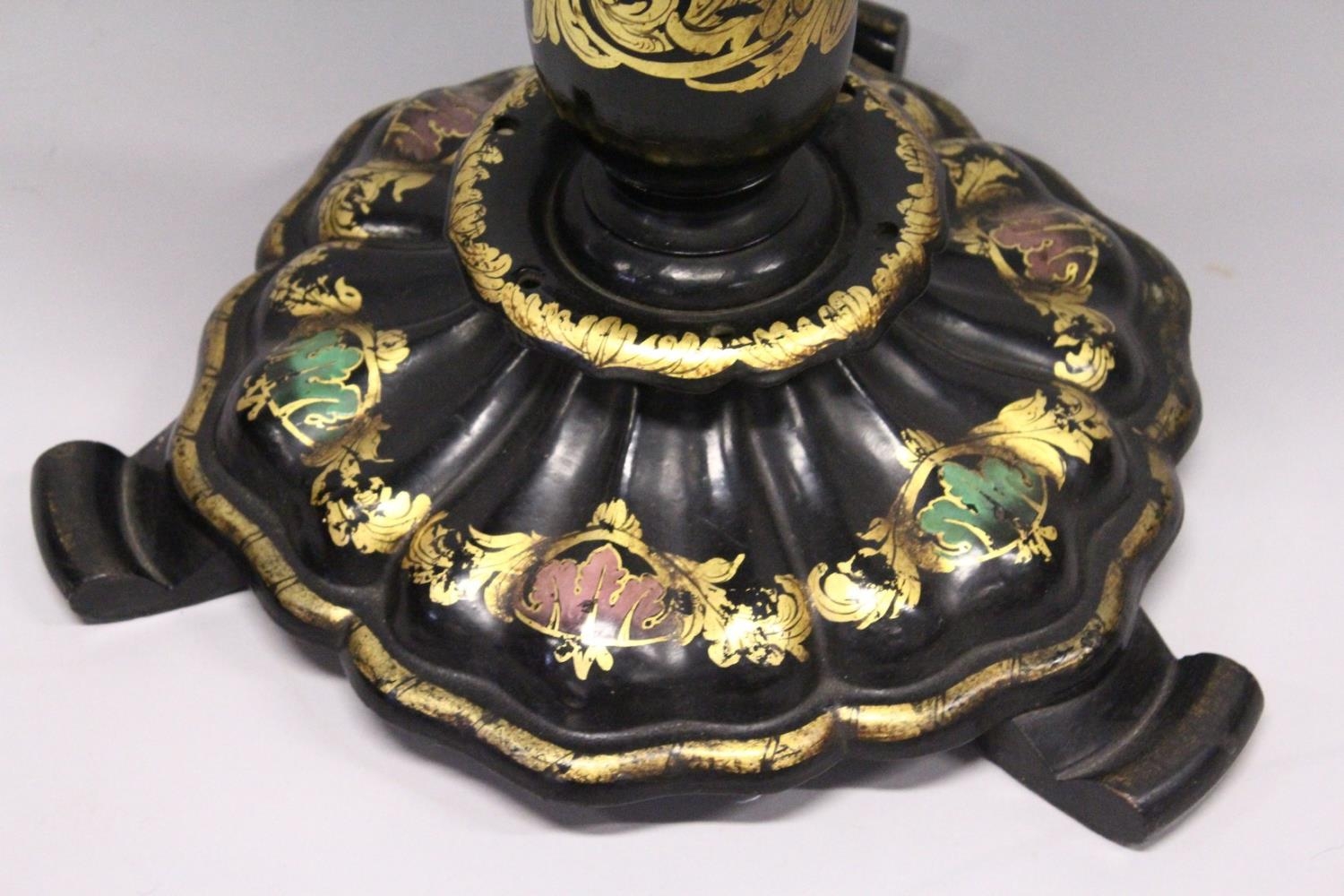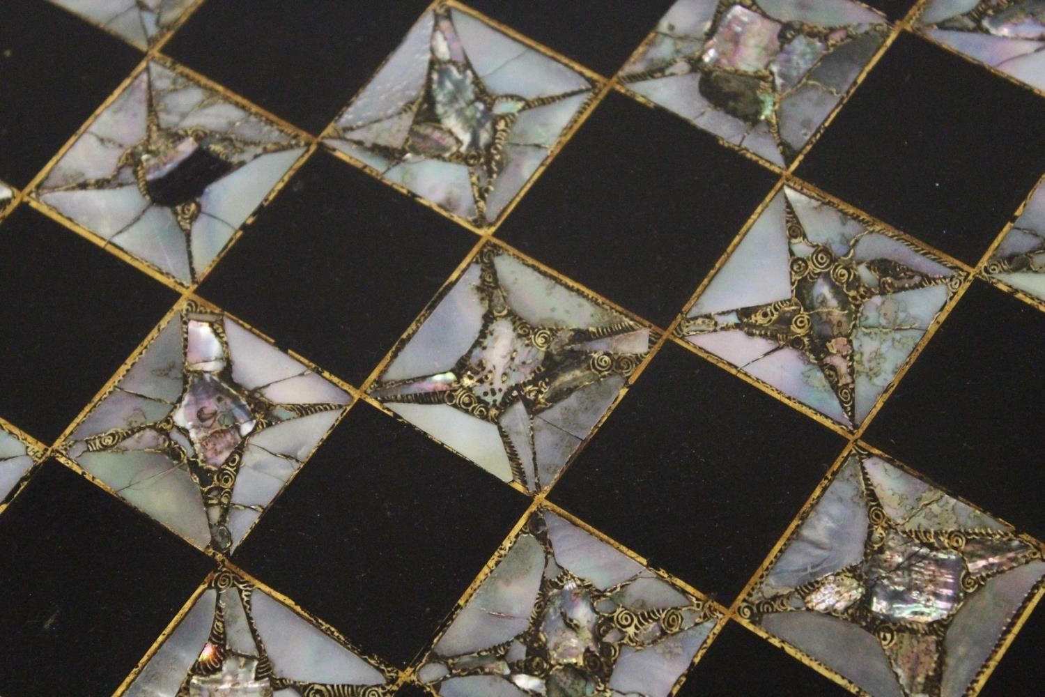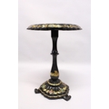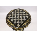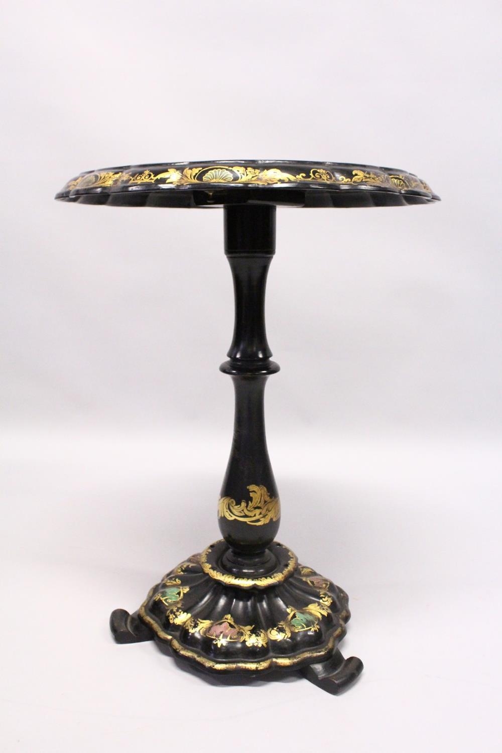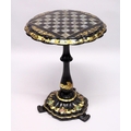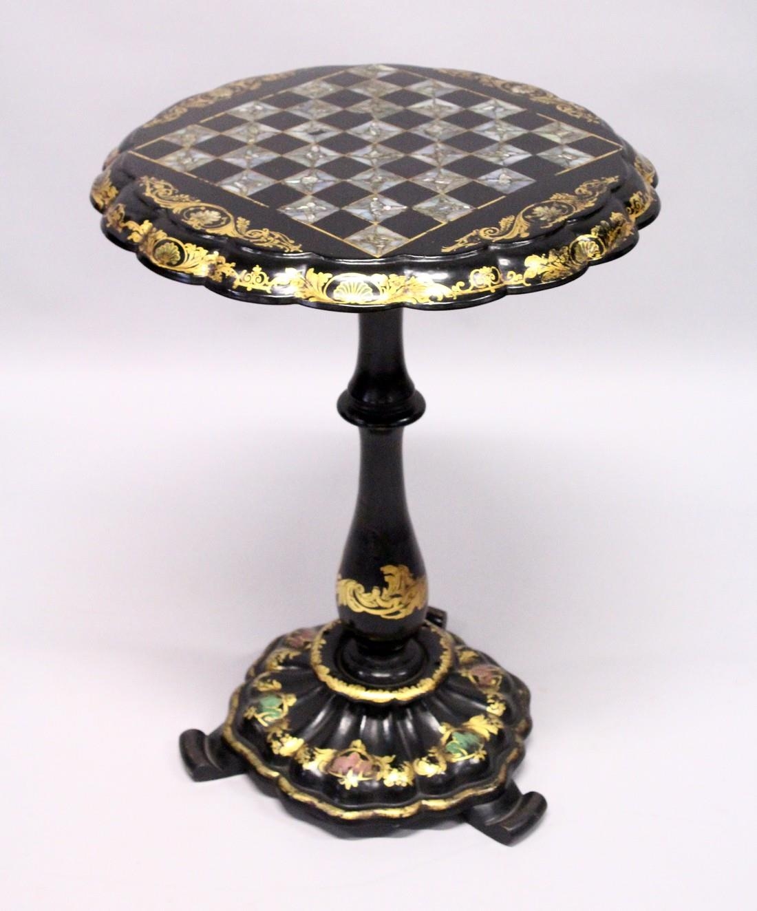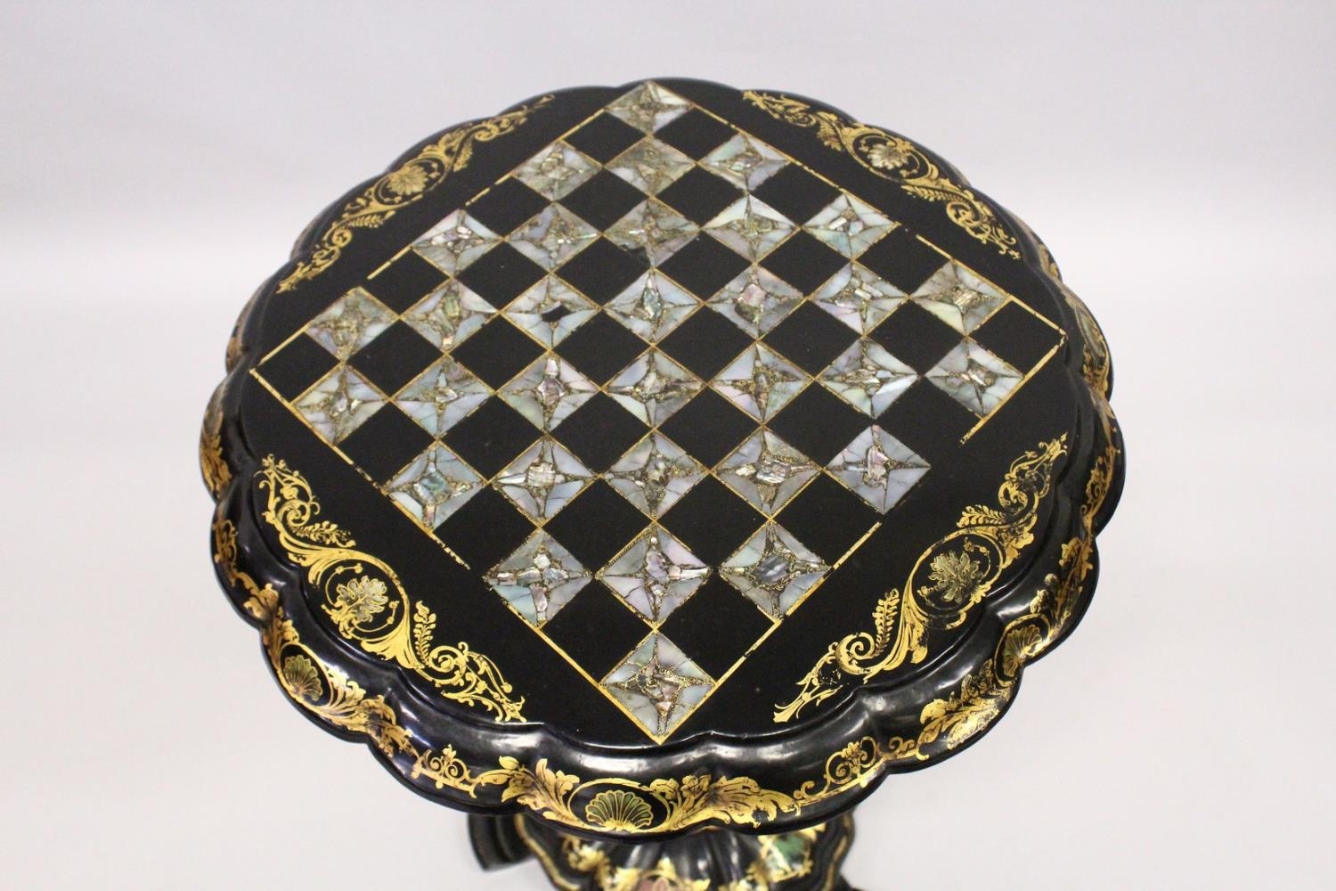 A VICTORIAN BLACK AND GILT PAPIER MACHE TILT TOP GAMES TABLE, with inlaid chess board in mother of pearl.