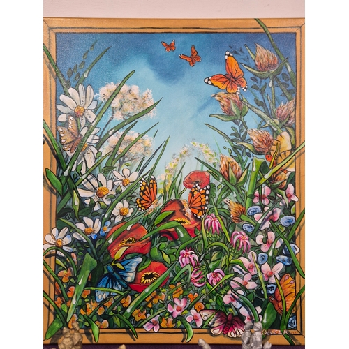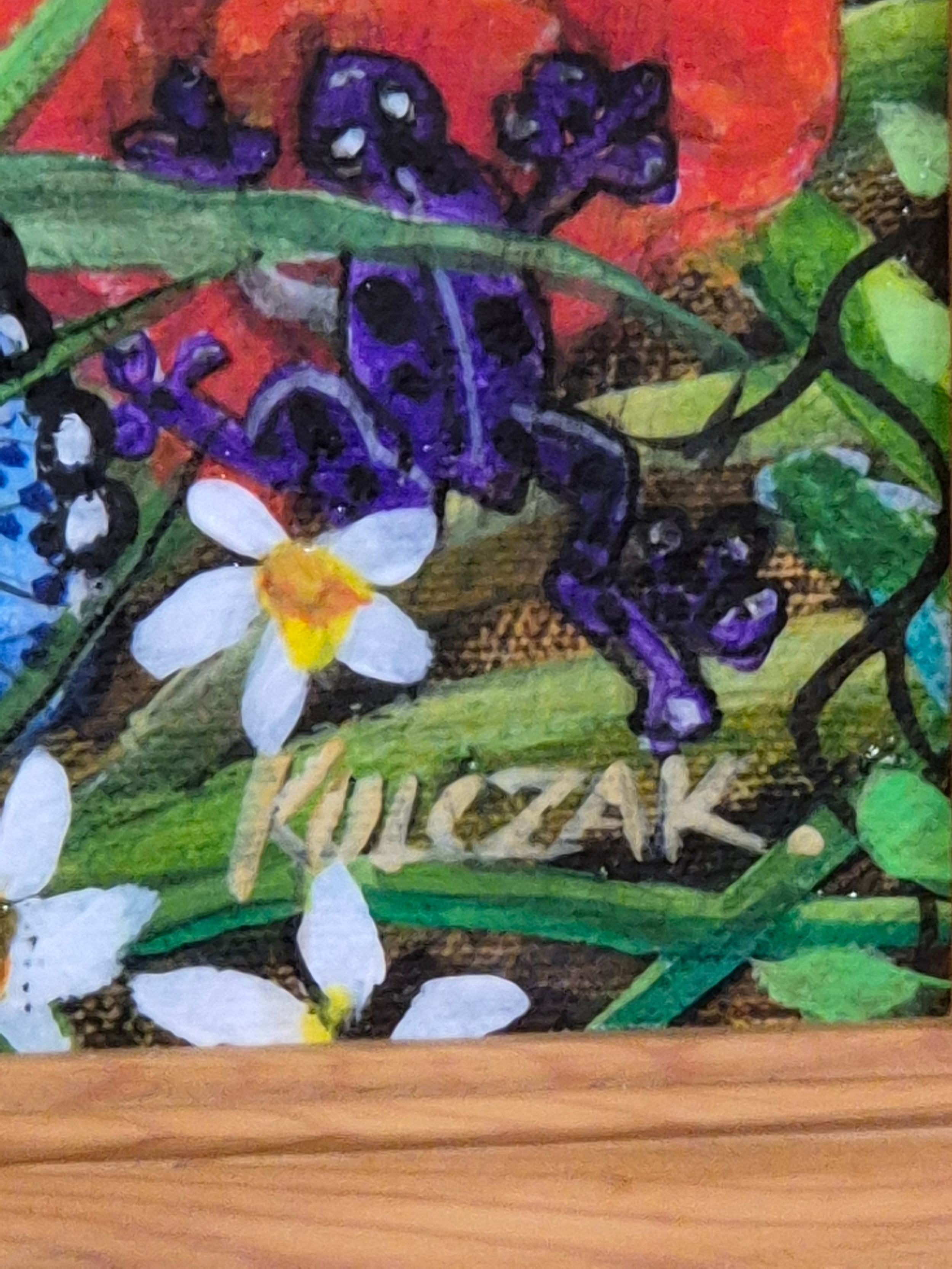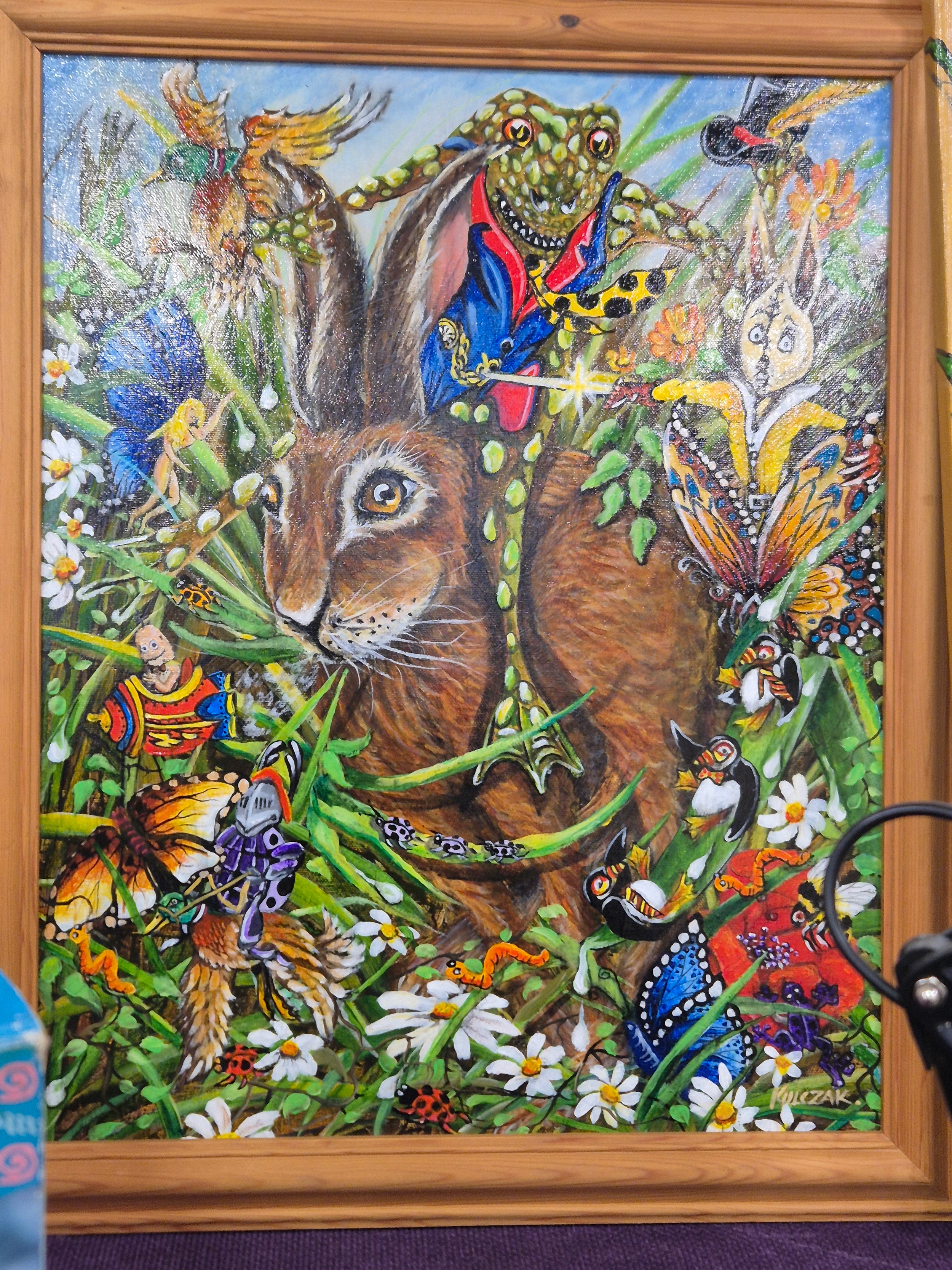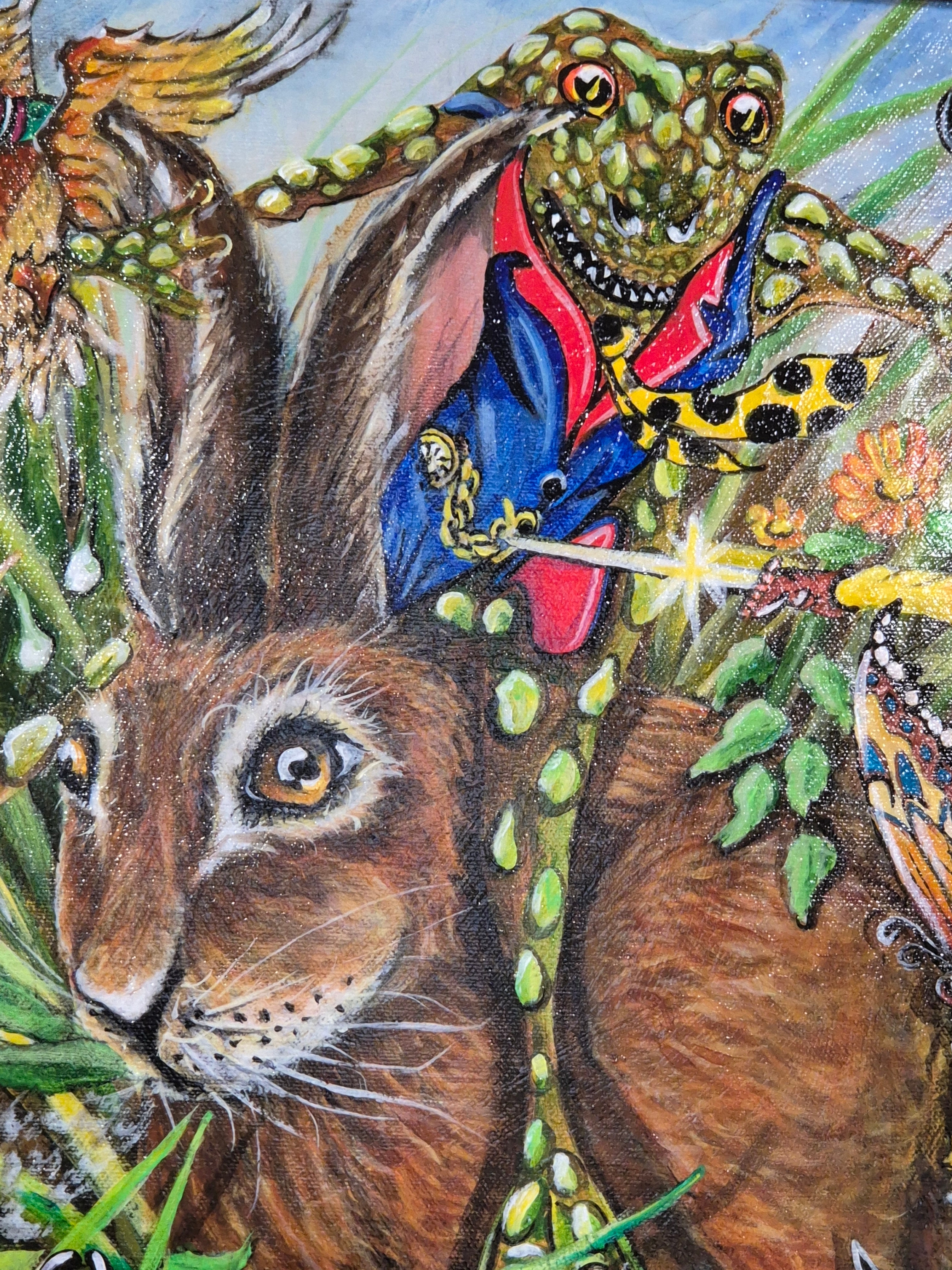 Original acrylic painting 'Hare and Frog Racing in Meadow' by Kulczak 23" x 19"