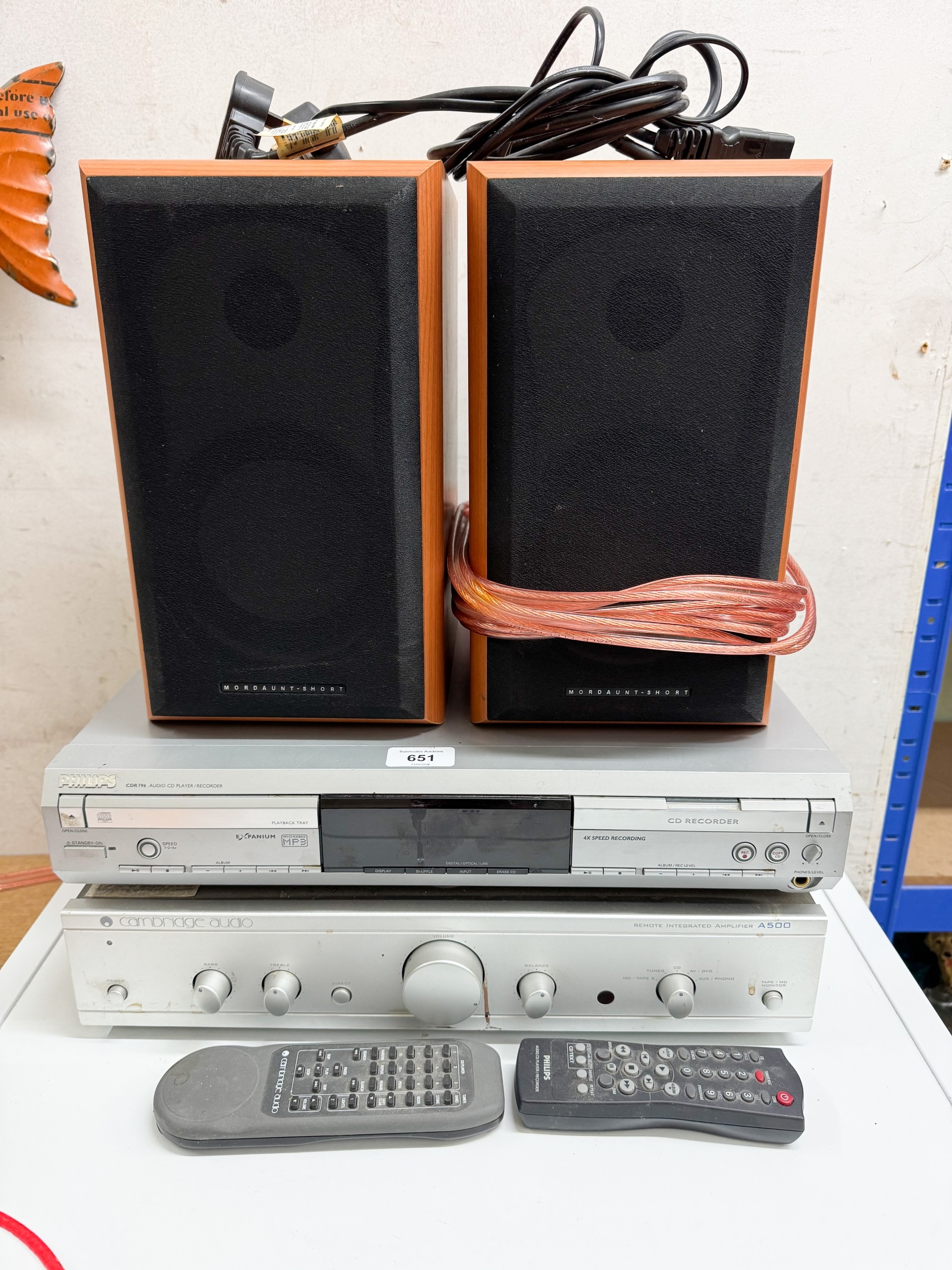A Phillips audio CD player/recorder together with a Cambridge audio remote integrated amplifier and a pair of Mordaunt-Short speakers